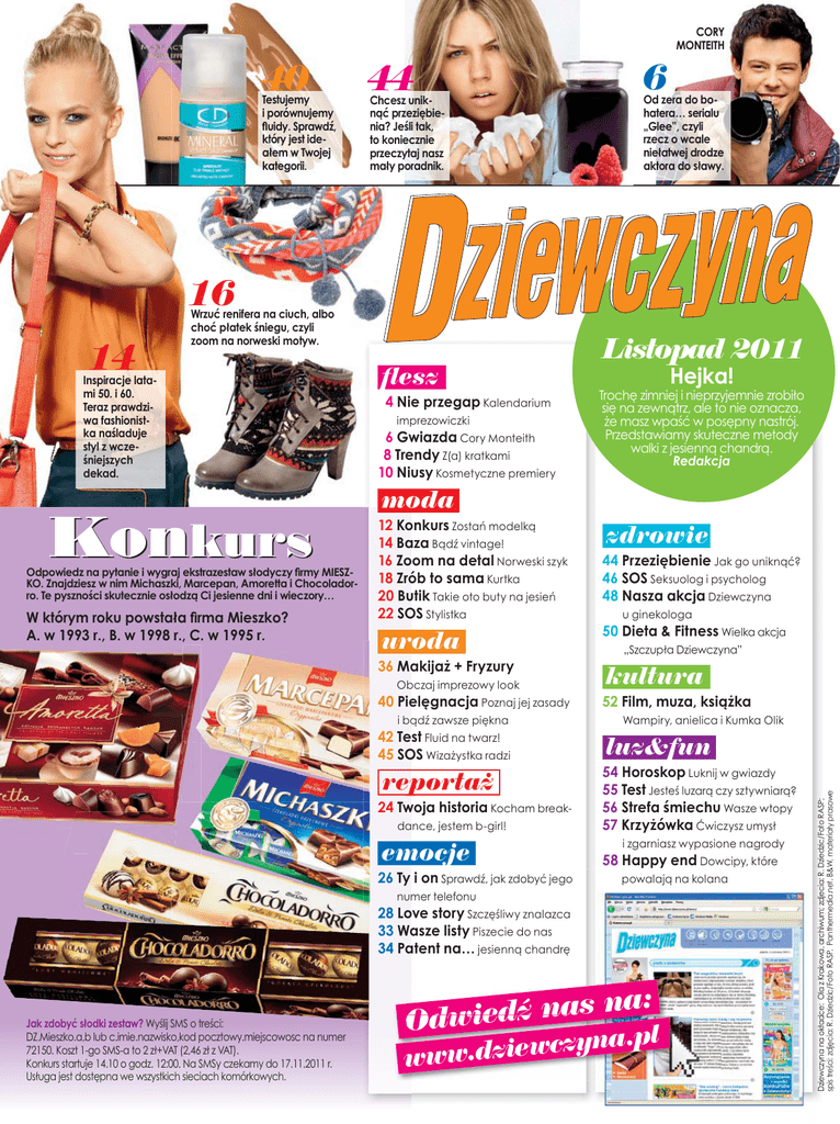 CORY MONTEITH Testujemy i porównujemy fluidy. Sprawdź, który jest ideałem w Twojej kategorii. Chcesz uniknąć przeziębienia? Jeśli tak, to koniecznie przeczytaj nasz mały poradnik. # Od zera do bohatera… serialu „Glee”, czyli rzecz o wcale niełatwej drodze aktora do sławy. # Inspiracje latami 50. i 60. Teraz prawdziwa fashionistka naśladuje styl z wcześniejszych dekad. Konkurs Odpowiedz na pytanie i wygraj ekstrazestaw słodyczy firmy MIESZKO. Znajdziesz w nim Michaszki, Marcepan, Amoretta i Chocoladorro. Te pyszności skutecznie osłodzą Ci jesienne dni i wieczory… W którym roku powstała firma Mieszko? A. w 1993 r., B. w 1998 r., C. w 1995 r. 4 Nie przegap Kalendarium imprezowiczki 6 Gwiazda Cory Monteith 8 Trendy Z(a) kratkami 10 Niusy Kosmetyczne premiery Hejka! Trochę zimniej i nieprzyjemnie zrobiło się na zewnątrz, ale to nie oznacza, że masz wpaść w posępny nastrój. Przedstawiamy skuteczne metody walki z jesienną chandrą. Redakcja 12 Konkurs Zostań modelką 14 Baza Bądź vintage! 16 Zoom na detal Norweski szyk 18 Zrób to sama Kurtka 20 Butik Takie oto buty na jesień 22 SOS Stylistka 44 Przeziębienie Jak go uniknąć? 46 SOS Seksuolog i psycholog 48 Nasza akcja Dziewczyna u ginekologa 50 Dieta & Fitness Wielka akcja 36 Makijaż + Fryzury Obczaj imprezowy look 40 Pielęgnacja Poznaj jej zasady i bądź zawsze piękna 42 Test Fluid na twarz! 45 SOS Wizażystka radzi 24 Twoja historia Kocham breakdance, jestem b-girl! 26 Ty i on Sprawdź, jak zdobyć jego „Szczupła Dziewczyna” 52 Film, muza, książka Wampiry, anielica i Kumka Olik 54 Horoskop Luknij w gwiazdy 55 Test Jesteś luzarą czy sztywniarą? 56 Strefa śmiechu Wasze wtopy 57 Krzyżówka Ćwiczysz umysł i zgarniasz wypasione nagrody 58 Happy end Dowcipy, które powalają na kolana numer telefonu 28 Love story Szczęśliwy znalazca 33 Wasze listy Piszecie do nas 34 Patent na… jesienną chandrę Jak zdobyć słodki zestaw? Wyślij SMS o treści: DZ.Mieszko.a,b lub c.imie.nazwisko,kod pocztowy.miejscowosc na numer 72150. Koszt 1-go SMS-a to 2 zł+VAT (2,46 zł z VAT). Konkurs startuje 14.10 o godz. 12:00. Na SMSy czekamy do 17.11.2011 r. Usługa jest dostępna we wszystkich sieciach komórkowych. " ! ! Dziewczyna na okładce: Ola z Krakowa, archiwum; zdjecia: R. Dziedzic/Foto RASP; B&W, materiały prasowe spis treści: zdjęcia: R. Dziedzic/Foto RASP, Panthermedia.net, B& Wrzuć renifera na ciuch, albo choć płatek śniegu, czyli zoom zo oom na norweski motyw.