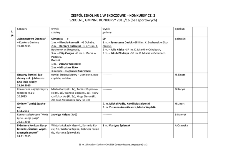 ZESPÓŁSZKÓŁNR1WSKOCZOWIE-KONKURSYCZ.2 SZKOLNE,GMINNEKONKURSY2015/16(bezsportowych) Konkurs L. p. „DiamentowaÓsemka”–KonkursGminny 19.10.2015 wyniki szkolny wyniki gminny opiekun Gimnazja--> 1m.–KlaudiaŁomozik-GOchaby, 2m.–BarbaraKulawska–Gnr1im.K. BochenekwSkoczowie, 3m.–FilipCwajna–Gim.J.Markaw Pogórzu. Dorośli 1m.-DanutaWieczorek 2m.–MirosławSitko 3miejsce–EugeniuszSkarwecki turniejśrodowiskowy–uczniowie,nauczyciele,rodzice SP 1m.–TymoteuszDadok–SP8im.K.BochenekwSkoczowie, 2m.–JuliaKóska–SPim.K.MiarkiwOchabach, 3m.–JakubPłodczyk–SPim.K.MiarkiwOchabach. poloniści ---------- H.Linert ---------- D.Kacyrz 2.m.MichałPadło,KamilMusiałowski 3.m.ZuzannaAraszkiewicz,MartaWajdzik- H.Linert ---------- B.Nawrat 1m.MartynaŚpiewak A.Orawska OtwartyTurniejSzachowyzok.jubileuszu XXX-leciaszkoły 23.10.2015 Konkursnanajpiękniejszy MartaGórny(kl.1c),TobiaszKupczewróżanieckl.1-3 ski(kl.1c),WanesaBojda(kl.2a),Patry10.2015 cjaKukuczka(kl.2a),KingaSieroń(kl. 2a)orazAleksandraBury(kl.3b) GminnyTurniejSzacho wy 6.11.2015 Konkursplastyczny"Moje JadwigaHałgas(3aG) życie-mojapasja" 26.11.2015 IIGminnyKonkursRecyWiktoriaŁukasikklasy4c,KorneliaKutatorski„Śladamiwspół- ciej5b,WiktoriaBąk6a,GabrielaFarian czesnychpoetek” 6a,MartynaŚpiewak6c 24.11.2015 ZSnr1Skoczów-Konkursy2015/16(przedmiotowe,artystyczne)cz.2 "OrzełJęzykaAngielskiego"26.11.2015 SzkolnyKonkursKolędy Polskiej 7.12. Kategoriazespoły: Imiejsce:RochCzerwiński,KarolinaGandor–kl. 5b IImiejsce:JagodaBarska, PaulinaLebioda–kl.5b IIImiejsce:KingaBiałek, ZuzannaCzuba,Daria Jochacy–kl.4c Klasy1-3Gimn. Konkursodbyłsiętylkow kategoriizespołów: Imiejsce:WiktoriaKędzierska,PatrycjaMuras –kl.1c IImiejsce:KlaudiaKocoń –kl.1c,PatrycjaŻur–kl. 2a IIImiejsce:EmanuelJarząbek,PatrycjaNowosielska–kl.1b IVGminnyKonkursJęzykaAngielskiegoChallenge2015–dlagimnazjów org.przezG4wSkoczowie 11.12.2015 Klasy1-3SP ---------- Kategoriasoliści: Im.-EsteraSzturckl.3a IIm.-RadosławRymorzkl.1d IIIm.-JuliaKołpakkl.2d Kategoriazespoły: Im.-ZofiaHyrnik,LidiaCzyż,ZofiaFijałkowska–kl.2c IIm.-NadiaGiec,TatianaGiec,Zofia Urbańska–kl.3a IIIm.-WiktoriaGórkiewicz,OliwiaZając –kl.2d Klasy4-6SPKategoriasoliści: Im.-WeronikaKusykl.5c IIm.-KarolinaKlimus–kl.5b IIIm.-AleksandraKusy–kl.4a . ZuzannaZięba.Zdobyła17punktówna21możliwych Drużyna(BarbaraKulawska,JuliaBrodacz,AdamCiężkowski)–1.m., BarbaraKulawska–1.m..indywid ZSnr1Skoczów-Konkursy2015/16(przedmiotowe,artystyczne)cz.2 D.Wierzbicka -Lapczyk, B.Niezborska -Klocek G.Targosz NataliaPawlas-Kaszai MonikaTerbak IVGminnyKonkursJęzykaAngielskiegoChallenge2015–dlaSPorg. przezSP1wSkoczowie IXSzkolnyKonkursKaligraficzny„OZłotePióro” dla1-3 02.02.2016 Im.- IzaPorębskaIa MartynaPłachciokIIc KacperKarasiewiczIIIb IIm.-: EmiliaWojtynekIbiMonikaZabłocka Ib MartaOlmaIIaiDominikKurtoIIe EsteraSzturcIIIa IIIm.- PaulinaJagóckaIaiSzymonGołuchIa BartoszPalejIIaiNataliaLebiodaIIe NadiaNowakIIIb Wyróżnienia: IgorKowalaId SzymonŚlezionaIe IIMiędzyszkolnyKonkurs RecytatorskiSzczęście niejednomaimię. 11lutego2016r.wZespoleSzkolno–PrzedszkolnymwPogórzu 2m.wgminie Indywidualnienajlepsizgminy: 1m.-AleksandraPorębska 2m.-MagdalenaRydzewska ---------- DariaWierzbicka Lapczyk E.Cisak WiktoriaWieja–2Agimn.-IIIm. GabrielaFarian–6cSP-wyróżnienie. Elżbieta Śliwka,Anna Mikai Agnieszka Orawska. ZSnr1Skoczów-Konkursy2015/16(przedmiotowe,artystyczne)cz.2 VIGwarowyKonkurs Recytatorski 31.05.2016 XKonkursRecytatorski kl.1-4 15.032016 ReformacyjnyKonkurs PlastycznyWydawnictwa „Augustana” ŚwiętoChanuki-Zbór WspólnotaEwangelii Konkurs„SolaScriptura” Wydawnictwa„Augustana” KlasyI-IIISP 1.m.-AleksandraBury 2.m.-EsteraSzturc 3.miejsce:IgorNadziałek KlasyIV-VISP 1.m.-AleksandraPorębska 2.m.-AleksandraKostrzewska 3.m.-WeronikaKusy KlasyI-IIIG 1.m.-ŁucjaCałus 2.m.-JadwigaHałgas 3.m.-NataliaStaszak Kl.1–1m.SamuelStaszko, 2m.-JuliaKisiała 3m.IzabelaPorębska Kl.2-1m.-ZofiaFijałkowska, 2m.-IgorNadziałek 3m.AmeliaBrodacz Kl.31m.DawidBijok 2m.-AleksandraBury 3m.NadiaHeller Kl.41mMateuszChmiel 2m.WiktoriaCzakon 3m.AleksandraKusy ---------- ---------- Wyróżnienia:KamilaMendrochkl.6b,JakubStebelkl. 3BG W.Łyżbicki Udział:KluzNikolakl.2CG,MatusznyPiotrkl.3AG W.Łyżbicki ŁukaszSikorafinalista W.Łyżbicki ZSnr1Skoczów-Konkursy2015/16(przedmiotowe,artystyczne)cz.2 Czyznaszswojemiasto– gminę? 11.03.2016 SPMichałGdesz,KajaKupczewskaiMagdalenaRydzewska, G-PaulinaPięknyiJakubStebel. Reprezentacja-IImiejsce,JakubStebel-IImiejsce. 1m-GdeszMichałkl.6b,KędzierskaEwelinakl.6a, OchodekKlaudiakl.6a,MarekwicaGrzegorzkl.6c,Świst Soniakl6c,SajakKrzysztofkl.6c. 1m-MarkowiczKamilkl.3b,PięknyPaulinakl.3b,Całus Łucjakl.3b,SikoraPawełkl.3c. ---------- GminnyKonkursBRD, 23.03.2016 KonkursPięknegoCzytania4-6SP 18.03.2016 KonkursPięknegoCzytania4-6SPiG(Integr.) KonkursPięknegoCzytania1-3SP 08.04.2016 MistrzPięknegoCzytania-Gabriela Farianzkl.6a. 1.m.exaequo:NikolaWróbel(6b)i PawełLanger(6b),2.m.–JudytaTora (5c),3.m.–MilenaDębinny(4b). 1m.SP-TymoteuszSodzawiczny(4a). ---------- G1.m.exaequo:KarolinaSiekierkai CzesławKurek,2.m.exaequo-KlaudiaKocońorazSaraCzakon,3.m.-WiktoriaKędzierska.wyróżnienia–Patrycja ŻuriŁukaszFigura. Kl.I1.m.–IzabelaPorębska(1a),2.m.– ---------- OliwiaGajda(1c),3.m.–KamilPonikiewski(1b) Wyróżnienia–WeronikaNowak(1d), MaksymilianOlszowski(1e) Kl.II1.m.–ZofiaFijałkowska(2c),2.m.– JudytaBruchajzer(2b),3.m.–Witold Lapczyk(2d) Wyróżnienia-EmiliaDybza(2a),Daria Greń(2e) Kl.III1.m.–ZofiaPilch(3a),2.m.–DawidBijok(3b),3.m.–BrajanWróbel (3c) ZSnr1Skoczów-Konkursy2015/16(przedmiotowe,artystyczne)cz.2 A.Golisz,H. Linert. VIMiejskiKonkursPięknegoCzytaniadlaklas13org.przezSP3 28.04.2016 „Skoczówzapraszaw Beskidy”–Konkurs Gminnyorg.ZS1 17i,19.05.2016 KonkursMorcinkowski, org.SPnr1wSkoczowie 20.05.2016 IVGwarowyKonkurs RecytatorskiwZespole SzkółPublicznychwG