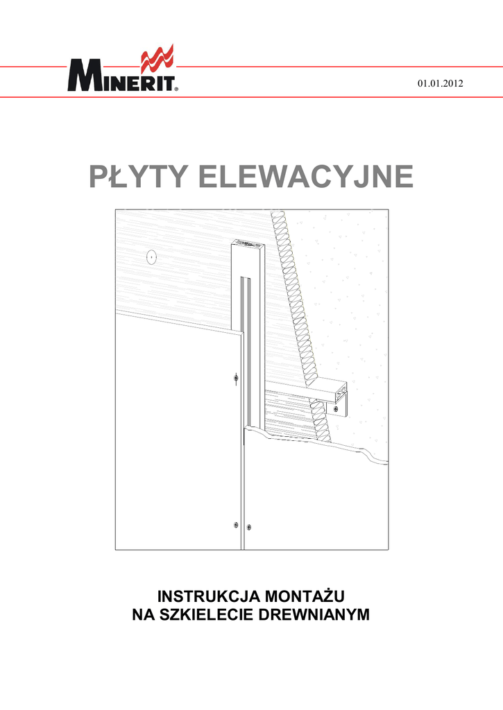01.01.2012 7 PŁYTY ELEWACYJNE INSTRUKCJA MONTAŻU NA SZKIELECIE DREWNIANYM Elewacyjne płyty Minerit Instrukcja montażu na szkielecie drewnianym INFORMACJE OGÓLNE klienta dostarczone płyty mogą być już fabrycznie pokryte przez producenta emalią akrylową wg palety NCS. Wszystkie akcesoria do montażu płyt można zamówić bez pokrycia dekoracyjnego lub przygotowane w kolorze płyt. Płyty elewacyjne Minerit HD oraz barwione w masie posiadają klasyfikację ogniową A2-s1, d0. Płyty okładzinowe Minerit różnych formatów i z różnym pokryciem tworzą piękne, harmonizujące z otoczeniem fasady. Za pomocą różnych kolorów i faktur płyt można podkreślić linie architektoniczne budynków i unowocześnić ich wygląd. Oprócz zmiany wyglądu zewnętrznego elewacji można jednocześnie docieplić budynek obniżając koszty ogrzewania. Przy pomocy dodatkowej warstwy izolacyjnej z wełny mineralnej w przestrzeni pomiędzy ścianą a płytą osłonową Minerit można także wysuszyć zawilgoconą ścianę oraz zahamować procesy niszczące beton. Płyty elewacyjne Minerit stanowią ciekawą ofertę dla lekkiego budownictwa, gdzie oprócz estetycznego wyglądu dużą rolę odgrywa również trwałość i szybki montaż. Płaskie, włóknisto – cementowe płyty elewacyjne Minerit HD oraz płyty Minerit barwione w masie (dostępne w 5 kolorach: szarym, białym, żółtym, zielonym, czerwonym) są doskonałym materiałem do budowy elewacji wentylowanych zarówno nowych jak i remontowanych budynków. Znajdują również szerokie zastosowanie jako okładziny balustrad balkonów, okładziny fundamentów, cokołów, kominów, attyk i innych detali architektonicznych. Składają się one w 90% z cementu oraz w 10% z włókien i wypełniaczy mineralnych. Nie zawierają one żadnych szkodliwych dla zdrowia substancji. Są odporne na mróz i erozyjne działanie innych czynników atmosferycznych. Płyty na plac budowy mogą być dostarczone w standardowych formatach lub przycięte na żądane przez klienta wymiary. Równa i gładka powierzchnia płyt Minerit HD jest świetnym podłożem dla farb i tynków co gwarantuje wysoką jakość pokrycia dekoracyjnego wykonanego na placu budowy. Na życzenie PŁYTY ELEWACYJNE Z RODZINY MINERIT PRODUKTY / TYP PŁYTY (charakterystyka wykończenia) MINERIT HD - płyta bez pokrycia dekoracyjnego - płyta pomalowana wg instrukcji malowania płyt elewacyjnych MINERIT HD* (gruntowana) - płyta fabrycznie zagruntowana z obu stron farbą akrylową - wykańczając pomalowana wg instrukcji malowania płyt elewacyjnych MINERIT Barwione w masie z licową stroną szczotkowaną Max długość (na ruszcie drewn.) STANDARDOWE FORMATY I GRUBOŚCI 3050 mm 6 x 1200 x 3050 mm 8 x 1250 x 2500 mm 8 x 1200 x 3050 mm 10 x 1250 x 2500 mm 10 x 1200 x 3050 mm 10,8 kg/m2 14,4 kg/m2 14,4 kg/m2 14,4 kg/m2 18,0 kg/m2 18,0 kg/m2 około 2,0 mm/m 3050 mm 6 x 1200 x 3050 mm 8 x 1250 x 2500 mm 8 x 1200 x 3050 mm 10 x 1250 x 2500 mm 10 x 1200 x 3050 mm 10,8 kg/m2 14,4 kg/m2 14,4 kg/m2 18,0 kg/m2 18,0 kg/m2 około 2,0 mm/m 3050 mm 8 x 1200 x 3050 mm 14,4 kg/m2 około 1,5 mm/m 2 WAGA Ruchy pod wpływem wilgoci RH 30...95 % INSTRUKCJA MONTAŻU PŁYT NA SZKIELECIE DREWNIANYM regulowanymi łącznikami fasadowymi zgodnie ze szczegółowym projektem konstrukcji. Dzięki możliwości regulowania niwelujemy nierówności podłoża uzyskując równą płaszczyznę pod płytą. Uwaga 1: Przy projektowaniu i budowie elewacyjnych ścian osłonowych należy zawsze pamiętać że wewnętrzna powierzchnia płyty powinna być wentylowana. Przestrzeni wentylacyjnej w żadnym wypadku nie wolno zamykać (na przykład materiałem izolacyjnym, okapnikami lub innymi poziomymi przegrodami). Szczelina wentylacyjna powinna być otwarta u dołu i u góry płyty i posiadać szerokość nie mniejszą jak 22 mm. Listwy pionowe Uwaga 2: Pokryta płyta wchłania z powietrza około połowę tej wilgoci, którą wchłania nie pomalowana płyta w tym samym czasie. W praktyce oznacza to, że wydłużenie pod wpływem wilgoci pomalowanej płyty jest dwa razy mniejsze niż płyty nie pomalowanej. Z tego powodu maksymalne rozmiary płyt malowanych mogą być większe od maksymalnych rozmiarów płyt bez pokrycia. W projekcie obowiązkowo należy uwzględnić dopuszczalne obciążenia takie jak zacinające deszcze, przenikalność wilgoci, napory wiatru, umiejscowienie geograficzne budynku itd., to znaczy te parametry, które nie są możliwe do opisania w ogólnej instrukcji montażu. Rozmiary i odstęp listew pionowego szkieletu podany powinien być w projektach konstrukcyjnym i architektonicznym. Obowiązkowo pod dolnymi krawędziami płyt montuje się oddzielne, krótkie listwy oporowe (rys 01, poz. 1) zlicowane z listwami pionowymi szkieletu. Rozstaw między osiami poziomych listew ma wpływ na przekrój listew tworzących szkielet pionowy według następującej zasady: im większa odległość pomiędzy listwami poziomymi, tym większa powinna być grubość listew pionowych. Przy montażu poziomego i pionowego szkieletu zaleca się stosowanie listew o wytrzymałości T18 i klasie wilgotności 2. W konstrukcjach tego typu nie jest obowiązkowe stosowanie listew impregnowanych. Kolejność montażu - TERMOIZOLACJA I DODATKOWE DOCIEPLENIE łączniki fasadowe szkielet poziomy z wyrównaniem ściany dodatkowa termoizolacja i wiatroizolacja szkielet pionowy uszczelka EPDM w razie potrzeby listwa pionowa płyty okładzinowe i listwy poziome Typ i grubość izolacji cieplnej powinien być wskazany w dokumentacji projektowej. Złącza arkuszy izolacji w kolejnych warstwach powinny przykrywać się na zakładkę, aby ograniczyć straty ciepła. Podczas montażu należy przestrzegać instrukcji zawartych w projekcie oraz zaleceń producenta zastosowanej izolacji termicznej ŚCIANA NOŚNA Przed rozpoczęciem pracy należy obowiązkowo zapoznać się z wytrzymałością podłoża (konstrukcji wsporczej, ściany nośnej), a także 