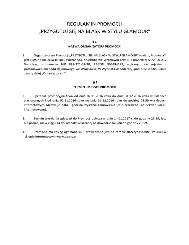 REGULAMIN PROMOCJI „PRZYGOTUJ SIĘ NA BLASK W STYLU GLAMOUR” §1 NAZWA ORGANIZATORA PROMOCJI 1. Organizatorem Promocji „PRZYGOTUJ SIĘ NA BLASK W STYLU GLAMOUR” (dalej: „Promocja") jest Highlite Bielecka Jellinek Poznar sp.j. z siedzibą we Wrocławiu przy ul. Pomorskiej 55/2, 50-217 Wrocław, o numerze NIP 898-221-61-30, REGON 363484399, wpisanym do rejestru z postanowieniem Sądu Rejonowego we Wrocławiu, VI Wydział Gospodarczy, pod KRS: 0000595440, zwany dalej „Organizatorem”. §2 TERMIN I MIEJSCE PROMOCJI 2. Sprzedaż promocyjna trwa od dnia 02.11.2016 roku do dnia 31.12.2016 roku w sklepach stacjonarnych i od dnia 02.11.2016 roku do dnia 31.12.2016 roku do godziny 23:59 w sklepach internetowych (decyduje data i godzina wysłania zamówienia i/lub rezerwacji na serwer sklepu internetowego). 3. Termin wysyłania zgłoszeń do Promocji upływa w dniu 14.01.2017 r. do godziny 23:59, lecz nie później niż w ciągu 14 dni od daty wskazanej na dowodzie zakupu do godziny 23:59. 4. Promocja ma zasięg ogólnopolski i prowadzona jest na terenie Rzeczypospolitej Polskiej w sklepie internetowym www.avans.pl §3 PRODUKTY OBJĘTE SPRZEDAŻĄ PROMOCYJNĄ 5. Sprzedażą promocyjną objęte są wybrane produkty spośród suszarek, prostownic, lokówek, lokówko-suszarek, zestawów do stylizacji, wałków, depilatorów oraz urządzeń IPL, golarek i trymerów damskich, zalotek do rzęs, pilników do stóp, szczotek do ciała, szczoteczek do twarzy oraz szczoteczek do zębów Remington (dalej: „Produkty promocyjne"). Lista produktów promocyjnych stanowi Załącznik nr 2. §4 UCZESTNICY PROMOCJI 6. Uczestnikiem Promocji może być każda pełnoletnia osoba fizyczna posiadająca pełną zdolność do czynności prawnej oraz każda osoba fizyczna, która ukończyła 13 rok życia za zgodą przedstawiciela ustawowego (dalej „Uczestnik”). W przypadku wątpliwości co do wieku Uczestnika, Organizator może poprosić o okazanie dokumentu potwierdzającego wiek Uczestnika pod warunkiem nie wydania nagrody. 7. W Promocji nie mogą brać udziału pracownicy Organizatora, Loyal Concept i Spectrum Brands Poland Sp. z o.o. oraz członkowie ich rodzin. Przez członków rodziny rozumie się: rodziców, dzieci, małżonków i rodzeństwo, przy czym zastrzeżenie dotyczy osób, które brały bezpośredni udział przy realizacji Promocji oraz tych, które pracowały nad projektem i wdrożeniem Promocji. Organizator zwolniony jest z pobierania oświadczeń w tym zakresie. §5 DANE OSOBOWE 8. Dane osobowe Uczestników będą przetwarzane w celu przeprowadzenia niniejszej Promocji oraz wydania Gratisów przez Highlite Bielecka Jellinek Poznar sp.j. z siedzibą we Wrocławiu przy ul. Pomorskiej 55/2, 50-217 Wrocław i Loyal Concept Sp. z o.o. z siedzibą w Warszawie przy ul. Tużyckiej 8 lok. 6, 03-683 Warszawa. Administratorem danych osobowych jest Spectrum Brands Poland sp. z o.o. z siedzibą w Warszawie, przy ul. Bitwy Warszawskiej 1920r. 7a, 02-366 Warszawa. Podanie danych jest dobrowolne, lecz niezbędne dla potrzeb przeprowadzenia Promocji i wydania Gratisów. Dane osobowe Uczestników – po wyrażeniu przez nich zgody, będą również przetwarzane do celów marketingowych przez Spectrum Brands Poland oraz Highlite Bielecka Jellinek Pozar sp.j. zgodnie z ustawą z dn. 29.08.1997 r. o ochronie danych osobowych (tekst jedn. Dz.U. z 2002, Nr 101, poz. 926 z późn. zm.). Uczestnikom Promocji przysługuje prawo dostępu do treści swoich danych oraz ich poprawiania. §6 NAGRODY W PROMOCJI 9. W Promocji przewidziano gratisy (dalej: „Gratisy”) za zakup produktu Remington objętego Promocją: srebrne kolczyki marki Apart o wartości rynkowej 49 zł brutto. Liczba Gratisów jest ograniczona do 2000 sztuk (słownie: dwa tysiące sztuk). 10. W przypadku wyczerpania puli Gratisów Organizator poinformuje o tym na stronie blaskglamour.pl w zakładce Weź udział. §7 WARUNKI UCZESTNICTWA W PROMOCJI 11. Podstawą do wzięcia udziału w Promocji może być jedynie zakup produktów nowych, dostępnych tylko i wyłącznie w sklepach określonych w punkcie 4 niniejszego Regulaminu, w stosunku do których gwarantem jest Spectrum Brands Poland Sp. z o.o., oraz w terminie, o którym jest mowa w punkcie 2 niniejszego Regulaminu. 12. Aby wziąć udział w Promocji Uczestnik zobowiązany jest spełnić łącznie następujące warunki: 12.1. Dokonać w terminie od dnia 02.11.2016 r. do dnia 31.12.2016 r. zakupu produktu spośród wybranych suszarek, prostownic, lokówek, lokówko-suszarek, zestawów do stylizacji, wałków, depilatorów oraz urządzeń IPL, golarek i trymerów damskich, zalotek do rzęs, pilników do stóp, szczotek do ciała, szczoteczek do twarzy oraz szczoteczek do zębów marki Remington. Listę Produktów Promocyjnych stanowi Załącznik nr 2. Zakup Produktów Promocyjnych musi być udokumentowany jednym dowodem zakupu (paragon lub faktura VAT), upoważniającym do wysłania jednego Zgłoszenia do Promocji, 12.2. W ciągu 14 dni od daty wskazanej na dowodzie zakupu, ale nie później niż do 14.01.2017 roku do godziny 23:59, przekazać swoje zgłoszenie poprzez wypełnienie formularza rejestracyjnego w wersji elektronicznej na stronie blaskglamour.pl (w tym dodanie zdjęć lub skanów wyciętego z opakowania produktu kodu EAN i paragonu lub faktury VAT potwierdzającej zakup) oraz kliknięcie w link aktywacyjny w mailu weryfikacyjnym. 13. W skład prawidłowego Zgłoszenia do Promocji wchodzi: a) Kopia, zdjęcie lub skan dowodu zakupu Produktu Promocyjnego (faktura VAT lub paragon fiskalny), oraz b) Oryginalny kod kreskowy wycięty z opakowania Produktu Promocyjnego (lub jego zdjęcie lub skan), oraz c) Kompletnie wypełniony, w formie elektronicznej, formularz rejestracyjny w Promocji „PRZYGOTUJ SIĘ NA BLASK W STYLU GLAMOUR”, który dostępny jest na stronie blaskglamour.pl, a którego wzór stanowi Załącznik nr 1. 14. Dokumenty, o których mowa powyżej powinny zostać wysłane na