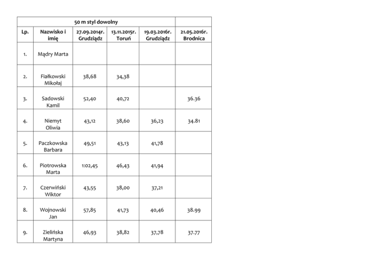 50 m styl dowolny Lp. Nazwisko i imię 27.09.2014r. Grudziądz 13.11.2015r. Toruń 1. Mądry Marta 2. 19.03.2016r. Grudziądz 21.05.2016r. Brodnica Fiałkowski Mikołaj 38,68 34,38 3. Sadowski Kamil 52,40 40,72 4. Niemyt Oliwia 43,12 38,60 36,23 5. Paczkowska Barbara 49,51 43,13 41,78 6. Piotrowska Marta 1:02,45 46,43 41,94 7. Czerwiński Wiktor 43,55 38,00 37,21 8. Wojnowski Jan 57,85 41,73 40,46 38.99 9. Zielińska Martyna 46,93 38,82 37,78 37.77 36.36 34.81 10. Libuszewska Julia 11. Wojnarowska Małgorzata 12. Szymańska Nadia 13. Jaworska Wiktoria 57,53 47,32 42,42 14. Rusinek Mateusz 1:17.31 57,04 53,95 9.04.2016r. Rypin 40.67 16.04.2016r. Włocławek 39.74 15. Makowska Oliwia 55,53 38,53 38,73 41,68 41,62 39.70 44,48 42.03 4.06.2016r. Lipno 40.92 50 m styl grzbietowy Lp. Nazwisko i imię 27.09.2014 13.11.2015 28.11.2015 Grudziądz Toruń Brodnica 19.03.2016 Grudziądz 1. Mądry Marta 2. Fiałkowski Mikołaj 48.92 42.48 3. Sadowski Kamil 55.93 47.71 4. Niemyt Oliwia 58.15 43.70 5. Paczkowska Barbara 59.71 55.75 6. Piotrowska Marta 1:01.65 46.97 7. Czerwiński Wiktor 53.12 46.14 45.69 8. Wojnowski Jan 58.25 54.38 49.34 9. Zielińska Martyna 55.27 21.05.2016r. Brodnica 45.57 47.22 47.49 47.47 10. Libuszewska Julia 11. Wojnarowska Małgorzata 12. Szymańska Nadia 13. Jaworska Wiktoria 14. Rusinek Mateusz 57.78 48.83 46.04 50.83 52.28 51.02 1:01.15 51.86 1:19.50 dyskwalifikacja 50m styl klasyczny Lp. Nazwisko i imię 13.11.2015r. Toruń 28.11.2015r. Brodnica 19.03.2016r. Grudziądz 21.05.2016r. Brodnica 1. Mądry Marta 2. Fiałkowski Mikołaj 3. Sadowski Kamil 4. Niemyt Oliwia 53.80 5. Paczkowska Barbara 59.12 6. Piotrowska Marta 59.41 7. Czerwiński Wiktor 52.41 50.76 8. Wojnowski Jan 53.84 52.70 9. Zielińska Martyna 53.63 52.13 52.74 10. Libuszewska Julia 49.64 48.08 11. Wojnarowska Małgorzata 57.67 1:00.53 12. Szymańska Nadia 52.85 52.98 13. Jaworska Wiktoria 1:02.34 1:01.24 14. Rusinek Mateusz 54.87 54.38 15. Łacek Marcelina 16. Makowska Oliwia 56.07 56.54 50.91 51.31 56.55 9.04.2016r. Rypin 57.98 50m styl motylkowy Lp. Nazwisko i imię 13.11.2015r. 21.11.2015r. 28.11.2015r. 19.03.2016r. Toruń Grudziądz Brodnica Grudziądz 16.04.2016r. Włocławek 21.05.2016r. Brodnica 1. Mądry Marta 2. Fiałkowski Mikołaj 3. Sadowski Kamil 4. Niemyt Oliwia 5. Paczkowska Barbara 6. Piotrowska Marta 7. Czerwiński Wiktor 8. 9. Wojnowski Jan Zielińska Martyna 41.93 45.24 44.17 42.53 40.93 40.07 38.33 38.59 40.68 38.96 42.32 40.84 55.03 48.08 50.37 50.90 49.03 44.23 44.40 48.95 45.34 10. Libuszewska Julia 49.39 11. Wojnarowska Małgorzata 49.37 12. Szymańska Nadia 13. Jaworska Wiktoria 14. Rusinek Mateusz 46.15 41.90 43.01 46.53 49.56 54.70 dyskwalifikacja 1:05.95 1:04.49 54.25
