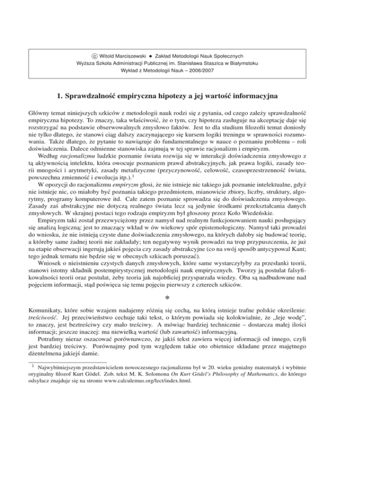 c Witold Marciszewski • Zakład Metodologii Nauk Społecznych Wyższa Szkoła Administracji Publicznej im. Stanisława Staszica w Białymstoku Wykład z Metodologii Nauk – 2006/2007 1. Sprawdzalność empiryczna hipotezy a jej wartość informacyjna Główny temat niniejszych szkiców z metodologii nauk rodzi si˛e z pytania, od czego zależy sprawdzalność empiryczna hipotezy. To znaczy, taka właściwość, że o tym, czy hipoteza zasługuje na akceptacj˛e daje si˛e rozstrzygać na podstawie obserwowalnych zmysłowo faktów. Jest to dla studium filozofii temat doniosły ˛ dalszy zaczynajacego ˛ si˛e kursem logiki treningu w sprawności rozumonie tylko dlatego, że stanowi ciag wania. Także dlatego, że pytanie to nawiazuje ˛ do fundamentalnego w nauce o poznaniu problemu – roli doświadczenia. Dalece odmienne stanowiska zajmuja˛ w tej sprawie racjonalizm i empiryzm. Według racjonalizmu ludzkie poznanie świata rozwija si˛e w interakcji doświadczenia zmysłowego z ta˛ aktywnościa˛ intelektu, która owocuje poznaniem prawd abstrakcyjnych, jak prawa logiki, zasady teorii mnogości i arytmetyki, zasady metafizyczne (przyczynowość, celowość, czasoprzestrzenność świata, powszechna zmienność i ewolucja itp.).1 W opozycji do racjonalizmu empiryzm głosi, że nie istnieje nic takiego jak poznanie intelektualne, gdyż nie istnieje nic, co miałoby być poznania takiego przedmiotem, mianowicie zbiory, liczby, struktury, algorytmy, programy komputerowe itd. Całe zatem poznanie sprowadza si˛e do doświadczenia zmysłowego. Zasady zaś abstrakcyjne nie dotycza˛ realnego świata lecz sa˛ jedynie środkami przekształcania danych zmysłowych. W skrajnej postaci tego rodzaju empiryzm był głoszony przez Koło Wiedeńskie. ˛ Empiryzm taki został przezwyci˛eżony przez namysł nad realnym funkcjonowaniem nauki posługujacy si˛e analiza˛ logiczna; ˛ jest to znaczacy ˛ wkład w ów wiekowy spór epistemologiczny. Namysł taki prowadzi do wniosku, że nie istnieja˛ czyste dane doświadczenia zmysłowego, na których dałoby si˛e budować teori˛e, a któreby same żadnej teorii nie zakładały; ten negatywny wynik prowadzi na trop przypuszczenia, że już na etapie obserwacji ingeruja˛ jakieś poj˛ecia czy zasady abstrakcyjne (co na swój sposób antycypowal Kant; tego jednak tematu nie b˛edzie si˛e w obecnych szkicach poruszać). Wniosek o nieistnieniu czystych danych zmysłowych, które same wystarczyłyby za przesłanki teorii, stanowi istotny składnik postempirystycznej metodologii nauk empirycznych. Tworzy ja˛ postulat falsyfikowalności teorii oraz postulat, żeby teoria jak najobficiej przysparzała wiedzy. Oba sa˛ nadbudowane nad poj˛eciem informacji, stad ˛ poświ˛eca si˛e temu poj˛eciu pierwszy z czterech szkiców. * Komunikaty, które sobie wzajem nadajemy różnia˛ si˛e cecha,˛ na która˛ istnieje trafne polskie określenie: treściwość. Jej przeciwieństwo cechuje taki tekst, o którym powiada si˛e kolokwialnie, że „leje wod˛e”, ˛ bardziej technicznie – dostarcza małej ilości to znaczy, jest beztreściwy czy mało treściwy. A mówiac informacji; jeszcze inaczej: ma niewielka˛ wartość (lub zawartość) informacyjna.˛ Potrafimy nieraz oszacować porównawczo, że jakiś tekst zawiera wi˛ecej informacji od innego, czyli jest bardziej treściwy. Porównajmy pod tym wzgl˛edem takie oto obietnice składane przez maj˛etnego dżentelmena jakiejś damie. 1 Najwybitniejszym przedstawicielem nowoczesnego racjonalizmu był w 20. wieku genialny matematyk i wybitnie oryginalny filozof Kurt Gödel. Zob. tekst M. K. Solomona On Kurt Gödel’s Philosophy of Mathematics, do którego odsyłacz znajduje si˛e na stronie www.calculemus.org/lect/index.html. 2 1. 2. 3. 4. 1. Sprawdzalność hipotezy a jej wartość informacyjna Kupi˛e ci perły i brylanty. Kupi˛e ci perły. Kupi˛e ci brylanty. Kupi˛e ci perły lub brylanty. Zawartość informacyjna (ilość informacji) zdania 1, w skrócie I(1), ma si˛e do pozostałych, jak nast˛epuje. I(1) > I(2), I(1) > I(3), I(2) > I(4), I(3) > I(4); I(1) > I(4). Zdanie 1, jako obietnica, jest treściwsze czyli bardziej informacyjne od 2 i od 3, skoro wi˛ecej obiecuje. A z kolei 2 (jak i 3) niesie wi˛ecej informacji niż 4 (choć liczy mniej słów), ponieważ trudniej jest dotrzymać 2 niż 4. Kto złoży obietnic˛e 4, ma otwarte dwie możliwości, a wi˛ec łatwiej mu si˛e wywiazać ˛ (np. kupi to, co tańsze, jeśliby w tym momencie miał problem z gotówka); ˛ obietnice 2 i 3 sa˛ bardziej od 4 konkretne i w tym sensie treściwsze, a tym samym trudniejsze do dotrzymania. ˛ wypowiedzia˛ fałszywa.˛ Mamy wtedy do Niedotrzymanie obietnicy czyni zdanie zdanie ja˛ wyrażajace czynienia z faktem falsyfik[6 acji. Falsyfikacja (niedotrzymanie) tym bardziej zagraża, im obietnica jest konkretniejsza czyli im wi˛ecej zawiera informacji. I tak, łatwiej o falsyfikacj˛e zdania 1 niż zdania 4, czyli 1 jest wypowiedzia˛ majac ˛ a˛ wyższy stopień falsyfikowalności. Bardziej precyzyjne, to jest, ilościowe oszacowanie nie zawsze jest możliwe. Warto jednak zapoznać si˛e z przypadkami, kiedy taka możliwość zachodzi. Pozwalaja˛ one lepiej rozumieć, na czym treściwość polega. Gdy nasza intuicja wyćwiczy si˛e w obliczaniu ilości informacji, trafniej i łatwiej dokona oszacowań także tam, gdzie informacja jest mało podatna na określenie ilościowe. W opowiastce tak prostej, żeby nasza˛ metod˛e dało si˛e w niej przedstawić jak najprzejrzyściej, rozpatrzmy przypadek poszukiwań drobnego obiektu na szachownicy; niech b˛edzie nim mrówka. Wyobraźmy sobie, że za wiadomość o miejscu pobytu mrówki wyznaczona jest nagroda, której wielkość zależy od ilości dostarczonej informacji, mianowicie dziesi˛eć dolarów za każda˛ jednostk˛e informacji (jakie to jednostki, wyjaśni si˛e niebawem). Wypłata zaś nastapi ˛ wtedy, gdy wiadomość okaże si˛e prawda.˛ Int