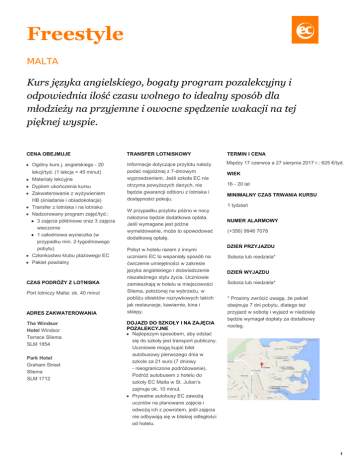 Freestyle MALTA Kurs języka angielskiego, bogaty program pozalekcyjny i odpowiednia ilość czasu wolnego to idealny sposób dla młodzieży na przyjemne i owocne spędzenie wakacji na tej pięknej wyspie. CENA OBEJMUJE Ogólny kurs j. angielskiego - 20 lekcji/tyd. (1 lekcja = 45 minut) Materiały lekcyjne Dyplom ukończenia kursu Zakwaterowanie z wyżywieniem HB (śniadanie i obiadokolacja) Transfer z lotniska i na lotnisko Nadzorowany program zajęć/tyd.: 3 zajęcia półdniowe oraz 3 zajęcia wieczorne 1 całodniowa wycieczka (w przypadku min. 2-tygodniowego pobytu) Członkostwo klubu plażowego EC Pakiet powitalny CZAS PODRÓŻY Z LOTNISKA Port lotniczy Malta: ok. 40 minut ADRES ZAKWATEROWANIA The Windsor Hotel Windsor Terrace Sliema SLM 1854 Park Hotel Graham Street Sliema SLM 1712 TRANSFER LOTNISKOWY TERMIN I CENA Informacje dotyczące przylotu należy podać najpóźniej z 7-dniowym wyprzedzeniem. Jeśli szkoła EC nie otrzyma powyższych danych, nie będzie gwarancji odbioru z lotniska i dostępności pokoju. Między 17 czerwca a 27 sierpnia 2017 r.: 625 €/tyd. WIEK 16 - 20 lat MINIMALNY CZAS TRWANIA KURSU 1 tydzień W przypadku przylotu późno w nocy nałożona będzie dodatkowa opłata. Jeśli wymagane jest późne wymeldowanie, może to spowodować dodatkową opłatę. Pobyt w hotelu razem z innymi uczniami EC to wspaniały sposób na ćwiczenie umiejętności w zakresie języka angielskiego i doświadczenie niezależnego stylu życia. Uczniowie zamieszkają w hotelu w miejscowości Sliema, położonej na wybrzeżu, w pobliżu obiektów rozrywkowych takich jak restauracje, kawiarnie, kina i sklepy. DOJAZD DO SZKOŁY I NA ZAJĘCIA POZALEKCYJNE Najlepszym sposobem, aby odstać się do szkoły jest transport publiczny. Uczniowie mogą kupić bilet autobusowy pierwszego dnia w szkole za 21 euro (7 dniowy - nieograniczone podróżowanie). Podróż autobusem z hotelu do szkoły EC Malta w St. Julian’s zajmuje ok. 10 minut. Prywatne autobusy EC zawożą uczniów na planowane zajęcia i odwożą ich z powrotem, jeśli zajęcia nie odbywają się w bliskiej odległości od hotelu. NUMER ALARMOWY (+356) 9946 7078 DZIEŃ PRZYJAZDU Sobota lub niedziela* DZIEŃ WYJAZDU Sobota lub niedziela* * Prosimy zwrócić uwagę, że pakiet obejmuje 7 dni pobytu, dlatego też przyjazd w sobotę i wyjazd w niedzielę będzie wymagał dopłaty za dodatkowy nocleg. 1 Zakwaterowanie Posiłki WYŻYWIENIE ŚNIADANIE HB (śniadanie i obiadokolacja). Pełne wyżywienie dostępne za dodatkową dopłatą. Hotel nie oferuje lunchu. Śniadanie kontynentalne składające się z herbaty lub kawy, soku pomarańczowego, świeżego chleba, masła, dżemu, szynki i sera. POKÓJ KOLACJA Pokoje trzyosobowe – uczniowie są przydzielani do pokojów trzyosobowych z osobami innej narodowości tej samej płci. Uczniowie mogą być poproszeni o zmianę pokoju podczas pobytu, aby cały czas mieszkali w pokoju trzyosobowym. ŁAZIENKI Pokoje z łazienkami WYPOSAŻENIE POKOJU miejsce do przechowywania rzeczy TV klimatyzacja POŚCIEL/RĘCZNIKI Pościel oraz ręczniki są zapewnione na miejscu – uczniowie powinni przywieźć własne ręczniki plażowe. Pościel i ręczniki są wymieniane co najmniej raz w tygodniu. Posiłek w postaci trzy-daniowego bufetu z wyborem przystawek, dań głównych i deserów. Jedna duża butelka wody serwowana na 4 uczniów. Uczniowie mogą kupić dodatkowe napoje w restauracji. SPECJALNE WYMAGANIA ŻYWIENIOWE W przypadku szczególnych wymagań żywieniowych (np. dieta bezglutenowa / wegetariańska / Halal), należy poinformować o tym szkołę przed przyjazdem ucznia. Uwaga: Dieta bezglutenowa może podlegać dopłacie. Dość wysokie temperatury charakterystyczne dla sezonu letniego na Malcie wymagają, aby uczniowie spożywali wystarczającą ilość wody. Mimo że woda jest zapewniana podczas posiłków, uczniowie powinni sami się w nią zaopatrzyć na czas zajęć rekreacyjnych i lekcji. Jest to istotna kwestia, którą należy uwzględnić wyznaczając wysokość kieszonkowego. ZDROWIE PRANIE Istnieje możliwość skorzystania z usługi prania. Cena za 3 kg prania to ok. 12 euro (może ulec zmianie). WI-FI Bezprzewodowa nielimitowana sieć Wi-Fi dostępna jest w lobby/na terenie baru hotelowego dla uczniów, którzy przyniosą swoje własne laptopy/urządzenia. Dostęp do komputera z Internetem 1 euro za 20 minut (cena może ulec zmianie). Nielimitowana bezpłatna sieć Wi-Fi jest dostępna również na terenie szkoły. WYPOSAŻENIE HOTELU Mały otwarty basen otoczony tarasem do opalania Skrytka depozytowa (za symboliczną opłatą dodatkową) Recepcja czynna całą dobę NADZÓR Dokonując rezerwacji należy poinformować szkołę EC o wszelkich dolegliwościach zdrowotnych, alergiach lub konieczności stałego przyjmowania leków. Uczniowie muszą posiadać odpowiednie ubezpieczenie zdrowotne, wypadkowe i turystyczne, które należy nabyć przed przyjazdem. Uczestnicy z krajów Unii Europejskiej, posiadający Europejską Kartę Ubezpieczenia Zdrowotnego (EKUZ) są uprawnieni do korzystania z darmowej publicznej opieki zdrowotnej. Na prośbę uczestnika kursu możliwe jest skorzystanie z prywatnej opieki zdrowotnej po uiszczeniu opłaty w wysokości ok. 25 euro za wizytę. Opłatę należy uregulować podczas wizyty lekarskiej. Uwaga: Hotel pobierze podlegającą zwrotowi kaucję w wysokości 50 euro na poczet ewentualnych szkód wyrządzonych przez ucznia i zwróci ją w dniu wyjazdu podczas wymeldowania. Koszty wszelkich szkód spowodowanych przez ucznia zostaną odjęte z tej kaucji. Dla wzmożonego bezpieczeństwa i asysty opiekunowie EC również mieszkają w hotelu. 2 Miejsce zajęć lekcyjnych Lekcje prowadzone są w naszych jasnych, klimatyzowanych klasach w EC Malta w St. Julian's. Kurs: Angielski ogólny 20 lekcji tygodniowo (łącznie 15 godzin) 1 lekcja = 45 minut Kursa ma na celu poprawę znajomości języka angielskiego poprzez rozwijanie kluczowych umiejętności: czytan