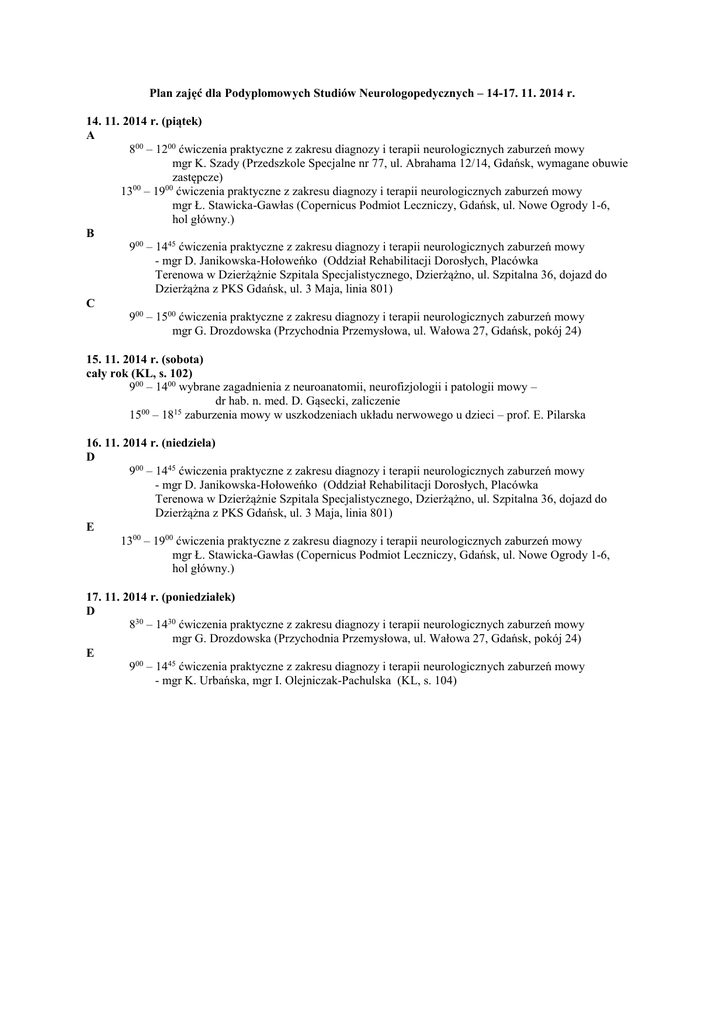 Plan zajęć dla Podyplomowych Studiów Neurologopedycznych – 14-17. 11. 2014 r. 14. 11. 2014 r. (piątek) A 800 – 1200 ćwiczenia praktyczne z zakresu diagnozy i terapii neurologicznych zaburzeń mowy mgr K. Szady (Przedszkole Specjalne nr 77, ul. Abrahama 12/14, Gdańsk, wymagane obuwie zastępcze) 1300 – 1900 ćwiczenia praktyczne z zakresu diagnozy i terapii neurologicznych zaburzeń mowy mgr Ł. Stawicka-Gawłas (Copernicus Podmiot Leczniczy, Gdańsk, ul. Nowe Ogrody 1-6, hol główny.) B 900 – 1445 ćwiczenia praktyczne z zakresu diagnozy i terapii neurologicznych zaburzeń mowy - mgr D. Janikowska-Hołoweńko (Oddział Rehabilitacji Dorosłych, Placówka Terenowa w Dzierżążnie Szpitala Specjalistycznego, Dzierżążno, ul. Szpitalna 36, dojazd do Dzierżążna z PKS Gdańsk, ul. 3 Maja, linia 801) C 900 – 1500 ćwiczenia praktyczne z zakresu diagnozy i terapii neurologicznych zaburzeń mowy mgr G. Drozdowska (Przychodnia Przemysłowa, ul. Wałowa 27, Gdańsk, pokój 24) 15. 11. 2014 r. (sobota) cały rok (KL, s. 102) 900 – 1400 wybrane zagadnienia z neuroanatomii, neurofizjologii i patologii mowy – dr hab. n. med. D. Gąsecki, zaliczenie 1500 – 1815 zaburzenia mowy w uszkodzeniach układu nerwowego u dzieci – prof. E. Pilarska 16. 11. 2014 r. (niedziela) D 900 – 1445 ćwiczenia praktyczne z zakresu diagnozy i terapii neurologicznych zaburzeń mowy - mgr D. Janikowska-Hołoweńko (Oddział Rehabilitacji Dorosłych, Placówka Terenowa w Dzierżążnie Szpitala Specjalistycznego, Dzierżążno, ul. Szpitalna 36, dojazd do Dzierżążna z PKS Gdańsk, ul. 3 Maja, linia 801) E 1300 – 1900 ćwiczenia praktyczne z zakresu diagnozy i terapii neurologicznych zaburzeń mowy mgr Ł. Stawicka-Gawłas (Copernicus Podmiot Leczniczy, Gdańsk, ul. Nowe Ogrody 1-6, hol główny.) 17. 11. 2014 r. (poniedziałek) D 830 – 1430 ćwiczenia praktyczne z zakresu diagnozy i terapii neurologicznych zaburzeń mowy mgr G. Drozdowska (Przychodnia Przemysłowa, ul. Wałowa 27, Gdańsk, pokój 24) E 900 – 1445 ćwiczenia praktyczne z zakresu diagnozy i terapii neurologicznych zaburzeń mowy - mgr K. Urbańska, mgr I. Olejniczak-Pachulska (KL, s. 104)