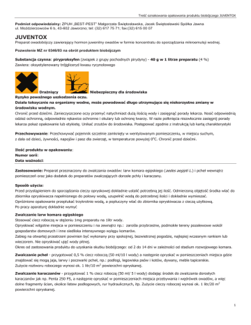 Treść oznakowania opakowania produktu biobójczego JUVENTOX Podmiot odpowiedzialny: ZPUH „BEST-PEST” Małgorzata Świętosławska, Jacek Świętosławski Spółka Jawna ul. Moździerzowców 6 b, 43-602 Jaworzno; tel: (32) 617 75 71; fax:(32) 615 00 07 JUVENTOX Preparat owadobójczy zawierający hormon juwenilny owadów w formie koncentratu do sporządzania mikroemulsji wodnej. Pozwolenie MZ nr 0346/03 na obrót produktem biobójczym Substancja czynna: piryproksyfen (związek z grupy pochodnych pirydyny) - 40 g w 1 litrze preparatu (4 %) Zawiera: oksyetylenowany trójgliceryd kwasu rycynolowego Drażniący Niebezpieczny dla środowiska Ryzyko poważnego uszkodzenia oczu. Działa toksycznie na organizmy wodne, może powodować długo utrzymujące się niekorzystne zmiany w środowisku wodnym. Chronić przed dziećmi. Zanieczyszczone oczy przemyć natychmiast dużą ilością wody i zasięgnąć porady lekarza. Nosić odpowiednią odzież ochronną, odpowiednie rękawice ochronne i okulary lub ochronę twarzy. W razie połknięcia niezwłocznie zasięgnij porady lekarza pokaż opakowanie lub etykietę. Unikać zrzutów do środowiska. Postępować zgodnie z instrukcją lub kartą charakterystyki Przechowywanie: Przechowywać pojemnik szczelnie zamknięty w wentylowanym pomieszczeniu, w miejscu suchym, z dala od dzieci, żywności, napojów i pasz dla zwierząt, w temperaturze powyżej 0oC. Chronić przed dziećmi. Ilość produktu w opakowaniu: Numer serii: Data ważności: Zastosowanie: Preparat przeznaczony do zwalczania owadów: larw komara egipskiego (aedes aegipti L.) i pcheł wewnątrz pomieszczeń oraz jako dodatek do preparatów zwalczających dorosłe pchły i karaczany. Sposób użycia: Przed przystąpieniem do sporządzania cieczy opryskowej dokładnie ustalić potrzebną jej ilość. Odmierzoną objętość środka wlać do zbiornika opryskiwacza napełnionego do połowy wodą, uzupełnić wodą do potrzebnej ilości i dokładnie wymieszać. Opróżnione opakowanie przepłukać trzykrotnie wodą, a popłuczyny wlać do zbiornika opryskiwacza z cieczą użytkową. Po pracy aparaturę dokładnie wymyć Zwalczanie larw komara egipskiego Stosować ciecz roboczą w stężeniu 1mg preparatu na 1litr wody. Opryskiwać wilgotne miejsca w pomieszczeniu i na zewnątrz np.: zarośla przybrzeżne, podmokłe tereny pozalewowe wokół gospodarstw domowych i inne siedliska intensywnego wylęgu komarów. Zabieg na otwartej przestrzeni powinien być wykonany przy spokojnej, bezwietrznej pogodzie, najlepiej wczesnym rankiem lub wieczorem. Nie opryskiwać ujęć wody pitnej. Okres od zastosowania produktu do uzyskania skutku biobójczego: od 2 do 14 dni w zależności od stadium rozwojowego komara. Zwalczanie pcheł - przygotować 0,5 % ciecz roboczą (50 ml/10 l wody) a następnie opryskać w pomieszczeniach miejsca gdzie znajdować się mogą jaja, larwy i poczwarki pcheł, np.: podłogi, legowiska psów i kotów, dywany, meble tapicerskie. Zużycie roztworu roboczego wynosi ok. 1 litr/10 m2 powierzchni opryskanej. Zwalczanie karaczanów - przygotować 1 % ciecz roboczą (50 ml/ 5 l wody) dodając środek do zwalczania dorosłych karaczanów jak np. Penta 250 FS, a następnie opryskać w pomieszczeniach miejsca przebywania i wędrówek owadów, a więc dolne fragmenty ścian, okolice listew podłogowych, rur hydraulicznych, itp. Zużycie cieczy roboczej wynosi ok. 1 litr/20 m2 powierzchni opryskanej. 1 Treść oznakowania opakowania produktu biobójczego JUVENTOX W przypadku ponownego pojawiania się insektów zabieg powtórzyć. Pomieszczenie może być oddane do użytku dopiero po wyschnięciu powierzchni i starannym przewietrzeniu. Minimalny czas wentylacji pomieszczeń: 1 godzina. Po zakończonym zabiegu miejsca potencjalnego kontaktu ze skórą lub żywnością zmyć dokładnie wodą z detergentem. Środki ostrożności: Ÿ Przed opryskiwaniem należy usunąć z pomieszczenia ludzi, zwierzęta, rośliny. Ÿ Nie opryskiwać urządzeń będących pod napięciem elektrycznym. Ÿ Podczas oprysku nosić odzież ochronną, rękawice i okulary ochronne. Ÿ Nie jeść, nie pić i nie palić podczas pracy z preparatem. Ÿ Po pracy umyć ręce i twarz wodą i mydłem. Postępowanie z odpadami i opakowaniem Nie zanieczyszczać preparatem zbiorników i ujęć wodnych. Produkt i opakowanie usuwać jako odpad niebezpieczny. Przekazać do utylizacji w zakładzie posiadającym zezwolenie w zakresie zbierania, transportu, odzysku lub unieszkodliwiania odpadów. Opróżnione opakowania zwrócić do sprzedawcy, u którego preparat został zakupiony. Pierwsza pomoc: Skażenie oka - Przemywać odpowiednim płynem do przemywania oczu lub czystą wodą, utrzymując powieki otwarte, przez co najmniej 15 minut. Skonsultować się z lekarzem - okulistą Skażenie skóry - Zdjąć całą skażoną odzież. Obmyć skórę wodą, a następnie wodą i mydłem. Skażoną odzież należy uprać przed ponownym założeniem. Narażenie inhalacyjne - Usunąć poszkodowanego z zasięgu narażenia, zapewnić mu dostęp świeżego powietrza i spoczynek. Po spożyciu - Dokładnie wypłukać usta wodą (nie podawać do picia mleka, oleju ani alkoholu). Skontaktować się z lekarzem, pokazać etykietę preparatu. Informacja dotycząca pierwszej pomocy dla lekarzy Antidotum - brak. Stosować leczenie objawowe. W zaistniałych sytuacjach, kiedy wymagana jest lub konieczna inna pomoc medyczna niż ujęta w ostrzeżeniach skontaktować się z najbliższym Ośrodkiem Toksykologicznym: Gdańsk - (58) 349 28 31, Kraków - (12) 411 99 99, Lublin - (81) 740 89 83, Łódź - (42) 657 99 00, Poznań - (61) 847 69 46, Sosnowiec - (32) 266 11 45, Rzeszów - (17) 866 44 25, Warszawa - (22) 619 66 54, Wrocław - (71) 343 30 08 2