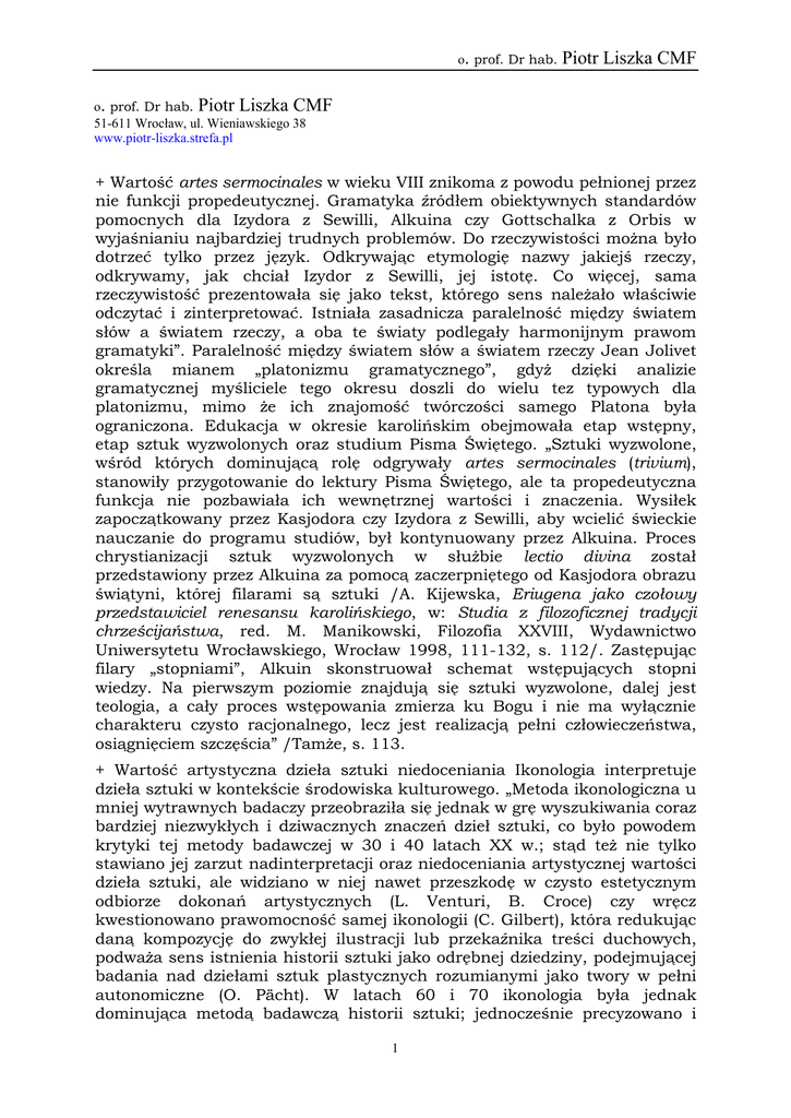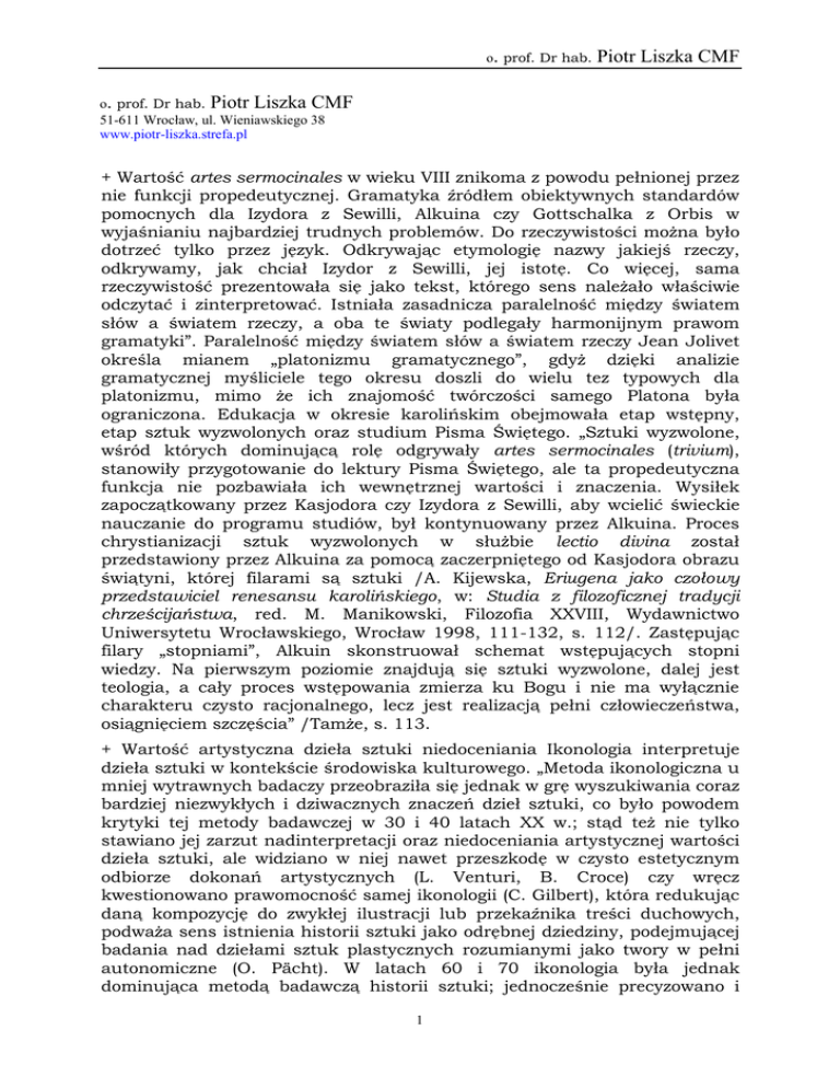 o. prof. Dr hab. Piotr Liszka CMF o. prof. Dr hab. Piotr Liszka CMF 51-611 Wrocław, ul. Wieniawskiego 38 www.piotr-liszka.strefa.pl + Wartość artes sermocinales w wieku VIII znikoma z powodu pełnionej przez nie funkcji propedeutycznej. Gramatyka źródłem obiektywnych standardów pomocnych dla Izydora z Sewilli, Alkuina czy Gottschalka z Orbis w wyjaśnianiu najbardziej trudnych problemów. Do rzeczywistości można było dotrzeć tylko przez język. Odkrywając etymologię nazwy jakiejś rzeczy, odkrywamy, jak chciał Izydor z Sewilli, jej istotę. Co więcej, sama rzeczywistość prezentowała się jako tekst, którego sens należało właściwie odczytać i zinterpretować. Istniała zasadnicza paralelność między światem słów a światem rzeczy, a oba te światy podlegały harmonijnym prawom gramatyki”. Paralelność między światem słów a światem rzeczy Jean Jolivet określa mianem „platonizmu gramatycznego”, gdyż dzięki analizie gramatycznej myśliciele tego okresu doszli do wielu tez typowych dla platonizmu, mimo że ich znajomość twórczości samego Platona była ograniczona. Edukacja w okresie karolińskim obejmowała etap wstępny, etap sztuk wyzwolonych oraz studium Pisma Świętego. „Sztuki wyzwolone, wśród których dominującą rolę odgrywały artes sermocinales (trivium), stanowiły przygotowanie do lektury Pisma Świętego, ale ta propedeutyczna funkcja nie pozbawiała ich wewnętrznej wartości i znaczenia. Wysiłek zapoczątkowany przez Kasjodora czy Izydora z Sewilli, aby wcielić świeckie nauczanie do programu studiów, był kontynuowany przez Alkuina. Proces chrystianizacji sztuk wyzwolonych w służbie lectio divina został przedstawiony przez Alkuina za pomocą zaczerpniętego od Kasjodora obrazu świątyni, której filarami są sztuki /A. Kijewska, Eriugena jako czołowy przedstawiciel renesansu karolińskiego, w: Studia z filozoficznej tradycji chrześcijaństwa, red. M. Manikowski, Filozofia XXVIII, Wydawnictwo Uniwersytetu Wrocławskiego, Wrocław 1998, 111-132, s. 112/. Zastępując filary „stopniami”, Alkuin skonstruował schemat wstępujących stopni wiedzy. Na pierwszym poziomie znajdują się sztuki wyzwolone, dalej jest teologia, a cały proces wstępowania zmierza ku Bogu i nie ma wyłącznie charakteru czysto racjonalnego, lecz jest realizacją pełni człowieczeństwa, osiągnięciem szczęścia” /Tamże, s. 113. + Wartość artystyczna dzieła sztuki niedoceniania Ikonologia interpretuje dzieła sztuki w kontekście środowiska kulturowego. „Metoda ikonologiczna u mniej wytrawnych badaczy przeobraziła się jednak w grę wyszukiwania coraz bardziej niezwykłych i dziwacznych znaczeń dzieł sztuki, co było powodem krytyki tej metody badawczej w 30 i 40 latach XX w.; stąd też nie tylko stawiano jej zarzut nadinterpretacji oraz niedoceniania artystycznej wartości dzieła sztuki, ale widziano w niej nawet przeszkodę w czysto estetycznym odbiorze dokonań artystycznych (L. Venturi, B. Croce) czy wręcz kwestionowano prawomocność samej ikonologii (C. Gilbert), która redukując daną kompozycję do zwykłej ilustracji lub przekaźnika treści duchowych, podważa sens istnienia historii sztuki jako odrębnej dziedziny, podejmującej badania nad dziełami sztuk plastycznych rozumianymi jako twory w pełni autonomiczne (O. Pächt). W latach 60 i 70 ikonologia była jednak dominująca metodą badawczą historii sztuki; jednocześnie precyzowano i 1 o. prof. Dr hab. Piotr Liszka CMF pogłębiano ten sposób analiz; Gombrich podkreślał znaczenie określenia gatunku artystycznego danych dokonań, traktowanego jako swoistą instytucję, czyli specyficzny system obrazowania podległy społecznej akceptacji lub dezaprobacie; M. Imdhal postulował, by w procesie zwanym ikoniką badanie znaczeń stanów przedmiotowych (rozpoznanie tego, co jest przedstawiane) uzupełnić analizą czysto formalnych jakości percepcyjnych, a więc uwzględnić sposób widzenia właściwy odbiorcy dzieła sztuki, co pozwala na dotarcie do najwyższego porządku jego struktur formalnych; O. Bätschmann postrzegał natomiast ikonologię jako wykładnię sensu obrazów, zakorzenionych w określonej wizji kulturowo-antropologicznej” R. Kasperowicz, Ikonologia, w: Encyklopedia Katolicka, T. VII, red. S. Wielgus, TN KUL, Lublin 1997, 15-17, kol. 17. + Wartość artystyczna kazań oprócz wartości ideowej. „Prozę religijną baroku reprezentują 3 podstawowe rodzaje: przekłady Biblii, proza kaznodziejska i traktaty filozoficzno-religijne. Dla każdego kraju Europy okresu baroku przekłady Biblii miały wielkie znaczenie, ale szczególną rolę odegrały w krajach protestanckich, np. w Anglii (nowy przekład Pisma Świętego tzw. Authorized Version 1611). Nieraz słynni pisarze byli tłumaczami Biblii, jak np. F. de Quevedo Villegas. Na kształtowanie się kultury religijnej ogromny wpływ miało kaznodziejstwo. Wygłaszane z ambon, spisywane i drukowane kazania tworzą pokaźną część prozy europejskiej XVII wieku; niektóre, np. J.B. Bossueta we Francji czy P. Skargi w Polsce, mają wyjątkową wartość artystyczną, a nie tylko ideową. Obfitą spuściznę pozostawił barok również w dziedzinie rozpraw i traktatów o charakterze dydaktyczno-moralizatorskim i filozoficzno-religijnym. Autorami tych dzieł byli nie tylko duchowni katoliccy i protestanccy, ale także pisarze świeccy (Quevedo, B. Gracian, Milton). Traktat Miltona De doctrina Christiana, wyrażający nieortodoksyjne stanowisko autora, był odbiciem nurtujących poetę problemów religijnych dotyczących losu człowieka i jego stosunku do dobra i zła. Traktat ten stanowił swoistą kontynuację rozważań podjętych już w poematach: Raj utracony oraz Raj odzyskany. Wybitne dzieło prozy, Myśli B. Pascala, stoi na pograniczu filozofii i literatury, a jednocześnie – dzięki zawartej w nim sławnej „apologii wiary” – przynależy również do literatury religijnej. Ch