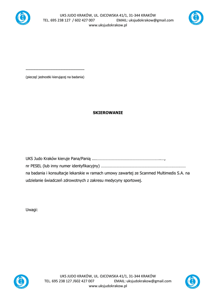 UKS JUDO KRAKÓW, UL. OJCOWSKA 41/1, 31-344 KRAKÓW TEL. 695 238 127 / 602 427 007 EMAIL: [email protected] www.uksjudokrakow.pl ……………………………………………… (pieczęć jednostki kierującej na badania) SKIEROWANIE UKS Judo Kraków kieruje Pana/Panią ....…………………………………………………..…, nr PESEL (lub inny numer identyfikacyjny) …………………………………………………………………… na badania i konsultacje lekarskie w ramach umowy zawartej ze Scanmed Multimedis S.A. na udzielanie świadczeń zdrowotnych z zakresu medycyny sportowej. Uwagi: UKS JUDO KRAKÓW, UL. OJCOWSKA 41/1, 31-344 KRAKÓW TEL. 695 238 127 /602 427 007 EMAIL: [email protected] www.uksjudokrakow.pl