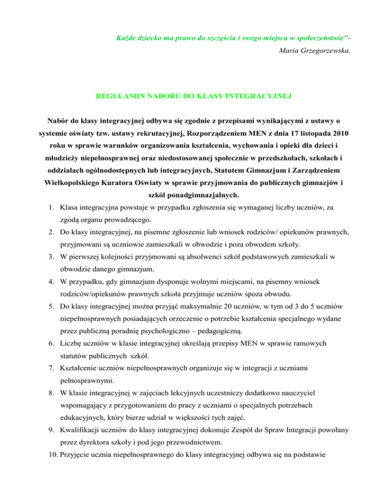 Każde dziecko ma prawo do szczęścia i swego miejsca w społeczeństwie"Maria Grzegorzewska. REGULAMIN NABORU DO KLASY INTEGRACYJNEJ Nabór do klasy integracyjnej odbywa się zgodnie z przepisami wynikającymi z ustawy o systemie oświaty tzw. ustawy rekrutacyjnej, Rozporządzeniem MEN z dnia 17 listopada 2010 roku w sprawie warunków organizowania kształcenia, wychowania i opieki dla dzieci i młodzieży niepełnosprawnej oraz niedostosowanej społecznie w przedszkolach, szkołach i oddziałach ogólnodostępnych lub integracyjnych, Statutem Gimnazjum i Zarządzeniem Wielkopolskiego Kuratora Oświaty w sprawie przyjmowania do publicznych gimnazjów i szkól ponadgimnazjalnych. 1. Klasa integracyjna powstaje w przypadku zgłoszenia się wymaganej liczby uczniów, za zgodą organu prowadzącego. 2. Do klasy integracyjnej, na pisemne zgłoszenie lub wniosek rodziców/ opiekunów prawnych, przyjmowani są uczniowie zamieszkali w obwodzie i poza obwodem szkoły. 3. W pierwszej kolejności przyjmowani są absolwenci szkół podstawowych zamieszkali w obwodzie danego gimnazjum. 4. W przypadku, gdy gimnazjum dysponuje wolnymi miejscami, na pisemny wniosek rodziców/opiekunów prawnych szkoła przyjmuje uczniów spoza obwodu. 5. Do klasy integracyjnej można przyjąć maksymalnie 20 uczniów, w tym od 3 do 5 uczniów niepełnosprawnych posiadających orzeczenie o potrzebie kształcenia specjalnego wydane przez publiczną poradnię psychologiczno – pedagogiczną. 6. Liczbę uczniów w klasie integracyjnej określają przepisy MEN w sprawie ramowych statutów publicznych szkół. 7. Kształcenie uczniów niepełnosprawnych organizuje się w integracji z uczniami pełnosprawnymi. 8. W klasie integracyjnej w zajęciach lekcyjnych uczestniczy dodatkowo nauczyciel wspomagający z przygotowaniem do pracy z uczniami o specjalnych potrzebach edukacyjnych, który bierze udział w większości tych zajęć. 9. Kwalifikacji uczniów do klasy integracyjnej dokonuje Zespół do Spraw Integracji powołany przez dyrektora szkoły i pod jego przewodnictwem. 10. Przyjęcie ucznia niepełnosprawnego do klasy integracyjnej odbywa się na podstawie aktualnego orzeczenia o potrzebie kształcenia specjalnego wydanego przez publiczną poradnię psychologiczno – pedagogiczną. 11. W stosunku do kandydatów do klasy integracyjnej, bez orzeczenia o potrzebie kształcenia specjalnego wydanego ze względu na niepełnosprawność stosuje się ogólne przepisy rekrutacyjne i kryteria naboru zawarte w regulaminie rekrutacji. 12. Do klasy integracyjnej, w przypadku uczniów pełnosprawnych, w pierwszej kolejności przejmowani są uczniowie z zachowaniem co najmniej dobrym. 13. Przyjęcie uczniów do klasy integracyjnej odbywa się na zasadzie dobrowolności, po złożeniu dokumentów określonych w informacji o naborze na dany rok szkolny, w sekretariacie szkoły. 14. Informacji dotyczących naboru do klasy integracyjnej oraz jej funkcjonowania udziela dyrektor szkoły i pedagog szkolny. WYMAGANE DOKUMENTY KANDYDATA: 1. Zgłoszenie/ wniosek o przyjęcie dziecka do gimnazjum. 2. Zdjęcie na legitymację szkolną. 3. Świadectwo ukończenia szkoły podstawowej w postaci kopii poświadczonej za zgodność z oryginałem przez dyrektora szkoły, którą kandydat ukończył. 4. Zaświadczenie o wynikach sprawdzianu przeprowadzonego w ostatnim roku nauki w szkole podstawowej w postaci kopii poświadczonej za zgodność z oryginałem przez dyrektora szkoły, którą kandydat ukończył. 5. Kserokopie dyplomów potwierdzające osiągnięcia ucznia. 6. Karta zdrowia ucznia. 7. Orzeczenie poradni psychologiczno - pedagogicznej o potrzebie kształcenia specjalnego ze względu na niepełnosprawność, 8. Uczniowie spoza obwodu w przypadku ograniczonej liczby wolnych miejsc winni dostarczyć dokumenty potwierdzające spełnienie przez kandydata kryteriów zawartych w niniejszym regulaminie rekrutacji w § 2. 9. Oświadczenie o wyrażeniu zgody na przetwarzanie danych osobowych. 10. Oświadczenie zawierające klauzule dotyczącą składania fałszywych zeznań. Dokumenty należy składać w sekretariacie szkoły zgodnie z ustalonym terminarzem. Wzory dokumentów dostępne są w sekretariacie szkoły oraz na stronie internetowej szkoły www.gimrzgow.com.pl NA CZYM POLEGA INTEGRACJA W SZKOLE? Kształcenie integracyjne polega na organizacji wspólnego kształcenia dzieci i młodzieży zdrowych z dziećmi i młodzieżą o specjalnych potrzebach edukacyjnych posiadających orzeczenie publicznej poradni psychologiczna – pedagogicznej o potrzebie kształcenia specjalnego ze względu na niepełnosprawność ruchową, niepełnosprawnością sprzężoną oraz dzieci niedowidzących, niedosłyszących, upośledzonych umysłowo w stopniu lekkim, z autyzmem i zespołem Aspergera. DLACZEGO WARTO WYBRAĆ KLASĘ INTEGRACYJNĄ? Wybór odpowiedniej klasy to niezwykle trudna decyzja dla wszystkich rodziców. Niewątpliwymi zaletami kształcenia integracyjnego są: zaspokojenie indywidualnych potrzeb emocjonalnych, społecznych i edukacyjnych każdego dziecka, zapewnienie każdemu dziecku poczucia bezpieczeństwa i akceptacji, kształtowanie pozytywnych relacji w klasie w oparciu o integrację uczniów, kształtowanie samodzielności uczniów niepełnosprawnych, opieka dwóch pedagogów, mała liczebność grupy klasowej, dostosowanie wymagań do indywidualnych potrzeb i możliwości dziecka, możliwość wszechstronnego rozwoju możliwości i potencjału dziecka, brak podziału uczniów na pełnosprawnych i niepełnosprawnych, dostrzeganie w każdym dziecku zdolności i rozwijanie ich, ścisła współpraca z rodzicami, wspieranie uczniów i ich rodziców w przezwyciężaniu trudności szkolnych i wychowawczych, przełamanie stereotypów dotyczących podejścia do kształcenia dziecka niepełnosprawnego. ORGANIZACJA PRACY W KLASACH INTEGRACYJNYCH: 1. W klasie integracyjnej realizowany jest takim sam program nauczania szkoły masowej, jak w każdej inne