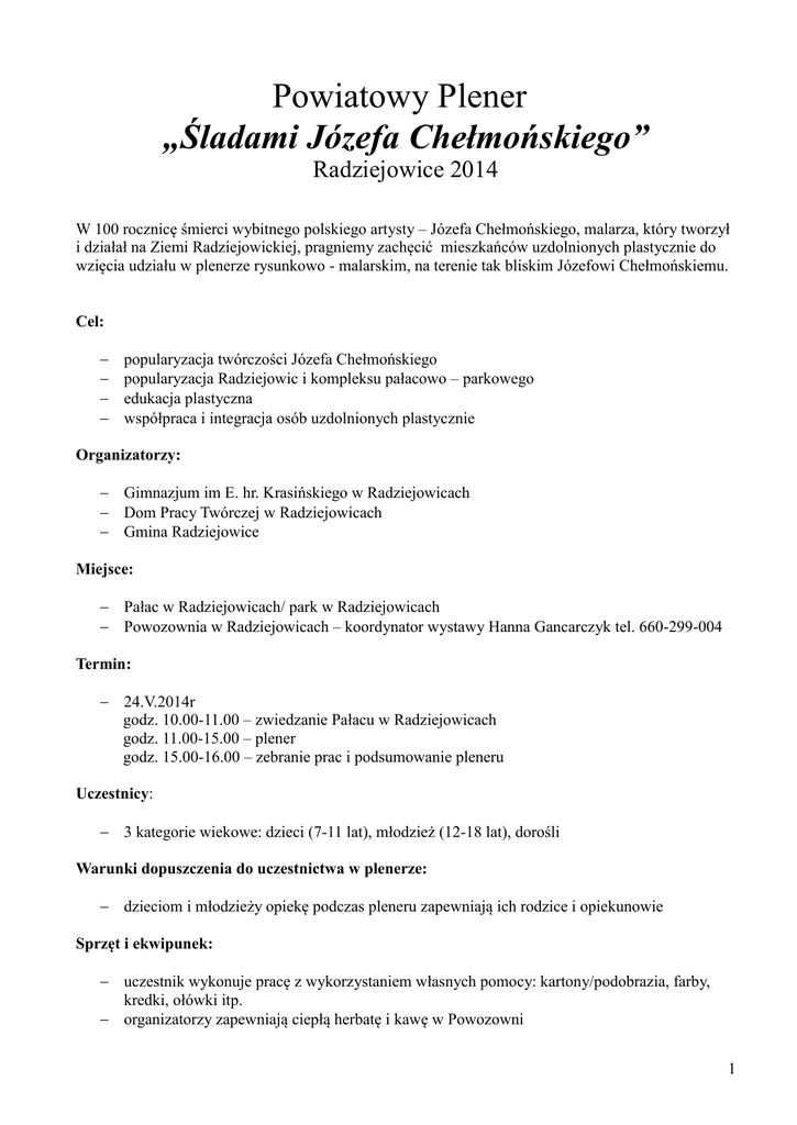 Powiatowy Plener „Śladami Józefa Chełmońskiego” Radziejowice 2014 W 100 rocznicę śmierci wybitnego polskiego artysty – Józefa Chełmońskiego, malarza, który tworzył i działał na Ziemi Radziejowickiej, pragniemy zachęcić mieszkańców uzdolnionych plastycznie do wzięcia udziału w plenerze rysunkowo - malarskim, na terenie tak bliskim Józefowi Chełmońskiemu. Cel: popularyzacja twórczości Józefa Chełmońskiego popularyzacja Radziejowic i kompleksu pałacowo – parkowego edukacja plastyczna współpraca i integracja osób uzdolnionych plastycznie Organizatorzy: Gimnazjum im E. hr. Krasińskiego w Radziejowicach Dom Pracy Twórczej w Radziejowicach Gmina Radziejowice Miejsce: Pałac w Radziejowicach/ park w Radziejowicach Powozownia w Radziejowicach – koordynator wystawy Hanna Gancarczyk tel. 660-299-004 Termin: 24.V.2014r godz. 10.00-11.00 – zwiedzanie Pałacu w Radziejowicach godz. 11.00-15.00 – plener godz. 15.00-16.00 – zebranie prac i podsumowanie pleneru Uczestnicy: 3 kategorie wiekowe: dzieci (7-11 lat), młodzież (12-18 lat), dorośli Warunki dopuszczenia do uczestnictwa w plenerze: dzieciom i młodzieży opiekę podczas pleneru zapewniają ich rodzice i opiekunowie Sprzęt i ekwipunek: uczestnik wykonuje pracę z wykorzystaniem własnych pomocy: kartony/podobrazia, farby, kredki, ołówki itp. organizatorzy zapewniają ciepłą herbatę i kawę w Powozowni 1 Wystawa poplenerowa: 31 maja 2014r między godz. 13-19 wybrane prace przez komisje, będą eksponowane na uroczystości z okazji Dnia Dziecka na terenie Szkoły Podstawowej im. J. Chełmońskiego w Kuklówce Radziejowickiej, podczas uroczystości zostaną rozdane nagrody za najlepsze prace wybrane przez komisję każdy z uczestników pleneru otrzyma dyplom prace należy odebrać do 18 czerwca 2014r w Powozowni, nieodebrane prace przechodzą na własność organizatorów organizatorzy mają prawo dysponowania pracami wedle uznania, w celach promocyjnych organizatorzy nie ponoszą odpowiedzialności za zaginięcie, czy zniszczenie prac podczas ich prezentacji na święcie Dnia Dziecka w Kuklówce Radziejowickiej Postanowienia końcowe: udział w plenerze jest jednoznaczny z zaakceptowaniem regulaminu decyzje Organizatorów pleneru są ostatecznie i nie podlegają weryfikacji 2