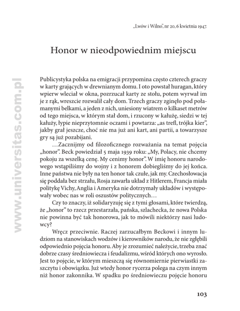 „Lwów i Wilno”, nr , kwietnia . www.universitas.com.pl Honor w nieodpowiednim miejscu Publicystyka polska na emigracji przypomina często czterech graczy w karty grających w drewnianym domu. I oto powstał huragan, który wpierw wleciał w okna, pozrzucał karty ze stołu, potem wyrwał im je z rąk, wreszcie rozwalił cały dom. Trzech graczy zginęło pod połamanymi belkami, a jeden z nich, uniesiony wiatrem o kilkaset metrów od tego miejsca, w którym stał dom, i rzucony w kałużę, siedzi w tej kałuży, łypie nieprzytomnie oczami i powtarza: „as trefl, trójka kier”, jakby grał jeszcze, choć nie ma już ani kart, ani partii, a towarzysze gry są już pozabijani. …Zacznijmy od filozoficznego rozważania na temat pojęcia „honor”. Beck powiedział maja roku: „My, Polacy, nie chcemy pokoju za wszelką cenę. My cenimy honor”. W imię honoru narodowego wstąpiliśmy do wojny i z honorem dobiegliśmy do jej końca. Inne państwa nie były na ten honor tak czułe, jak my. Czechosłowacja się poddała bez strzału, Rosja zawarła układ z Hitlerem, Francja miała politykę Vichy, Anglia i Ameryka nie dotrzymały układów i występowały wobec nas w roli oszustów politycznych… Czy to znaczy, iż solidaryzuję się z tymi głosami, które twierdzą, że „honor” to rzecz przestarzała, pańska, szlachecka, że nowa Polska nie powinna być tak honorowa, jak to mówili niektórzy nasi ludowcy? Wręcz przeciwnie. Raczej zarzucałbym Beckowi i innym ludziom na stanowiskach wodzów i kierowników narodu, że nie zgłębili odpowiednio pojęcia honoru. Aby je zrozumieć należycie, trzeba znać dobrze czasy średniowiecza i feudalizmu, wśród których ono wyrosło. Jest to pojęcie, w którym mieszczą się równomiernie pierwiastki zaszczytu i obowiązku. Już wtedy honor rycerza polega na czym innym niż honor zakonnika. W spadku po średniowieczu pojęcie honoru www.universitas.com.pl dotrwało do czasów łodzi podwodnych i oto zwyczajem marynarzy wojennych kapitan ginie ze swoim statkiem. W Japonii generał, który naraził wojsko na klęskę, popełnia sam samobójstwo według odpowiedniego rytuału, ale żaden z samurajów, którym wspaniałego poczucia czci nikt nie odmówi, nie wzywa swego kraju, swej Ojczyzny, do popełnienia samobójstwa w imię narodowego honoru. Honor szlachcica japońskiego jest inny, honor państwa inny, honor żołnierza znów powinien być inny od honoru dyplomaty. Pisałem już w artykule Echa kopyt spod Guadarramy, że Beck nie wiedział, że honor ministra spraw zagranicznych jest różny od honoru pułkownika artylerii. Honor tego ostatniego wymaga, by poległ wśród swoich armat, gdy tego zajdzie potrzeba, honor ministra spraw zagranicznych wymaga, by nie dopuścił do takiej wojny, w której naród jego nie może znaleźć innego losu prócz klęski. Wiemy już teraz niezbicie, że Beck swoją polityką w czasie kryzysu czeskiego, swoim przyjęciem bezwartościowych gwarancji angielskich wprowadził nasz kraj niepotrzebnie i przedwcześnie na pierwszą linię ognia, z której już się nie wraca. Niestety musimy sformułować straszliwe oskarżenie, że jego dumne odwołanie się do honoru narodowego było tylko parawanem, tylko przykryciem jego własnej dyplomatycznej nieudolności i niezgrabności, względnie fatalnych błędów. Piłsudski był niewątpliwie człowiekiem o wiele czulszym na pojęcie honoru i lepiej je rozumiał niż wszyscy jego epigonowie razem wzięci. A jednak Piłsudski, gdy mu się w roku nie udała akcja wywołania wojny prewencyjnej z Hitlerem, gdy zrozumiał, że nie otrzyma w tej wojnie dostatecznego poparcia innych państw, to wycofał się z tych planów w sposób bardzo stanowczy, zamiast deklamować o honorze. Jeszcze przykrzejsze było to, że ci sami panowie, którzy tak łatwo apelowali do honoru narodowego, nie rozumieli, że przez to samo angażują honor osobisty, własny. Nikt z nich nie naśladował samurajów, nikt nie przyjął cyjanku potasu, jak to, chcąc czy nie chcąc, uczynili zbirowie i mordercy niemieccy, gdy uświadomili sobie, że stoczyli kraj swój do przepaści. Zbyt głośno u nas angażowano honor narodu, może jednak zbyt mało myślano o honorze własnym. www.universitas.com.pl Niegdyś byłem jednym z tych, którzy układali konstytucję dla Polski. Gdybym jeszcze kiedykolwiek w życiu był powołany do roboty podobnej, tobym się upierał, żeby w niej znalazły miejsce postanowienia następujące: Minister spraw zagranicznych winny uwikłania kraju w wojnę klęskową zostanie rozstrzelany. Wódz naczelny wyrażający zgodę na wojnę, która w następstwie została przegrana, zostanie rozstrzelany. Komuś mogą się wydać te postanowienia zbyt brutalne. Ależ one są konieczne. Bez nich pojęcie odpowiedzialności staje się pustym dźwiękiem. Mówiło się u nas: nie wolno go krytykować, bo on ponosi odpowiedzialność. Dobrze. Ale w czymże później wyraziła się ta odpowiedzialność? Za błędne działania kierowników odpowiedział cały kraj, a niektórzy ludzie, winni naszych nieszczęść, wciąż nas jeszcze pouczają, co robić trzeba. Wróćmy jednak do przykrego tematu z cyjankiem potasu. Ludziom, którzy, tak jak ja, przeżyli wojnę pod kloszem londyńskiego spokoju, wszystko, co się działo w Oświęcimiu i Ravensbrück, w Warszawie, Katyniu, czy na półwyspie Kola, wydaje się jakąś koszmarną, krwawą, kręcącą się przed oczami w wariacki sposób niezrozumiałą masą i z początku oczy nasze nic w tej masie nie odróżniają, nic nie rozumieją. Wiedziałem już przed wojną, że naród rosyjski zachorował zbiorowo na jakąś straszną chorobę psychiczną, w czasie wojny zobaczyliśmy naród niemiecki jak bestię z oszalałymi oczyma, wypełnionymi żądzą zbrodni. Dopiero później wyłapujemy z całości tego szaleństwa jakieś pojedyncze fragmenty, nad którymi, jak świst wiatru, góruje niezrównane bohaterstwo naszej m
