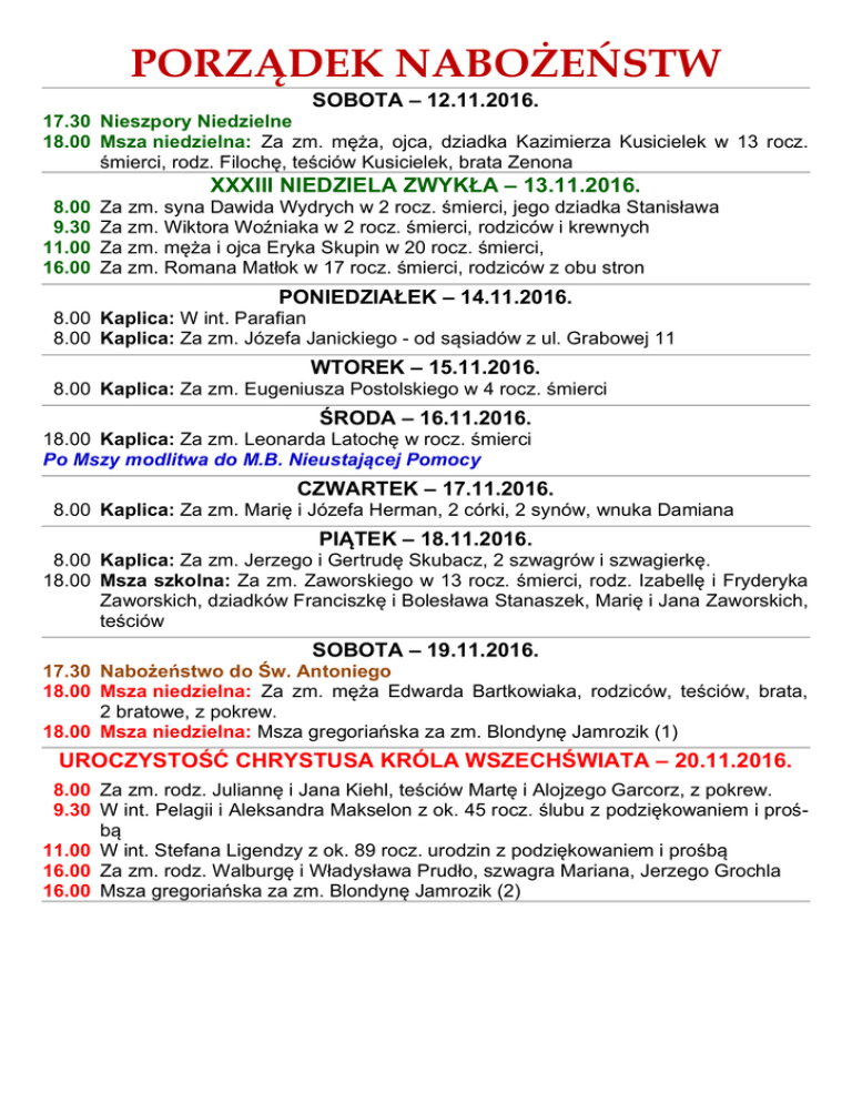 PORZĄDEK NABOŻEŃSTW SOBOTA – 12.11.2016. 17.30 Nieszpory Niedzielne 18.00 Msza niedzielna: Za zm. męża, ojca, dziadka Kazimierza Kusicielek w 13 rocz. śmierci, rodz. Filochę, teściów Kusicielek, brata Zenona XXXIII NIEDZIELA ZWYKŁA – 13.11.2016. 8.00 9.30 11.00 16.00 Za zm. syna Dawida Wydrych w 2 rocz. śmierci, jego dziadka Stanisława Za zm. Wiktora Woźniaka w 2 rocz. śmierci, rodziców i krewnych Za zm. męża i ojca Eryka Skupin w 20 rocz. śmierci, Za zm. Romana Matłok w 17 rocz. śmierci, rodziców z obu stron PONIEDZIAŁEK – 14.11.2016. 8.00 Kaplica: W int. Parafian 8.00 Kaplica: Za zm. Józefa Janickiego - od sąsiadów z ul. Grabowej 11 WTOREK – 15.11.2016. 8.00 Kaplica: Za zm. Eugeniusza Postolskiego w 4 rocz. śmierci ŚRODA – 16.11.2016. 18.00 Kaplica: Za zm. Leonarda Latochę w rocz. śmierci Po Mszy modlitwa do M.B. Nieustającej Pomocy CZWARTEK – 17.11.2016. 8.00 Kaplica: Za zm. Marię i Józefa Herman, 2 córki, 2 synów, wnuka Damiana PIĄTEK – 18.11.2016. 8.00 Kaplica: Za zm. Jerzego i Gertrudę Skubacz, 2 szwagrów i szwagierkę. 18.00 Msza szkolna: Za zm. Zaworskiego w 13 rocz. śmierci, rodz. Izabellę i Fryderyka Zaworskich, dziadków Franciszkę i Bolesława Stanaszek, Marię i Jana Zaworskich, teściów SOBOTA – 19.11.2016. 17.30 Nabożeństwo do Św. Antoniego 18.00 Msza niedzielna: Za zm. męża Edwarda Bartkowiaka, rodziców, teściów, brata, 2 bratowe, z pokrew. 18.00 Msza niedzielna: Msza gregoriańska za zm. Blondynę Jamrozik (1) UROCZYSTOŚĆ CHRYSTUSA KRÓLA WSZECHŚWIATA – 20.11.2016. 8.00 Za zm. rodz. Juliannę i Jana Kiehl, teściów Martę i Alojzego Garcorz, z pokrew. 9.30 W int. Pelagii i Aleksandra Makselon z ok. 45 rocz. ślubu z podziękowaniem i prośbą 11.00 W int. Stefana Ligendzy z ok. 89 rocz. urodzin z podziękowaniem i prośbą 16.00 Za zm. rodz. Walburgę i Władysława Prudło, szwagra Mariana, Jerzego Grochla 16.00 Msza gregoriańska za zm. Blondynę Jamrozik (2)