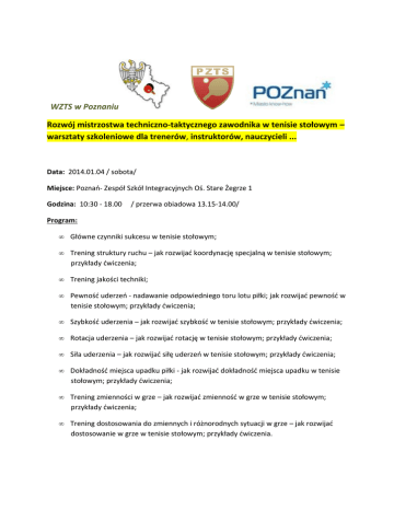 WZTS w Poznaniu Rozwój mistrzostwa techniczno-taktycznego zawodnika w tenisie stołowym – warsztaty szkoleniowe dla trenerów, instruktorów, nauczycieli ... Data: 2014.01.04 / sobota/ Miejsce: Poznań- Zespół Szkół Integracyjnych Oś. Stare Żegrze 1 Godzina: 10:30 - 18.00 / przerwa obiadowa 13.15-14.00/ Program: • Główne czynniki sukcesu w tenisie stołowym; • Trening struktury ruchu – jak rozwijać koordynację specjalną w tenisie stołowym; przykłady ćwiczenia; • Trening jakości techniki; • Pewność uderzeń - nadawanie odpowiedniego toru lotu piłki; jak rozwijać pewność w tenisie stołowym; przykłady ćwiczenia; • Szybkość uderzenia – jak rozwijać szybkość w tenisie stołowym; przykłady ćwiczenia; • Rotacja uderzenia – jak rozwijać rotację w tenisie stołowym; przykłady ćwiczenia; • Siła uderzenia – jak rozwijać siłę uderzeń w tenisie stołowym; przykłady ćwiczenia; • Dokładność miejsca upadku piłki - jak rozwijać dokładność miejsca upadku w tenisie stołowym; przykłady ćwiczenia; • Trening zmienności w grze – jak rozwijać zmienność w grze w tenisie stołowym; przykłady ćwiczenia; • Trening dostosowania do zmiennych i różnorodnych sytuacji w grze – jak rozwijać dostosowanie w grze w tenisie stołowym; przykłady ćwiczenia. Prowadzący: Jerzy Grycan Table Tennis; Integralny tenis stołowy; Organizator: - Wielkopolski Związek Tenisa Stołowego w Poznaniu - Polski Związek Tenisa Stołowego - Urząd Miasta Poznania Uwaga: Uczestnictwo bezpłatne. Każdy uczestnik otrzyma certyfikat uczestnictwa. Prosimy o potwierdzenie uczestnictwa i ewentualną rezerwację obiadu / cena 16,- zł/ [email protected] Prezes WZTS w Poznaniu /- / Tadeusz Nowak