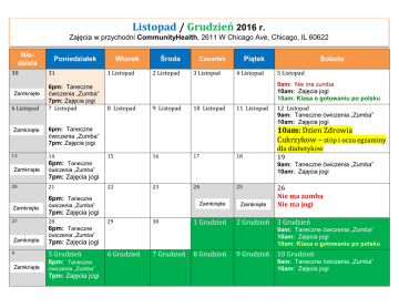 Listopad / Grudzień 2016 r. Zajęcia w przychodni CommunityHealth, 2611 W Chicago Ave, Chicago, IL 60622 Niedziela 30 Zamknięte 6 Listopad Zamknięte 13 Poniedziałek 31 6pm: Taneczne ćwiczenia „Zumba” 7pm: Zajęcia jogi 7 Listopad Wtorek 1 Listopad Środa 2 Listopad Piątek Czwartek 3 Listopad 4 Listopad 8 Listopad 9 Listopad 10 Listopad 11 Listopad 15 16 17 18 21 22 23 6pm: Taneczne Zamknięte 27 4 Zamknięte 24 Zamknięte ćwiczenia „Zumba” 25 Zamknięte 26 Nie ma zumba Nie ma jogi 7pm: Zajęcia jogi 28 29 30 6pm: Taneczne Zamknięte dla diabetyków 19 9am: Taneczne ćwiczenia „Zumba” 10am: Zajęcia jogi ćwiczenia „Zumba” 7pm: Zajęcia jogi 20 12 Listopad 9am: Taneczne ćwiczenia „Zumba” 10am: Zajęcia jogi 10am: Dzien Zdrowia Cukrzykow – stóp i oczu egzaminy 6pm: Taneczne Zamknięte 5 Listopad 9am: Nie ma zumba 10am: Zajęcia jogi 10am: Klasa o gotowaniu po polsku 6pm: Taneczne ćwiczenia „Zumba” 7pm: Zajęcia jogi 14 Sobota 1 Grudzień 2 Grudzień 9am: Taneczne ćwiczenia „Zumba” 10am: Zajęcia jogi 10am: Klasa o gotowaniu po polsku ćwiczenia „Zumba” 7pm: Zajęcia jogi 5 Grudzień 6pm: Taneczne ćwiczenia „Zumba” 7pm: Zajęcia jogi 3 Grudzień 6 Grudzień 7 Grudzień 8 Grudzień 9 Grudzień 10 Grudzień 9am: Taneczne ćwiczenia „Zumba” 10am: Zajęcia jogi