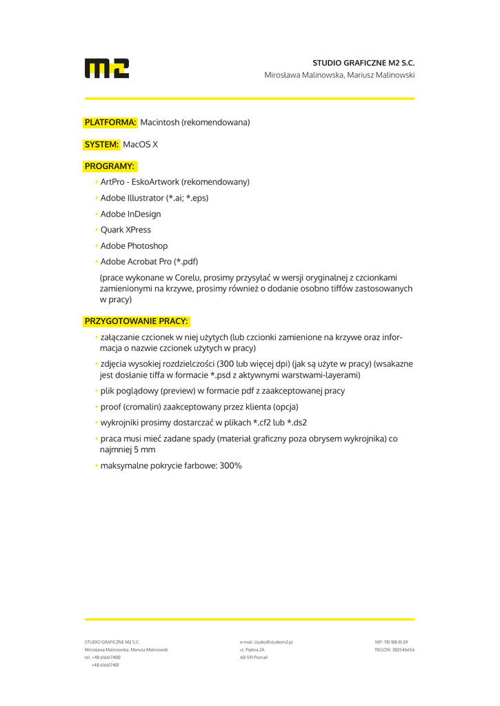 STUDIO GRAFICZNE M2 S.C. Mirosława Malinowska, Mariusz Malinowski PLATFORMA: Macintosh (rekomendowana) SYSTEM: MacOS X PROGRAMY: • ArtPro - EskoArtwork (rekomendowany) • Adobe Illustrator (*.ai; *.eps) • Adobe InDesign • Quark XPress • Adobe Photoshop • Adobe Acrobat Pro (*.pdf) (prace wykonane w Corelu, prosimy przysyłać w wersji oryginalnej z czcionkami zamienionymi na krzywe, prosimy również o dodanie osobno tiffów zastosowanych w pracy) PRZYGOTOWANIE PRACY: • załączanie czcionek w niej użytych (lub czcionki zamienione na krzywe oraz informacja o nazwie czcionek użytych w pracy) • zdjęcia wysokiej rozdzielczości (300 lub więcej dpi) (jak są użyte w pracy) (wsakazne jest dosłanie tiffa w formacie *.psd z aktywnymi warstwami-layerami) • plik poglądowy (preview) w formacie pdf z zaakceptowanej pracy • proof (cromalin) zaakceptowany przez klienta (opcja) • wykrojniki prosimy dostarczać w plikach *.cf2 lub *.ds2 • praca musi mieć zadane spady (materiał graficzny poza obrysem wykrojnika) co najmniej 5 mm • maksymalne pokrycie farbowe: 300% STUDIO GRAFICZNE M2 S.C. e-mail: [email protected] NIP: 781 188 81 29 Mirosława Malinowska, Mariusz Malinowski ul. Piękna 2A REGON: 302546656 tel. +48 616617400 60-591 Poznań +48 616617401