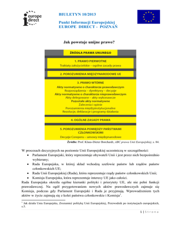 BIULETYN 10/2013 Punkt Informacji Europejskiej EUROPE DIRECT - POZNAŃ Jak powstaje unijne prawo? Źródło: Prof. Klaus-Dieter Borchardt, ABC prawa Unii Europejskiej, s. 84. W procesach decyzyjnych na poziomie Unii Europejskiej uczestniczą w szczególności: Parlament Europejski, który reprezentuje obywateli Unii i jest przez nich bezpośrednio wybierany; Rada Europejska, w której skład wchodzą szefowie państw lub rządów państw członkowskich UE; Rada Unii Europejskiej (Rada), która reprezentuje rządy państw członkowskich Unii; Komisja Europejska, która reprezentuje interesy UE jako całości. Rada Europejska określa ogólne kierunki polityki i priorytety UE, ale nie pełni funkcji prawodawczej. Na ogół przygotowaniem nowych aktów prawodawczych zajmuje się Komisja, podczas gdy Parlament Europejski i Rada je przyjmują. Wprowadzeniem tych aktów w życie zajmują się z kolei państwa członkowskie i Komisja1. 1 Jak działa Unia Europejska, Zrozumieć politykę Unii Europejskiej, Przewodnik po instytucjach europejskich, s.5. 1|Strona BIULETYN 10/2013 Punkt Informacji Europejskiej EUROPE DIRECT - POZNAŃ I. Tworzenie prawa pierwotnego Przez tworzenie prawa pierwotnego rozumie się zawieranie nowych traktatów albo dokonywanie uzupełnień lub zmian w już istniejących traktatach, na których opiera się Unia Europejska (Traktat o Unii Europejskiej i Traktat o funkcjonowaniu Unii Europejskiej, protokoły i deklaracje do tych traktatów)2. Procedura dokonywania zmian w prawie pierwotnym uregulowana jest w art. 48 Traktatu o Unii Europejskiej (TUE). Zgodnie z jego postanowieniami, inicjatywa w omawianym zakresie przysługuje rządowi każdego z państw członkowskich oraz Komisji Europejskiej i Parlamentowi Europejskiemu: „Rząd każdego Państwa Członkowskiego, Parlament Europejski lub Komisja mogą przedkładać Radzie propozycje zmiany Traktatów. Propozycje te mogą mieć na celu, między innymi, rozszerzenie lub ograniczenie kompetencji przyznanych Unii w Traktatach. Propozycje te są przekazywane przez Radę Radzie Europejskiej oraz notyfikowane parlamentom narodowym.” Forum dla przygotowywania zmian w traktatach stanowi konferencja przedstawicieli państw członkowskich, nazywana Konferencją Międzyrządową. Decyzje w sprawie zwołania takiej konferencji podejmuje Rada Europejska zwykłą większością głosów, po zasięgnięciu opinii Parlamentu Europejskiego, Komisji Europejskiej a jeżeli zmiany miałyby dotyczyć kwestii instytucjonalnych w dziedzinie walutowej – także Europejskiego Banku Centralnego. Zmiany traktatowe uzgadniane są w trakcie Konferencji Międzyrządowej „za wspólnym porozumieniem” państw członkowskich, czyli po uzyskaniu jednomyślności w toku przeprowadzonych negocjacji. Nowy traktat podpisywany jest przez przedstawicieli wszystkich państw członkowskich, a następnie podlega ratyfikacji, zgodnie z wymogami konstytucyjnymi poszczególnych państw. Warunkiem wejścia nowego traktatu w życie jest zakończenie procedury ratyfikacyjnej przez wszystkie państwa członkowskie. Zmiany w prawie pierwotnym mogą następować także w wyniku zawierania traktatów o przystąpieniu do Unii Europejskiej nowego państwa/nowych państw członkowskich, czyli tzw. traktatów akcesyjnych. 3 II. Tworzenie prawa pochodnego (wtórnego) Unijne prawo wtórne to drugie ważne źródło prawa UE, utworzone przez instytucje unijne na podstawie przekazanych im kompetencji. Na prawo wtórne składają się z akty prawodawcze, delegowane akty prawne, akty wykonawcze oraz inne działania prawne. 2 Opis wszystkich wspólnotowych traktatów dostępny jest na http://europa.eu/about-eu/basicinformation/decision-making/treaties/index_pl.htm 3 http://www.mpips.gov.pl/userfiles/File/mps/koordynacja/decyd.pdf, s.10 oraz http://europa.eu/legislation_summaries/institutional_affairs/treaties/lisbon_treaty/ai0013_pl.htm 2|Strona BIULETYN 10/2013 Punkt Informacji Europejskiej EUROPE DIRECT - POZNAŃ „Akty prawodawcze” stanowią akty przyjmowane w drodze zwykłej lub specjalnej procedury prawodawczej (art. 289 TFUE). „Akty delegowane” to akty prawne o charakterze nieprawodawczym o zasięgu ogólnym, które uzupełniają lub zmieniają niektóre elementy aktu ustawodawczego. Akty takie może przyjmować Komisja, wyraźnie upoważniona do tego w akcie ustawodawczym. „Akty wykonawcze” stanowią wyjątek od reguły, zgodnie z którą wszystkie środki, niezbędne do wykonania wiążących aktów prawnych UE, są podejmowane przez państwa członkowskie zgodnie z ustawodawstwem krajowym.4 Do aktów prawa wtórnego zaliczamy zgodnie z art. 288 TFUE rozporządzenia, dyrektywy, decyzje, zalecenia i opinie. Rozporządzenie ma zasięg ogólny. Wiąże w całości i jest bezpośrednio stosowane we wszystkich Państwach Członkowskich. Dyrektywa wiąże każde Państwo Członkowskie, do którego jest kierowana, w odniesieniu do rezultatu, który ma być osiągnięty, pozostawia jednak organom krajowym swobodę wyboru form i środków osiągnięcia tych celów. Decyzja, która wskazuje adresatów, wiąże tylko tych adresatów. Zalecenia i opinie nie mające mocy wiążącej5. Procedury legislacyjne Artykuł 289 Traktatu o funkcjonowaniu Unii Europejskiej wymienia dwa rodzaje procedur ustawodawczych: zwykłą procedurę ustawodawczą6, specjalne procedury ustawodawcze. Ponadto traktat lizboński wprowadza klauzule pomostowe. Zwykła procedura ustawodawcza Zwykła procedura ustawodawcza zastępuje dawną procedurę współdecydowania. Procedura ta jest najbardziej prawowita z demokratycznego punktu widzenia. Zakłada uczestnictwo Parlamentu Europejskiego, działającego obok Rady jako współustawodawca. Traktat lizboński rozszerzył zwykłą procedurę ustawodawczą na nowe dziedziny polityczne. Przebieg i zasady zwykłej procedury ustawodawczej są takie same, jak w dawnej procedurze współdecydowania. Opisane są one szczegółowo w art. 294 Traktatu o funkcjo