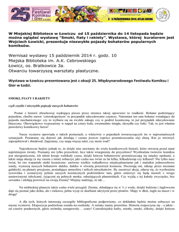 W Miejskiej Bibliotece w Łowiczu od 15 października do 14 listopada będzie można oglądać wystawę "Smoki, fiaty i rakiety”. Wystawa, której kuratorem jest Wojciech Łowicki, prezentuje niezwykłe pojazdy bohaterów popularnych komiksów. Wernisaż wystawy 15 październik 2014 r. godz. 10 Miejska Biblioteka im. A.K. Cebrowskiego Łowicz, os. Bratkowice 3a. Otwarciu towarzyszą warsztaty plastyczne. Wystawa w Łowiczu prezentowana jest z okazji 25. Międzynarodowego Festiwalu Komiksu i Gier w Łodzi. SMOKI, FIATY I RAKIETY czyli zwykłe i niezwykłe pojazdy naszych bohaterów Postać z historii obrazkowej wędrująca pieszo przez stronice takiej opowieści to rzadkość. Bohater podróżujący pojazdem, choćby nawet ‘czterokopytnym’ to przypadek zdecydowanie częstszy. Natomiast ten sam bohater wsiadający do pojazdu mechanicznego: czy to wybiera się na zwykłe zakupy czy w podróż kosmiczną, to już przypadek zdecydowanie klasyczny. Obowiązkowo wyposażony w napęd na cztery koła, ewentualnie śmigła, skrzydła czy lotki. Tak, to jest właśnie prawdziwy komiksowy heros! Nasza wystawa opowiada o takich postaciach, a właściwie o pojazdach towarzyszących im w najrozmaitszych sytuacjach. Postaramy się dojrzeć jak działają i czemu jeszcze (oprócz przemieszczania się) służą. Kto je stworzył, zaprojektował i zbudował. Zapytamy, czy mają więcej zalet, czy może wad? Najciekawsze będzie jednak to, że dzięki nim zawitamy do wielu komiksowych historii, które otworzą przed nami najróżniejsze światy. Poznamy nie tylko przeszłość, lecz także wtargniemy do przyszłości! Wyobraźnia twórców komiksu jest nieograniczona, ich talent kreuje wehikuły czasu, dzięki którym bohaterowie przemieszczają się między epokami, a także mają okazję (a my razem z nimi) zobaczyć jaki czeka nas świat za lat kilka, kilkadziesiąt czy kilkaset! Nie tylko nasz świat, bo oto wspaniałe statki kosmiczne: zarówno wielkie wahadłowce międzyplanetarne jak i malutkie jednoosobowe sondy, wynoszą naszych bohaterów daleko, daleko w otwartą przestrzeń kosmosu. Docierają oni, mknąc przez nieznane galaktyki, na planety przyjazne, posiadające atmosferę i miłych mieszkańców. By zaostrzyć akcję, zdarza się, że wyobraźnia rysownika i scenarzysty pchnie naszych kosmicznych podróżników tam, gdzie zmierzyć się będą musieli z wrogo nastawionymi tubylcami, żyjącymi na pełnych mroku, odrażających planetoidach. Czy wyjdą z tej kabały zwycięsko, bez szwanku i zdołają powrócić na swoją Ziemię? Miejmy nadzieję, że tak… Na niebieskiej planecie także czeka wiele przygód. Ziemia, składająca się w ¾ z wody, dzięki łodziom i żaglowcom daje się poznać jako dzika, ale i ciekawa, pełna wysp ze skarbami ukrytymi przez piratów. Mapy w dłoń, żagle na maszt i w drogę! A dla tych, których interesują szczegóły bibliograficzne podpowiemy, co dokładnie będzie można zobaczyć na naszej wystawie. Ekspozycja podzielona została na rozdziały. A tematy mamy przeróżne. Historia rozpoczyna się - a jakże od czasów pradawnych, gdzie technikę zastępowały… czary! Czarodziejskie kufry, miotły, smoki, eliksiry, dzięki którym bohaterowie szybko (czasem niefortunnie zbyt szybko… jak Kajko i Kokosz) przemieszczali się z miejsca na miejsce, choć nie zawsze tam, gdzie by sobie tego życzyli…. No cóż, tak jak i dzisiejsza technika bywa zawodna, tak i czarodziejskie zaklęcia też nie są pozbawione felerów. A latać chciałby każdy, choćby unieść się na momencik i spojrzeć na wszystko z innej perspektywy. Poczuć wiatr i wolność. Tak, człowiek od zawsze zazdrościł ptakom. W rozdziale „Na skrzydłach” opowiemy o tym jak ludzie próbowali odgadnąć ptasi sekret umiejętności unoszenia się w powietrzu. Skoro - jak już wiemy - człowiek w końcu poradził sobie z tym problemem, co widać dziś na niebie usianym wstęgami pary snującymi się za aeroplanami, to tym bardziej da radę pokonywać spienione fale mórz i oceanów. Zawińmy do portu, aby stąd suchym lądem przedostać się na kosmodrom, skąd już tylko parę chwil do nieba. Można tam się dostać błyskawicznie, jak podróżuje się „myślowcami”, których pasażerowie – wystarczy, że pomyślą o dowolnym miejscu – czy to na Ziemi czy gdziekolwiek we wszechświecie - by w mgnieniu myśli tam się znaleźli! Razem z Funky’m Kovalem, Brendą i drollami podróżować będziemy mogli nie tylko na wykwintnych promach gwiezdnych, ale też za pomocą tworów… wyobraźni, a nawet halucynacji! Dziwne wehikuły tam zobaczymy, ale czyż nie równie dziwne i absurdalne czasy pamiętają niektórzy z nas? Oto dwadzieścia pięć lat temu odeszła pewna epoka: peerel. Zapraszamy do powrotu (ale z przymrużeniem oka) w tamte siermiężne czasy, kiedy rodziła się (w bólach!) polska technika i komunikacja. Po reliktach epoki oprowadzi nas jej „kustosz”, słynny kapitan Milicji Obywatelskiej Jan Żbik. Inni polscy bohaterowie komiksu, stworzeni relatywnie niedawno, to Staś, Nel i Kali… Tak, tak, to postacie wyjęte z sienkiewiczowskiego „W pustyni i w puszczy”. Oni to, wespół z marszałkiem Piłsudskim (który swoją Kasztankę zamieni na mechanicznego konia) walczyć będą ze złem. Walka będzie bezpardonowa i ostra. Do boju ruszy niepokonany słoń King, ich wierny przyjaciel. Oczywiście, tym razem również jako urządzenie mechaniczne! Niecodzienną wizję tych słynnych postaci, mieszankę fikcji i faktów zaprezentują nam twórcy steampunkowego utworu „Pierwsza Brygada” - Janicz, Piątkowski i Wyrzykowski. To oczywiście nie wszystkie atrakcje, które znajdziecie na ekspozycji. Przekonajcie się o tym sami zwiedzając ją w naszej galerii, dokąd zapraszamy! Mamy nadzieję, że wśród oglądających znajdą się również widzowie z techniczną wyobraźnią, a przy tym plastycznie uzdolnieni. Przy następnej tego typu wystawie - za