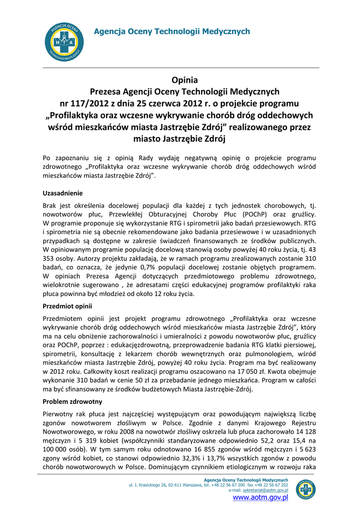 Agencja Oceny Technologii Medycznych Opinia Prezesa Agencji Oceny Technologii Medycznych nr 117/2012 z dnia 25 czerwca 2012 r. o projekcie programu „Profilaktyka oraz wczesne wykrywanie chorób dróg oddechowych wśród mieszkańców miasta Jastrzębie Zdrój” realizowanego przez miasto Jastrzębie Zdrój Po zapoznaniu się z opinią Rady wydaję negatywną opinię o projekcie programu zdrowotnego „Profilaktyka oraz wczesne wykrywanie chorób dróg oddechowych wśród mieszkańców miasta Jastrzębie Zdrój”. Uzasadnienie Brak jest określenia docelowej populacji dla każdej z tych jednostek chorobowych, tj. nowotworów płuc, Przewlekłej Obturacyjnej Choroby Płuc (POChP) oraz gruźlicy. W programie proponuje się wykorzystanie RTG i spirometrii jako badań przesiewowych. RTG i spirometria nie są obecnie rekomendowane jako badania przesiewowe i w uzasadnionych przypadkach są dostępne w zakresie świadczeń finansowanych ze środków publicznych. W opiniowanym programie populację docelową stanowią osoby powyżej 40 roku życia, tj. 43 353 osoby. Autorzy projektu zakładają, że w ramach programu zrealizowanych zostanie 310 badań, co oznacza, że jedynie 0,7% populacji docelowej zostanie objętych programem. W opiniach Prezesa Agencji dotyczących przedmiotowego problemu zdrowotnego, wielokrotnie sugerowano , że adresatami części edukacyjnej programów profilaktyki raka płuca powinna być młodzież od około 12 roku życia. Przedmiot opinii Przedmiotem opinii jest projekt programu zdrowotnego „Profilaktyka oraz wczesne wykrywanie chorób dróg oddechowych wśród mieszkańców miasta Jastrzębie Zdrój”, który ma na celu obniżenie zachorowalności i umieralności z powodu nowotworów płuc, gruźlicy oraz POChP, poprzez : edukacjęzdrowotną, przeprowadzenie badania RTG klatki piersiowej, spirometrii, konsultację z lekarzem chorób wewnętrznych oraz pulmonologiem, wśród mieszkańców miasta Jastrzębie Zdrój, powyżej 40 roku życia. Program ma być realizowany w 2012 roku. Całkowity koszt realizacji programu oszacowano na 17 050 zł. Kwota obejmuje wykonanie 310 badań w cenie 50 zł za przebadanie jednego mieszkańca. Program w całości ma być sfinansowany ze środków budżetowych Miasta Jastrzębie-Zdrój. Problem zdrowotny Pierwotny rak płuca jest najczęściej występującym oraz powodującym największą liczbę zgonów nowotworem złośliwym w Polsce. Zgodnie z danymi Krajowego Rejestru Nowotworowego, w roku 2008 na nowotwór złośliwy oskrzela lub płuca zachorowało 14 128 mężczyzn i 5 319 kobiet (współczynniki standaryzowane odpowiednio 52,2 oraz 15,4 na 100 000 osób). W tym samym roku odnotowano 16 855 zgonów wśród mężczyzn i 5 623 zgony wśród kobiet, co stanowi odpowiednio 32,3% i 13,7% wszystkich zgonów z powodu chorób nowotworowych w Polsce. Dominującym czynnikiem etiologicznym w rozwoju raka Agencja Oceny Technologii Medycznych ul. I. Krasickiego 26, 02-611 Warszawa, tel. +48 22 56 67 200 fax +48 22 56 67 202 e-mail: [email protected] www.aotm.gov.pl Opinia Prezesa AOTM nr 117/2012 z dnia 25 czerwca 2012 r. płuca są rakotwórcze substancje zawarte w dymie tytoniowym. Ocenia się, że czynne palenie jest przyczyną blisko 90% zachorowań. Zwiększone ryzyko zachorowania dotyczy także palenia biernego, które powoduje około 1/3 zachorowań na raka płuca u osób niepalących, mieszkających z palaczami tytoniu i blisko 1/4 zachorowań wśród pozostałych niepalących. Przewlekła Obturacyjna Choroba Płuc to zespół kliniczny, w którym współistnieją cechy przewlekłego zapalenia oskrzeli i rozedmy płuc, różnie nasilone u poszczególnych chorych. POChP jest jedną z najczęstszych chorób przewlekłych. W jego przebiegu wyróżnia się cztery okresy, odnośnie których zaleca się inne postępowanie lecznicze. Gruźlica jest chorobą wywoływaną przez trzy typy prątków – Mycobacterium tuberculosis, Mycobacterium bovis, Mycobacterium africanum. Źródłem prątków gruźlicy jest chory wydalający je podczas oddychania, mówienia oraz kaszlu. Komórki prątków mieszczą się w drobnych kropelkach plwociny, które wysychają w powietrzu, formując tzw. jądra kropelek o średnicy 1–5 μm, w których znajdują się 2 lub 3 prątki. Do grupy dużego ryzyka zakażenia prątkiem gruźlicy i zachorowania na gruźlicę należą: osoby zakażone wirusem HIV, osoby, które miały kontakt z chorymi wydalającymi prątki gruźlicy wykrywane metodą rozmazu, osoby ze zmianami minimalnymi w płucach (widocznymi w RTG klatki piersiowej), osoby nadużywające alkoholu lub zażywające narkotyki, bezdomni, imigranci z obszarów o dużej zapadalności na gruźlicę, chorzy na choroby przewlekłe, takie jak: cukrzyca, nowotwory złośliwe, niewydolność serca, przewlekła niewydolność nerek i wątroby, niedobory odporności (również na skutek leczenia immunosupresyjnego). Alternatywne świadczenia Zgodnie z informacją zawartą w załączniku nr 2 do Rozporządzenia Ministra Zdrowia z dnia 29 sierpnia 2009 roku, badanie spirometryczne (część 9 załącznika) oraz badanie TK klatki piersiowej (część 6 załącznika) są dostępne jako świadczenia gwarantowane z zakresu ambulatoryjnej opieki specjalistycznej. Wnioski z oceny przeprowadzonej przez Agencję Zakres programu jest zgodny z rozporządzeniem Ministra Zdrowia w sprawie priorytetów zdrowotnych oraz Narodowym Programem Zdrowotnym (NPZ) na lata 2007-2015 – cel strategiczny 1: zmniejszenie zachorowalności i przedwczesnej umieralności z powodu: chorób naczyniowo-sercowych, w tym zawałów serca i udarów mózgu, nowotworów złośliwych i przewlekłych chorób układu oddechowego oraz cel strategiczny 5: zwiększenie skuteczności zapobiegania chorobom zakaźnym i zakażeniom. Projekt programu zdrowotnego jest zgodny z zaleceniami AOTM i zawiera niezbędne informacje dotyczące: problemu zdrowotnego, epidemiologii, celów, adresatów programu, organizacj