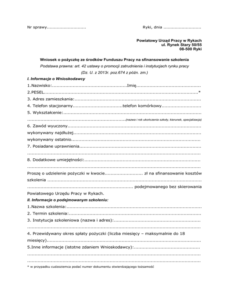 Nr sprawy............................ Ryki, dnia ........................... Powiatowy Urząd Pracy w Rykach ul. Rynek Stary 50/55 08-500 Ryki Wniosek o pożyczkę ze środków Funduszu Pracy na sfinansowanie szkolenia Podstawa prawna: art. 42 ustawy o promocji zatrudnienia i instytucjach rynku pracy (Dz. U. z 2013r. poz.674 z późn. zm.) I. Informacje o Wnioskodawcy 1.Nazwisko:...................................................Imię............................................ 2.PESEL.........................................................................................................* 3. Adres zamieszkania:...................................................................................... 4. Telefon stacjonarny..................................telefon komórkowy........................... 5. Wykształcenie:.............................................................................................. ...................................................................(nazwa i rok ukończenia szkoły, kierunek, specjalizacja) 6. Zawód wyuczony........................................................................................... wykonywany najdłużej....................................................................................... wykonywany ostatnio........................................................................................ 7. Posiadane uprawnienia................................................................................... ...................................................................................................................... 8. Dodatkowe umiejętności:............................................................................... ...................................................................................................................... Proszę o udzielenie pożyczki w kwocie.......................... zł na sfinansowanie kosztów szkolenia ......................................................................................................... ........................................................................ podejmowanego bez skierowania Powiatowego Urzędu Pracy w Rykach. II. Informacje o podejmowanym szkoleniu: 1.Nazwa szkolenia:............................................................................................ 2. Termin szkolenia:.......................................................................................... 3. Instytucja szkoleniowa (nazwa i adres):........................................................... ...................................................................................................................... 4. Przewidywany okres spłaty pożyczki (liczba miesięcy – maksymalnie do 18 miesięcy)......................................................................................................... 5.Inne informacje (istotne zdaniem Wnioskodawcy):............................................. ...................................................................................................................... ...................................................................................................................... * w przypadku cudzoziemca podać numer dokumentu stwierdzającego tożsamość III. Uzasadnienie podjęcia szkolenia ...................................................................................................................... ...................................................................................................................... ...................................................................................................................... ...................................................................................................................... ...................................................................................................................... ...................................................................................................................... ...................................................................................................................... ...................................................................................................................... IV. Kalkulacja wydatków w ramach wnioskowanej pożyczki Kwota należna instytucji szkoleniowej:................................................................. Kwota przewidziana na finansowanie innych kosztów szkolenia: Lp. Wyszczególnienie wydatku Kwota Termin realizacji 1 2 3 4 5 V. Propozycja zabezpieczenia roszczeń Urzędu z tytułu spłaty kwoty udzielonej pożyczki w formie (zaznaczyć wybraną formę) • blokada środków na rachunku bankowym (załączniki: oświadczenie wskazujące stan środków finansowych proponowanych do zabezpieczenia, zgoda właściciela na dokonanie blokady na wskazanym rachunku – w przypadku, gdy właścicielem rachunku jest osoba trzecia oraz zaświadczenie z Banku, w którym są zdeponowane środki do zabezpieczenia o możliwości dokonania bezterminowej, bezwarunkowej i nieodwołalnej blokady środków w proponowanej wysokości), • weksel in blanco z poręczycielami (imię i nazwisko poręczyciela/i)............................ ...................................................................................................................... ...................................................................................................................... ...................................................................................................................... proszę załączyć druki oświadczeń i udokumentować dochód poręczycieli1 (w sytuacji zaciągniętych kredytów proszę załączyć informację o aktualnej wysokości zadłużenia, wysokości rat, terminach spłat) • poręczenie (imię i nazwisko poręczyciela/i) ......................................................... ...............................................................