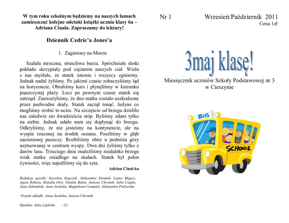 W tym roku szkolnym będziemy na naszych łamach zamieszczać kolejne odcinki książki ucznia klasy 6a – Adriana Cinala. Zapraszamy do lektury! Nr 1 Wrzesień/Październik 2011 Cena 1zł Dziennik Cedric’a Jones’a 1. Zaginiony na Morzu Szalała mroczna, straszliwa burza. Spróchniałe deski pokładu skrzypiały pod ciężarem naszych ciał. Wielu z nas myślało, że statek zatonie i wszyscy zginiemy. Jednak nadal żyliśmy. Po jakimś czasie zobaczyliśmy ląd na horyzoncie. Obraliśmy kurs i płynęliśmy w kierunku piaszczystej plaży. Lecz po pewnym czasie statek się zatrząsł. Zauważyliśmy, że dno statku zostało uszkodzone przez podwodne skały. Statek zaczął tonąć. Jedyne co mogliśmy zrobić to uciec. Na szczęście od brzegu dzieliło nas zaledwie sto dwadzieścia stóp. Byliśmy zdani tylko na siebie. Jednak udało nam się dopłynąć do brzegu. Odkryliśmy, że nie jesteśmy na kontynencie, ale na wyspie rzuconej na środek oceanu. Poszliśmy w głąb zacienionej puszczy. Rozbiliśmy obóz u podnóża góry usytuowanej w centrum wyspy. Dwa dni żyliśmy tylko z darów lasu. Trzeciego dnia znaleźliśmy niedaleko brzegu wrak statku osiadłego na skałach. Statek był pełen żywności, więc najedliśmy się do syta. Adrian Cinal 6a Redakcja gazetki: Karolina Kupczok, Aleksandra Dziadek, Laura Migacz, Agata Rokieta, Klaudia Oreł, Natalia Bałon, Justyna Chromik, Julia Czapla, Anna Zahradnik, Anna Jasińska, Magdalena Czempiel, Aleksandra Podżorska Projekt okładki: Anna Jasińska, Justyna Chromik Opiekun: Julia Lipińska -12- Miesięcznik uczniów Szkoły Podstawowej nr 3 w Cieszynie Krzyżówka Witamy Dyrekcję, Pracowników Szkoły, Nauczycieli oraz Uczniów po tegorocznych wakacjach. W tym roku szkolnym znowu zapraszamy do zabawy z nami Kupony z hasłami krzyżówek czy rozwiązaniami quizów przynoście do biblioteki i czekajcie na nagrodę! Mamy nadzieję, że cali i zdrowi wróciliście do dalszej pracy w szkole. 1. 2. 3. Wszystkim Wam życzymy dużo dobrych chwil oraz satysfakcji z pracy i nauki. Uczniom życzymy samych piątek i szóstek oraz zachęcamy do lektury naszej gazetki. 4. 5. 6. 7. 8. REDAKCJA GAZETKI SZKOLNEJ Po dłuższej przerwie witamy z powrotem nauczycielki, które powróciły do naszych klas. Lekcje muzyki w tym roku poprowadzi pani mgr Ewa Krupa. Do pań katechetek dołączy znowu pani mgr Iwona Matuszyk . Informatyki będzie nas uczyć pani mgr Beata Śliż. Spotkamy też nowe panie: w szkolnej świetlicy panią mgr Joannę Malinowską-Walichrad. W klasie 1a zauważymy nową nauczycielkę panią mgr Joannę Wawrzyczek-Reniewicz. Serdecznie witamy i życzymy satysfakcji z pracy! -2- 1. Niedawno się skończyły. 2. Nosili je kiedyś uczniowie naszej szkoły. 3. Piszemy w nim. 4. Dostajemy je za kartkówki i sprawdziany. 5. Siedzimy przy nich na lekcji. 6. Przychodzą do szkoły. 7. W tym miesiącu zakończy się rok szkolny. 8. Aktualna pora roku. Opracowały: Anna Jasińska, Justyna Chromik Rozwiązanie: ………………………………………… Imię i nazwisko ………………………………..kl………………………. -11- Poradnik Nastolatków Dopiero rozpoczął się rok szkolny, a nasi uczniowie mają już na koncie pierwsze sukcesy sportowe! 27 września na stadionie „Pod Wałką” odbyły się sztafetowe biegi przełajowe szkół podstawowych o Mistrzostwo Miasta Cieszyna. „Trójkę” reprezentowały dziewczyny: Wiktoria Mołdrzyk, Natalia Haltof (6b), Martyna Pasternak, Klaudia Święs, Dominika Kaczmarska (6d) oraz Kinga Kłoda (5b) i chłopcy: . Rywalizacja odbyła się pomiędzy sześcioma sztafetami. Nasze dziewczyny wywalczyły w pięknym stylu I miejsce, zaś chłopcy II miejsce. 5 października odbył się w Chybiu kolejny – powiatowy – etap tych zawodów, w którym dziewczyny zajęły III miejsce i tym samym zakwalifikowały się do etapu rejonowego w Łące koło Pszczyny. Odbędzie się on 12 października. Trzymamy mocno kciuki za nasze dzielne reprezentantki!! Reprezentacja dziewczyn przygotowuje się do zawodów pod okiem pani Janiny Hajek, zaś chłopców trenuje pan Grzegorz Wanat. Witajcie. W pierwszym numerze chcemy Wam doradzić, jak dobrze zacząć rok szkolny 2011/2012. 1. Postaw sobie cele, do których będziesz dążyć przez cały rok. 2. Przejrzyj zeszyty z poprzedniej klasy. 3. Odrabiaj zadania domowe i ucz się na bieżąco . 4. Postaraj się być milszy/a w stosunku do rodziny i znajomych. 5. Budź się z myślą ,,to będzie piękny dzień ” i zasypiaj z ,,jestem zadowolony/a z siebie na 100%”. Niedługo wybory do Szkolnego Samorządu klas 4-6. Wszyscy uczniowie starszych klas będą wybierać przewodniczącego i jego zastępców. Wkrótce na szkolnym korytarzu pojawią się plakaty kandydatów, zachęcamy więc do zapoznania się z ich programami i przygotowania się do głosowania. Mamy nadzieję, że nasze porady przysłużą Wam w tym roku szkolnym. 1 października miał miejsce 36 Rajd Młodzieżowy PTTK. Uczestnicy mieli za zadanie zdobycie szczytu Błatniej. Wystartowało 47 osób, które wyruszyły z Górek Małych, zdobywając po drodze szczyty: Mały Cisowy i Duży Cisowy. Reprezentacja „Trójki” po raz kolejny zdobyła puchar za najliczniejszy udział w rajdzie. Było miło i radośnie, a wszyscy uczestnicy szczęśliwie wrócili do domów. Opracowały: Anna Zahradnik i Natalia Bałon -3-10- Przed nami również wiele ciekawych konkursów przedmiotowych. Jednym z nich jest rywalizacja pomiędzy szóstoklasistami o tytuł Mistrza w takich przedmiotach jak: język polski, matematyka, historia czy przyroda. Uczniowie każdego miesiąca będą przystępowali do rozwiązywania testów, za które będą otrzymywali punkty. Rozstrzygnięcie nastąpi przed sprawdzianem kompetencji w kwietniu, wtedy to osoby posiadające najwyższą ilość punktów otrzymają tytuły, dyplomy i nagrody. Zachęcamy Was drodzy Szóstoklasiści do rywalizacji!! Zachęcamy wszystki