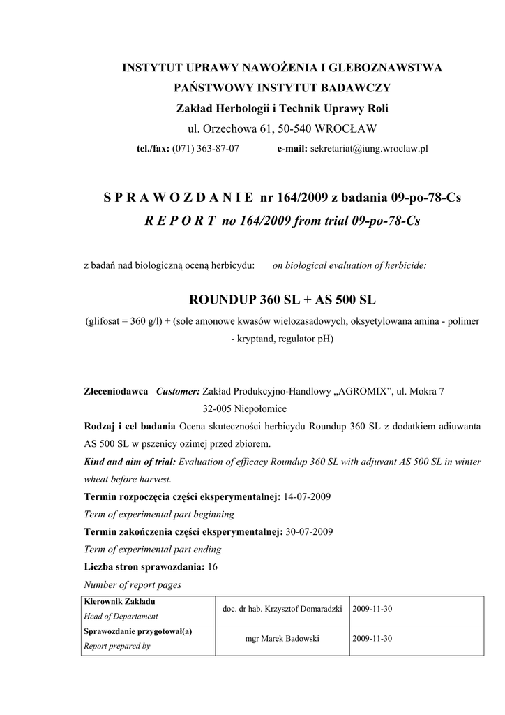 INSTYTUT UPRAWY NAWOŻENIA I GLEBOZNAWSTWA PAŃSTWOWY INSTYTUT BADAWCZY Zakład Herbologii i Technik Uprawy Roli ul. Orzechowa 61, 50-540 WROCŁAW tel./fax: (071) 363-87-07 e-mail: [email protected] S P R A W O Z D A N I E nr 164/2009 z badania 09-po-78-Cs R E P O R T no 164/2009 from trial 09-po-78-Cs z badań nad biologiczną oceną herbicydu: on biological evaluation of herbicide: ROUNDUP 360 SL + AS 500 SL (glifosat = 360 g/l) + (sole amonowe kwasów wielozasadowych, oksyetylowana amina - polimer - kryptand, regulator pH) Zleceniodawca Customer: Zakład Produkcyjno-Handlowy „AGROMIX”, ul. Mokra 7 32-005 Niepołomice Rodzaj i cel badania Ocena skuteczności herbicydu Roundup 360 SL z dodatkiem adiuwanta AS 500 SL w pszenicy ozimej przed zbiorem. Kind and aim of trial: Evaluation of efficacy Roundup 360 SL with adjuvant AS 500 SL in winter wheat before harvest. Termin rozpoczęcia części eksperymentalnej: 14-07-2009 Term of experimental part beginning Termin zakończenia części eksperymentalnej: 30-07-2009 Term of experimental part ending Liczba stron sprawozdania: 16 Number of report pages Kierownik Zakładu Head of Departament Sprawozdanie przygotował(a) Report prepared by doc. dr hab. Krzysztof Domaradzki 2009-11-30 mgr Marek Badowski 2009-11-30 Metoda i sposób prowadzenia badania Method and mode of trial carring out Wszystkie prace związane z planowaniem, prowadzeniem i oceną doświadczeń zawartych w sprawozdaniu wykonano według zasad Dobrej Praktyki Eksperymentalnej zgodnie z metodyką (PP 1/135, PP 1/152, PP1/181, PP 1/214 oraz PP 1/193(2)). All works connected with planing, conducting and evaluating of trials contens in this report were done in accordance with EPPO Standards Osoby prowadzące badanie Persons of trial carring out Kierownik badania Data i podpis Kierownika badania Manager of trial Date and signature the Manager of trial mgr inż. Marek Badowski Zespół badawczy Research team Urszula Pałac Zbigniew Jaworski Władysław Wiącek Leszek Rynarzewski Charakterystyka badanej próbki środka ochrony roślin The characteristic tested pesticide samples Nazwa środka Name of pesticide Roundup 360 SL Substancja aktywna Active ingredient glifosat = 360 g/l Producent środka Formulation producer Monsanto Europe S.A./N.V, Scheldelaan 460, B-2040 Antwerpia, Królestwo Belgii Producent substancji aktywnej Active substance Monsanto Europe S.A./N.V, Scheldelaan 460, B-2040 Antwerpia, Królestwo Belgii producer Nr partii Lot number 100666972 Data produkcji Date of production 13/05/2008 Data dostarczenia próbki Date of sample delivery 23-06-2008 Nr próbki Number of sample 08-23-01 2 Nazwa środka Name of pesticide AS 500 SL Substancja aktywna Active ingredient sole amonowe kwasów wielozasadowych, oksyetylowana amina = 500 g/l Producent środka Formulation producer Zakład Produkcyjno-Handlowy „Agromix”, ul Mokra 7, 32-005 Niepołomice Producent substancji aktywnej Active substance Zakład Produkcyjno-Handlowy „Agromix”, ul Mokra 7, 32-005 Niepołomice producer Nr partii Lot number 5/2009/AGR Data produkcji Date of production 05/01/2009 Data dostarczenia próbki Date of sample delivery 12-05-2009 Nr próbki Number of sample 09-30-01 Charakterystyka środka porównawczego The characteristic of standard product Nazwa środka Name of pesticide Roundup Energy 450 SL Substancja aktywna Active ingredient glifosat = 450 g/l Producent środka Formulation producer Monsanto Europe S.A./N.V, 270-272 Avenue de Ternvurenlaan, B-1150 Belgia Producent substancji aktywnej Active substance Monsanto Europe S.A./N.V, 270-272 Avenue de Ternvurenlaan, B-1150 Belgia producer Nr partii Lot number 100666972 A8E1304104 Data produkcji Date of production 13/05/2008 Data dostarczenia próbki Date of sample delivery 23-06-2008 Nr próbki Number of sample 08-23-01 Sposób przeprowadzenia obserwacji i pomiarów Mode of observations and measurements carring out Ocena fitotoksyczności Phytotoxicity evaluation F - fitotoksyczność - wrażliwość roślin na herbicyd w skali 1:9, gdzie: 1 - brak działania na roślinę uprawną 9 - zniszczenie rośliny uprawnej phytotoxicity - susceptibility of plants to herbicides in scale 1:9 where: 1 - no reaction of crop 9 - crop damaged 3 W - zagęszczenie łanu - stand density H - zahamowanie wzrostu - growth retardation D - deformacje - deformation T - zmiany turgoru - turgor drop Ocena zasuszenia Desiccation Stopień zasuszenia roślin pszenicy ozimej (S), po zastosowaniu badanych środków, oceniono szacunkowo (w skali od 0 do 100%) 10 i 14 dni po aplikacji herbicydów Degree of plants desiccation were evaluated in scale 0 – 100% S - stopień zasuszenia roślin uprawnych [%] - degree of plant desiccation [%] 0% - brak działania na roślinę uprawną, 100% - całkowite zasuszenie 0% - no reaction of crop, 100% - complete plant desiccation Ocena skuteczności chwastobójczej Weed control evaluation Zniszczenie chwastów (E) w % podano na podstawie analiz szacunkowych zachwaszczenia (10 i 14 dni po aplikacji herbicydów), porównując ich ilość na obiektach herbicydowych i na nieopryskiwanej kontroli, gdzie ilość chwastów określono w %. E - efektywność - zniszczenie chwastów w % **) - dla kontroli podano liczbę chwastów w % efficacy - weeds control in % *) - for untreated - number of weeds in % Ocena plonowania Yield characteristic Plon zbierano kombajnem poletkowym "Nusermayser Elite Z 035" firmy Wintersteiger. Masę tysiąca nasion i wyrównanie oznaczono w laboratorium i podano w przeliczeniu na 14% wilgotności. Ocena plonowania zawiera następujące składowe: plon z hektara, masę tysiąca nasion i wyrównanie. 4 Obliczenia statystyczne Statictic analysis W statystycznym opracowaniu wyników będzie użyta metoda analizy wariancji dla doświadczeń w układzie losowanych bloków. Istotność różnic testuje się wykorzystując półprzedział ufności Tukey'a, a najmniejszą istotną różnicę podaje dla poziomu ufności wynosząc
