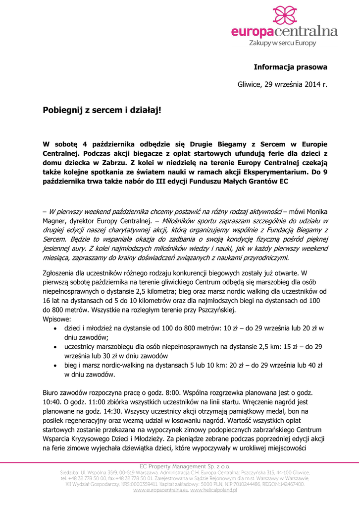 Informacja prasowa Gliwice, 29 września 2014 r. Pobiegnij z sercem i działaj! W sobotę 4 października odbędzie się Drugie Biegamy z Sercem w Europie Centralnej. Podczas akcji biegacze z opłat startowych ufundują ferie dla dzieci z domu dziecka w Zabrzu. Z kolei w niedzielę na terenie Europy Centralnej czekają także kolejne spotkania ze światem nauki w ramach akcji Eksperymentarium. Do 9 października trwa także nabór do III edycji Funduszu Małych Grantów EC – W pierwszy weekend października chcemy postawić na różny rodzaj aktywności – mówi Monika Magner, dyrektor Europy Centralnej. – Miłośników sportu zapraszam szczególnie do udziału w drugiej edycji naszej charytatywnej akcji, którą organizujemy wspólnie z Fundacją Biegamy z Sercem. Będzie to wspaniała okazja do zadbania o swoją kondycję fizyczną pośród pięknej jesiennej aury. Z kolei najmłodszych miłośników wiedzy i nauki, jak w każdy pierwszy weekend miesiąca, zapraszamy do krainy doświadczeń związanych z naukami przyrodniczymi. Zgłoszenia dla uczestników różnego rodzaju konkurencji biegowych zostały już otwarte. W pierwszą sobotę października na terenie gliwickiego Centrum odbędą się marszobieg dla osób niepełnosprawnych o dystansie 2,5 kilometra; bieg oraz marsz nordic walking dla uczestników od 16 lat na dystansach od 5 do 10 kilometrów oraz dla najmłodszych biegi na dystansach od 100 do 800 metrów. Wszystkie na rozległym terenie przy Pszczyńskiej. Wpisowe: dzieci i młodzież na dystansie od 100 do 800 metrów: 10 zł – do 29 września lub 20 zł w dniu zawodów; uczestnicy marszobiegu dla osób niepełnosprawnych na dystansie 2,5 km: 15 zł – do 29 września lub 30 zł w dniu zawodów bieg i marsz nordic-walking na dystansach 5 lub 10 km: 20 zł – do 29 września lub 40 zł w dniu zawodów. Biuro zawodów rozpoczyna pracę o godz. 8:00. Wspólna rozgrzewka planowana jest o godz. 10:40. O godz. 11:00 zbiórka wszystkich uczestników na linii startu. Wręczenie nagród jest planowane na godz. 14:30. Wszyscy uczestnicy akcji otrzymają pamiątkowy medal, bon na posiłek regeneracyjny oraz wezmą udział w losowaniu nagród. Wartość wszystkich opłat startowych zostanie przekazana na wypoczynek zimowy podopiecznych zabrzańskiego Centrum Wsparcia Kryzysowego Dzieci i Młodzieży. Za pieniądze zebrane podczas poprzedniej edycji akcji na ferie zimowe wyjechała dziewiątka dzieci, które wypoczywały w urokliwej miejscowości Murzasichle położonej obok Zakopanego. Więcej informacji na temat akcji i szczegółowy regulamin rywalizacji na www.biegamyzsercem.pl W niedzielę 5 października odbędzie się kolejna edycja Eksperymentarium. Tym razem motywem przewodnim spotkania dla młodych pasjonatów nauki będą doświadczenia z różnych dyscyplin nauk przyrodniczych. Podczas nich będzie można sprawdzić, ile tak naprawdę śmietany mamy w śmietanie. Chociaż nie będzie sprawdzania zawartości cukru w cukrze dla miłośników eksperymentów przygotowano m.in. pokaz papieru ognioodpornego, doświadczenia przy zegarze jodowym, okazję do stworzenia własnego leku na zgagę. Nie zabraknie także pokazów, które śmiało można przygotować w rodzinnym zaciszu. Wśród nich wulkanicznej przygoda, znikający atramenty, czy płonącej piany. Spotkania z nauką na wesoło potrwają od godz. 13:00 do 19:00. Małe granty do rozdania Akcja dla biegaczy to nie jedyna aktywność wspierająca lokalną społeczność. Do czwartku 9 października gliwickie Centrum czeka na zgłoszenia lokalnych projektów, które można zrealizować za 2.000 złotych od połowy października do połowy grudnia. Mają one dotyczyć szeroko rozumianej społeczności lokalnej i być realizowane na terenie Gliwic, Zabrza, bądź powiatu gliwickiego. Do tej pory Europa Centralna na wsparcie tego typu działań przeznaczyła 18.000 złotych. Zgłoszenia wniosków, odbywają się za pomocą specjalnego formularza na stronie Centrum. Do 19 października w Europie Centralnej jest otwarta także wystawa budowli z klocków Lego. W każdy weekend do końca października można skorzystać także z bezpłatnych porad architekta. Specjalne stoisko, na którym służy nieodpłatną pomocą czynne jest od godz. 14:00 do 19:00. Więcej szczegółów także na temat konkursu i akcji „Bon na dom” na www.europacentralna.eu --Centrum Handlowe Europa Centralna o powierzchni 67 tys. metrów kwadratowych jest jednym z największych tego typu obiektów komercyjnych w Polsce. Unikalny koncept galerii, oferuje klientom możliwość zrobienia wszystkich niezbędnych zakupów od artykułów spożywczych, przez materiały do budowy domu, po ubrania z najnowszych kolekcji. Położenie obiektu, przy jednym z największych węzłów autostradowych w Polsce (Gliwice-Sośnica), gdzie łączą się autostrady A1 i A4 i droga krajowa nr 44 oraz na obszarze gęsto zaludnionego Górnośląskiego Okręgu Przemysłowego, sprawia, że niemal 5 mln osób może w ciągu godziny dojechać tu na zakupy. Na miejscu skorzystać można z wypożyczalni parasoli, pomieszczeń dla rodziców z dziećmi, 600 miejsc siedzących dla klientów piętra restauracyjnego, paczkomatu, bezpłatnego wi-fi dostępnego na terenie całego Centrum oraz wielu bankomatów i punktów usługowych. Klienci mogą zostawić swój samochód na dużym, liczącym 2,3 tys. miejsc parkingu, a niezmotoryzowani dojadą na zakupy bezpłatnymi liniami autobusowymi. Wśród najemców są takie firmy jak: Saturn, Castorama, Tesco Extra, Jula, Ski Team, Sports Direct, Jysk, SMYK Megastore, RTV Euro AGD, New Yorker, Reserved, H&M, Cubus, Lindex, CCC, Bershka, Solar, Monnari, Clooud, Apart, TUI, Home and You, Super Pharm, Neckermann, Deichmann, City Sport, Mohito, Promod, Cortland Apple Premium Reseller, Stradivarius, Rossmann, TAKKO Fashion, Douglas, Alpenpark, ING Bank Śląski, Lilo, Henry Moore, Motherline, Bialcon, Dobrodzień i Kalwaria, AMT Studio, New Yo