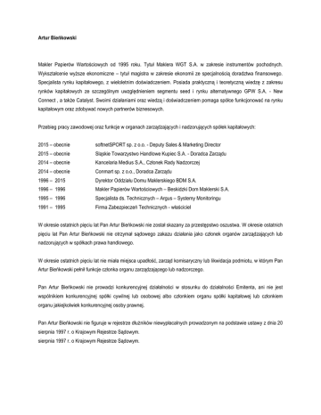 Artur Bieńkowski Makler Papierów Wartościowych od 1995 roku. Tytuł Maklera WGT S.A. w zakresie instrumentów pochodnych. Wykształcenie wyższe ekonomiczne – tytuł magistra w zakresie ekonomii ze specjalnością doradztwa finansowego. Specjalista rynku kapitałowego, z wieloletnim doświadczeniem. Posiada praktyczną i teoretyczną wiedzę z zakresu rynków kapitałowych ze szczególnym uwzględnieniem segmentu seed i rynku alternatywnego GPW S.A. - New Connect , a także Catalyst. Swoimi działaniami oraz wiedzą i doświadczeniem pomaga spółce funkcjonować na rynku kapitałowym oraz zdobywać nowych partnerów biznesowych. Przebieg pracy zawodowej oraz funkcje w organach zarządzających i nadzorujących spółek kapitałowych: 2015 – obecnie softnetSPORT sp. z o.o. - Deputy Sales & Marketing Director 2015 – obecnie Sląskie Towarzystwo Handlowe Kupiec S.A. - Doradca Zarządu 2014 – obecnie Kancelaria Medius S.A., Członek Rady Nadzorczej 2014 – obecnie Conmart sp. z o.o., Doradca Zarządu 1996 – 2015 Dyrektor Oddziału Domu Maklerskiego BDM S.A. 1996 – 1996 Makler Papierów Wartościowych – Beskidzki Dom Maklerski S.A. 1995 – 1996 Specjalista ds. Technicznych – Argus – Systemy Monitoringu 1991 – 1995 Firma Zabezpieczeń Technicznych - właściciel W okresie ostatnich pięciu lat Pan Artur Bieńkowski nie został skazany za przestępstwo oszustwa. W okresie ostatnich pięciu lat Pan Artur Bieńkowski nie otrzymał sądowego zakazu działania jako członek organów zarządzających lub nadzorujących w spółkach prawa handlowego. W okresie ostatnich pięciu lat nie miała miejsca upadłość, zarząd komisaryczny lub likwidacja podmiotu, w którym Pan Artur Bieńkowski pełnił funkcje członka organu zarządzającego lub nadzorczego. Pan Artur Bieńkowski nie prowadzi konkurencyjnej działalności w stosunku do działalności Emitenta, ani nie jest wspólnikiem konkurencyjnej spółki cywilnej lub osobowej albo członkiem organu spółki kapitałowej lub członkiem organu jakiejkolwiek konkurencyjnej osoby prawnej. Pan Artur Bieńkowski nie figuruje w rejestrze dłużników niewypłacalnych prowadzonym na podstawie ustawy z dnia 20 sierpnia 1997 r. o Krajowym Rejestrze Sądowym. sierpnia 1997 r. o Krajowym Rejestrze Sądowym.