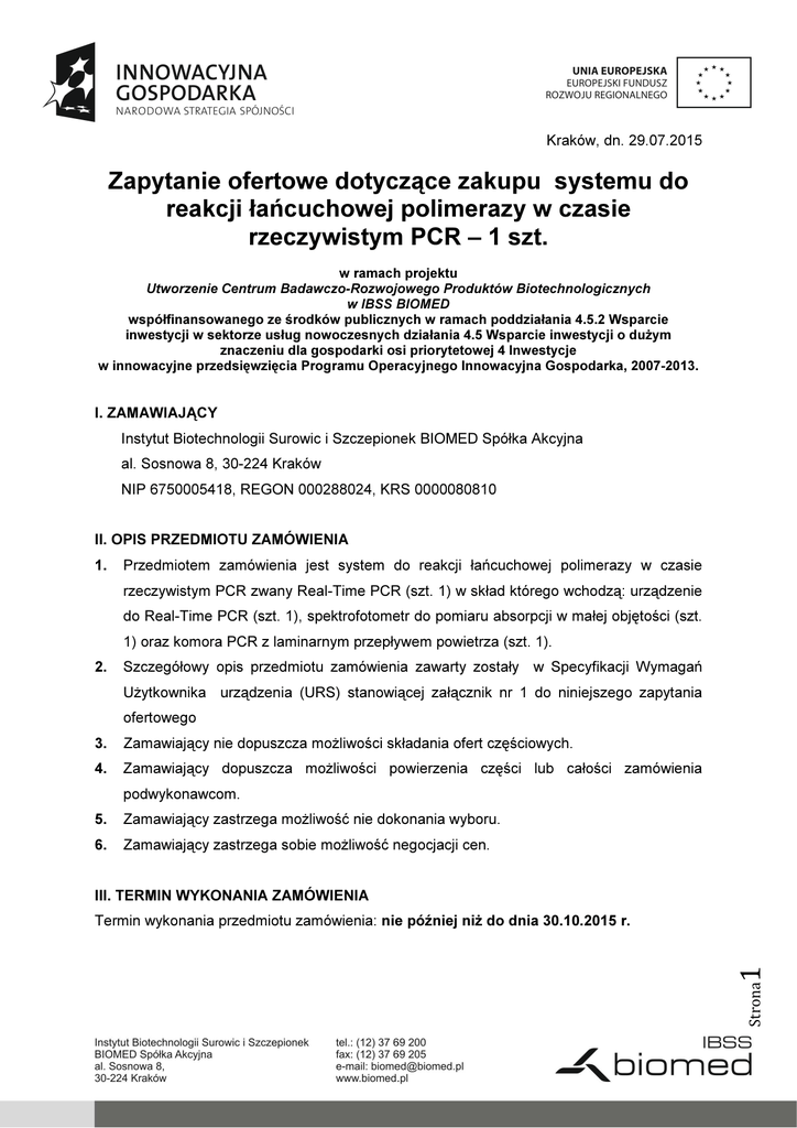 Kraków, dn. 29.07.2015 Zapytanie ofertowe dotyczące zakupu systemu do reakcji łańcuchowej polimerazy w czasie rzeczywistym PCR – 1 szt. w ramach projektu Utworzenie Centrum Badawczo-Rozwojowego Produktów Biotechnologicznych w IBSS BIOMED współfinansowanego ze środków publicznych w ramach poddziałania 4.5.2 Wsparcie inwestycji w sektorze usług nowoczesnych działania 4.5 Wsparcie inwestycji o dużym znaczeniu dla gospodarki osi priorytetowej 4 Inwestycje w innowacyjne przedsięwzięcia Programu Operacyjnego Innowacyjna Gospodarka, 2007-2013. I. ZAMAWIAJĄCY Instytut Biotechnologii Surowic i Szczepionek BIOMED Spółka Akcyjna al. Sosnowa 8, 30-224 Kraków NIP 6750005418, REGON 000288024, KRS 0000080810 II. OPIS PRZEDMIOTU ZAMÓWIENIA 1. Przedmiotem zamówienia jest system do reakcji łańcuchowej polimerazy w czasie rzeczywistym PCR zwany Real-Time PCR (szt. 1) w skład którego wchodzą: urządzenie do Real-Time PCR (szt. 1), spektrofotometr do pomiaru absorpcji w małej objętości (szt. 1) oraz komora PCR z laminarnym przepływem powietrza (szt. 1). 2. Szczegółowy opis przedmiotu zamówienia zawarty zostały w Specyfikacji Wymagań Użytkownika urządzenia (URS) stanowiącej załącznik nr 1 do niniejszego zapytania ofertowego 3. Zamawiający nie dopuszcza możliwości składania ofert częściowych. 4. Zamawiający dopuszcza możliwości powierzenia części lub całości zamówienia podwykonawcom. 5. Zamawiający zastrzega możliwość nie dokonania wyboru. 6. Zamawiający zastrzega sobie możliwość negocjacji cen. III. TERMIN WYKONANIA ZAMÓWIENIA Strona 1 Termin wykonania przedmiotu zamówienia: nie później niż do dnia 30.10.2015 r. IV. OPIS SPOSOBU PRZYGOTOWANIA OFERTY Oferta powinna: - posiadać datę sporządzenia, - zawierać adres lub siedzibę oferenta, numer telefonu, - podpisana czytelnie przez wykonawcę. V. MIEJSCE ORAZ TERMIN SKŁADANIA OFERT 1. Oferta powinna być złożona do dnia 21.08.2015r. za pośrednictwem: poczty elektronicznej na adres: [email protected] wraz z załączoną: a) listą referencyjną klientów, którzy zakupili urządzenie do Real-Time PCR. 2. Oferent może dostarczyć więcej niż jedna ofertę. 3. Ocena ofert zostanie dokonana w dniu 26.08.2015r. a wyniki i wybór najkorzystniejszej oferty zostanie ogłoszony w siedzibie Zamawiającego oraz na stronie internetowej pod adresem www.biomed.pl. 4. Oferty złożone po terminie nie będą rozpatrywane. 5. Oferent może przed upływem terminu składania ofert zmienić lub wycofać swoją ofertę. 6. W toku badania i oceny ofert Zamawiający może żądać od oferentów wyjaśnień dotyczących treści złożonych ofert. 7. Zapytanie ofertowe zamieszczono na stronie: www.biomed.pl VI. KRYTERIA OCENY OFERT Zamawiający dokona oceny ważnych ofert na podstawie następujących kryteriów: 1. Cena 70% 2. Funkcjonalność 30% (max. 7 punktów) A. Możliwość pracy na urządzeniu do Real-Time PCR z odczynnikami różnych producentów czyli tzw. system otwarty – 1pkt B. Możliwość pracy na urządzeniu do Real-Time PCR z barwnikami interkalującymi oraz różnymi typami sond molekularnych- 1 pkt C. Dokładność oraz jednorodność termiczna bloku w urządzeniu do Real-Time PCR –1 pkt Strona urządzeniu do Real-Time PCR – 1 pkt 2 D. Spektrum barwników fluorescencyjnych z którymi można pracować na E. Czas wykonania jednego pomiaru na spektrofotometrze -1 pkt F. Koszt kwalifikacji i serwisowania urządzeń- 1 pkt G. Wykorzystanie technologii Therma-Base oraz kamery CCD – 1pkt VII. INFORMACJE DOTYCZĄCE WYBORU NAJKORZYSTNIEJSZEJ OFERTY O wyborze najkorzystniejszej oferty Zamawiający zawiadomi oferentów za pośrednictwem strony internetowej znajdującej się pod adresem www.biomed.pl oraz w swojej siedzibie. VIII. DODATKOWE INFORMACJE Dodatkowych informacji udziela Patrycja Konieczna [email protected] oraz Małgorzata Popik [email protected] . IX. ZAŁĄCZNIKI Strona 3 Załącznik nr 1 - Specyfikacja Wymagań Użytkownika (URS)