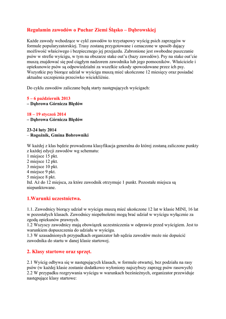 Regulamin zawodów o Puchar Ziemi Śląsko – Dąbrowskiej Każde zawody wchodzące w cykl zawodów to trzyetapowy wyścig psich zaprzęgów w formule popularyzatorskiej. Trasy zostaną przygotowane i oznaczone w sposób dający możliwość właściwego i bezpiecznego jej przejazdu. Zabronione jest swobodne puszczanie psów w strefie wyścigu, w tym na obszarze stake out’u (bazy zawodów). Psy na stake out’cie muszą znajdować się pod ciągłym nadzorem zawodnika lub jego pomocników. Właściciele i opiekunowie psów są odpowiedzialni za wszelkie szkody spowodowane przez ich psy. Wszystkie psy biorące udział w wyścigu muszą mieć ukończone 12 miesięcy oraz posiadać aktualne szczepienia przeciwko wściekliźnie. Do cyklu zawodów zaliczane będą starty następujących wyścigach: 5 – 6 październik 2013 – Dąbrowa Górnicza Błędów 18 – 19 styczeń 2014 – Dąbrowa Górnicza Błędów 23-24 luty 2014 – Rogoźnik, Gmina Bobrowniki W każdej z klas będzie prowadzona klasyfikacja generalna do której zostaną zaliczone punkty z każdej edycji zawodów wg schematu: 1 miejsce 15 pkt. 2 miejsce 12 pkt. 3 miejsce 10 pkt. 4 miejsce 9 pkt. 5 miejsce 8 pkt. Itd. Aż do 12 miejsca, za które zawodnik otrzymuje 1 punkt. Pozostałe miejsca są niepunktowane. 1.Warunki uczestnictwa. 1.1. Zawodnicy biorący udział w wyścigu muszą mieć ukończone 12 lat w klasie MINI, 16 lat w pozostałych klasach. Zawodnicy niepełnoletni mogą brać udział w wyścigu wyłącznie za zgodą opiekunów prawnych. 1.2 Wszyscy zawodnicy mają obowiązek uczestniczenia w odprawie przed wyścigiem. Jest to warunkiem dopuszczenia do udziału w wyścigu. 1.3 W uzasadnionych przypadkach organizator lub sędzia zawodów może nie dopuścić zawodnika do startu w danej klasie startowej. 2. Klasy startowe oraz sprzęt. 2.1 Wyścig odbywa się w następujących klasach, w formule otwartej, bez podziału na rasy psów (w każdej klasie zostanie dodatkowo wyłoniony najszybszy zaprzęg psów rasowych) 2.2 W przypadku rozgrywania wyścigu w warunkach bezśnieżnych, organizator przewiduje następujące klasy startowe: klasa MINI – klasa dla zawodników z jednym lub dwoma psami – pojazd wymagany scooter, dla dwóch psów dopuszcza się wózek trzykołowy klasa MIDI – klasa dla zaprzęgów złożonych z minimum 3, a maksimum 5 psów w każdym etapie – pojazd wymagany wózek trzykołowy, dopuszcza się start na wózkach czterokołowych klasa MAXI – klasa dla zaprzęgów złożonych z minimum 6, a maksimum 8 psów w każdym etapie – dla zaprzęgów powyżej 6 psów wymagany wózek czterokołowy; 2.3 W przypadku rozgrywania wyścigu na śniegu obowiązują następujące klasy startowe: klasa MINI – klasa dla narciarzy biegowych z jednym psem lub zaprzęgów złożonych z 2 psów z saniami klasa MIDI – klasa dla zaprzęgów złożonych z minimum 3, a maksimum 5 psów w każdym etapie – wymagane sanie klasa MAXI - dla zaprzęgów złożonych z minimum 6, a maksimum 8 psów w każdym etapie – wymagane sanie 2.2 Każdy sprzęt użyty podczas wyścigu musi być sprawny, posiadać sprawnie działające hamulce. Sanie muszą być wyposażone w kotwice, hamulec, worek do przewozu psa oraz zderzak zapobiegający najechaniu psa. Podczas odcinka nocnego obowiązują dwa niezależne źródła światła 3. Trasa. 3.1 Trasa zostanie oznakowana zgodnie z regulaminem wyścigów PZSPZ. 3.2 Długość trasy wynosi: I etap – 4 – 6 km II etap – 2,5 – 4 km (nocny) III etap – 4 – 6 km 4. Opłaty: (za każdą oddzielną edycję zawodów) Opłata startowa zawodnika – 60 zł Opłata startowa junior – 40 zł Opłata za pomocnika – 30 zł Opłaty przyjmowane są w formie przedpłaty na konto KSiP Zorza Credit Agricole Bank nr 25194010763082903500000000 z dopiskiem „ZAWODY” oraz podaniem imienia i nazwiska zawodnika. 5. Zgłoszenia. Zgłoszenia na zawody dokonuje się u organizatora za pośrednictwem poczty e-mail na adres [email protected] nie później niż na 3 dni przed zawodami. Zostaną przyjęte zgłoszenia wraz z opłaconą opłatą startową. Organizator wprowadza limit zgłoszeń w ilości 40 załóg w każdej edycji zawodów. Decyduje kolejność potwierdzonych i opłaconych zgłoszeń. 6. W sprawach spornych i nie ujętych w niniejszym regulaminie zastosowanie ma Regulamin sportowych wyścigów psich zaprzęgów Polskiego Związku Sportu Psich Zaprzęgów.