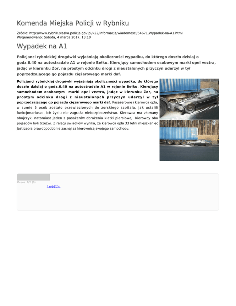 Komenda Miejska Policji w Rybniku Źródło: http://www.rybnik.slaska.policja.gov.pl/k22/informacje/wiadomosci/54671,Wypadek-na-A1.html Wygenerowano: Sobota, 4 marca 2017, 13:10 Wypadek na A1 Policjanci rybnickiej drogówki wyjaśniają okoliczności wypadku, do którego doszło dzisiaj o godz.6.40 na autostradzie A1 w rejonie Bełku. Kierujący samochodem osobowym marki opel vectra, jadąc w kierunku Żor, na prostym odcinku drogi z nieustalonych przyczyn uderzyl w tył poprzedzającego go pojazdu ciężarowego marki daf. Policjanci rybnickiej drogówki wyjaśniają okoliczności wypadku, do którego doszło dzisiaj o godz.6.40 na autostradzie A1 w rejonie Bełku. Kierujący samochodem osobowym marki opel vectra, jadąc w kierunku Żor, na prostym odcinku drogi z nieustalonych przyczyn uderzyl w tył poprzedzającego go pojazdu ciężarowego marki daf. Pasażerowie i kierowca opla, w sumie 5 osób zostało przewiezionych do żorskiego szpitala. Jak ustalili funkcjonariusze, ich życiu nie zagraża niebezpieczeństwo. Kierowca ma złamany obojczyk, natomiast jeden z pasażerów obrażenia klatki piersiowej. Kierowcy obu pojazdów byli trzeźwi. Z relacji swiadków wynika, że kierowca opla 33 letni mieszkaniec Jastrzębia prawdopodobnie zasnął za kierownicą swojego samochodu. Ocena: 0/5 (0) Tweetnij