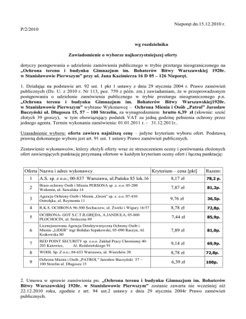 Nieporęt dn.15.12.2010 r. P/2/2010 wg rozdzielnika Zawiadomienie o wyborze najkorzystniejszej oferty dotyczy postępowania o udzielenie zamówienia publicznego w trybie przetargu nieograniczonego na „Ochrona terenu i budynku Gimnazjum im. Bohaterów Bitwy Warszawskiej 1920r. w Stanisławowie Pierwszym” przy ul. Jana Kazimierza 16 D 05 – 126 Nieporęt. 1. Działając na podstawie art. 92 ust. 1 pkt 1 ustawy z dnia 29 stycznia 2004 r. Prawo zamówień publicznych (Dz. U. z 2010 r. Nr 113, poz. 759 z późn. zm.) zawiadamiam, że w przeprowadzonym postępowaniu o udzielenie zamówienia publicznego w trybie przetargu nieograniczonego p.n. „Ochrona terenu i budynku Gimnazjum im. Bohaterów Bitwy Warszawskiej1920r. w Stanisławowie Pierwszym” wybrano Wykonawcę – Ochrona Mienia i Osób „Patrol” Jarosław Buczyński ul. Długosza 15, 57 – 100 Strzelin, za wynagrodzeniem brutto 6,39 zł (słownie: sześć złotych 39 groszy), w tym obowiązujący podatek VAT za jedną godzinę pełnienia ochrony przez jednego agenta. Termin wykonania zamówienia: 01.01.2011 r. - 31.12.2011r.. Uzasadnienie wyboru: oferta zawiera najniższą cenę – jedyne kryterium wyboru ofert. Podstawą prawną dokonanego wyboru jest art. 91 ust. 1 ustawy Prawo zamówień publicznych. Zestawienie wykonawców, którzy złożyli oferty wraz ze streszczeniem oceny i porównania złożonych ofert zawierających punktację przyznaną ofertom w każdym kryterium oceny ofert i łączną punktację: Oferta Nazwa i adres wykonawcy Kryterium – cena [pkt] Razem: 1 A.S. sp. z o.o.; 00-837 Warszawa, ul.Pańska 85 lok.16 8,17 zł 78,2 p. 2 Biuro ochrony Osób i Mienia PERSONA sp .z. o.o. 05-200 Wołomin, ul. Suwalska 14 7,87 zł 81,2p. 3 Agencja Ochrony Osób i Mienia „Grom” sp. z. o.o. 07-410 Ostrołęka, ul. Reymonta 11 9,76 zł 36,5p. 4 R.K.S. OCHRONA 96-500 Sochaczew, ul. Żwirki i Wigury 16/57 8,78 zł 72,8p. 5 OCHRONA- GOT S.C.T.R.GRĘDA, A.JANDUŁA, 05-860 PŁOCHOCIN, ul. Stołeczna 89 7,44 zł 85,9p. 6 Licencjonowana Agencja Detektywistyczna Ochrony Osób i Mienia „LIDER” mgr Bohdan Szpakowski, 05-090 Raszyn, Al. Krakowska 80 7,89 zł 81,0p. 7 RED POINT SECURITY sp. z.o.o. Zakład Pracy Chronionej 40203 Katowice, Al. Roździeńskiego 91 9,14 zł 69,9p. 8 WOHL Sp. Z o.o.; 04-653 Warszawa, ul. Wierchów 20 8,78 zł 72,8p. 9 Ochrona Mienia i Osób „PATROL” Jarosław Buczyński 57 – 100 Strzelin ul. Długosza 15 6,39 zł 100p. 2. Umowa w sprawie zamówienia pn. „Ochrona terenu i budynku Gimnazjum im. Bohaterów Bitwy Warszawskiej 1920r. w Stanisławowie Pierwszym” zostanie zawarta nie wcześniej niż 22.12.2010 roku, zgodnie z art. 94 ust.2 ustawy z dnia 29 stycznia 2004r Prawo zamówień publicznych. 3. Środki ochrony prawnej. Od niniejszej decyzji przysługują środki ochrony prawnej określone w ustawie z dnia 29 stycznia 2004 r. Prawo zamówień publicznych (Dz. U. z 2010 r., Nr 113, poz. 759) - Dział VI „Środki ochrony prawnej”. Otrzymują: 1/ A.S. Sp. z o.o., ul. Pańska 85 lok. 16, 00-837 Warszawa 2/ Biuro ochrony Osób i Mienia PERSONA sp. z. o. o. 05-200 Wołomin, ul. Suwalska 14 3/Agencja Ochrony Osób i Mienia „Grom” sp. z. o.o. 07-410 Ostrołęka, ul. Reymonta 11 4/R.K.S. Ochrona Adres: ul. Żwirki i Wigury 16/57, 96-500 Sochaczew 5/ Ochrona – GOT S.C. T.R. Gręda, A. Januła ul. Stołeczna 89, 05 – 860 Płochocin 6/ Licencjonowana Agencja Detektywistyczna Ochrony Osób i Mienia „Lider” mgr Bohdan Szpakowski Adres: Al. Krakowska 80, 05 – 090 Raszyn 7/ Red Point Security sp. z o.o. Zakład Pracy Chronionej Adres: Al. Roździeńskiego 91,40 – 203 Katowice 8/ WOHL Sp. z o.o., ul. Wierchów 20, 04-653 Warszawa 9/ Ochrona Mienia i Osób „Patrol” Jarosław Buczyński Adres: ul. Długosza 15, 57 – 100 Strzelin 10/ a/a.
