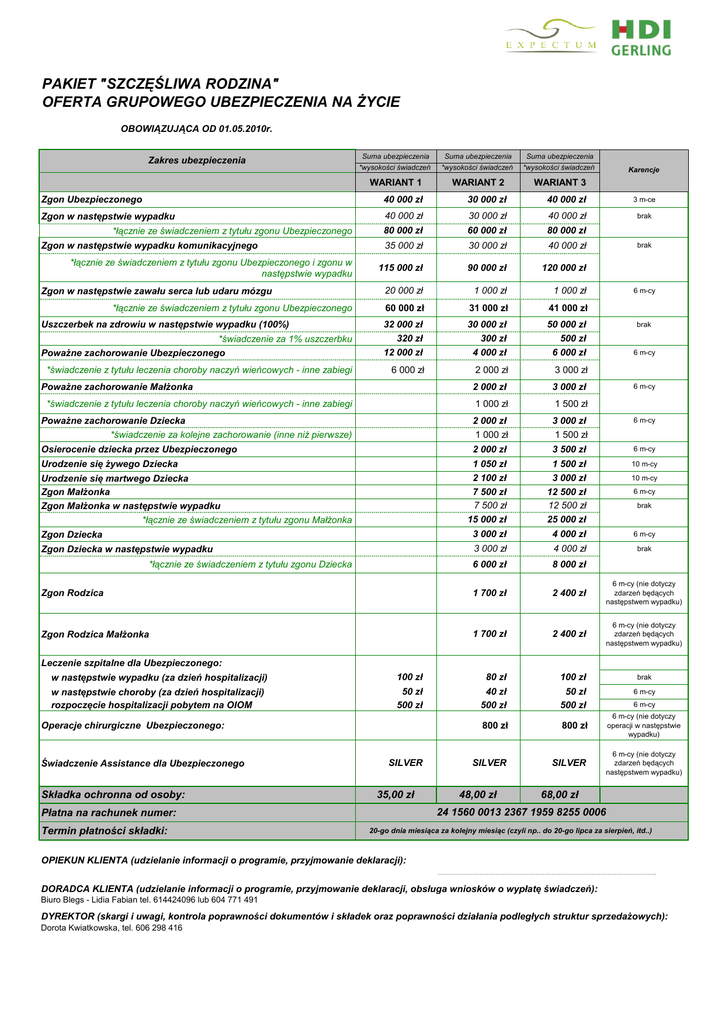 PAKIET "SZCZĘŚLIWA RODZINA" OFERTA GRUPOWEGO UBEZPIECZENIA NA ŻYCIE OBOWIĄZUJĄCA OD 01.05.2010r. Suma ubezpieczenia Suma ubezpieczenia Suma ubezpieczenia *wysokości świadczeń *wysokości świadczeń *wysokości świadczeń WARIANT 1 WARIANT 2 WARIANT 3 Zgon Ubezpieczonego 40 000 zł 30 000 zł 40 000 zł 3 m-ce Zgon w następstwie wypadku 40 000 zł 30 000 zł 40 000 zł brak 80 000 zł 60 000 zł 80 000 zł 35 000 zł 30 000 zł 40 000 zł 115 000 zł 90 000 zł 120 000 zł Zakres ubezpieczenia *łącznie ze świadczeniem z tytułu zgonu Ubezpieczonego Zgon w następstwie wypadku komunikacyjnego *łącznie ze świadczeniem z tytułu zgonu Ubezpieczonego i zgonu w następstwie wypadku 20 000 zł 1 000 zł 1 000 zł 60 000 zł 31 000 zł 41 000 zł Uszczerbek na zdrowiu w następstwie wypadku (100%) 32 000 zł 30 000 zł 50 000 zł *świadczenie za 1% uszczerbku Poważne zachorowanie Ubezpieczonego 320 zł 12 000 zł 300 zł 4 000 zł 500 zł 6 000 zł *świadczenie z tytułu leczenia choroby naczyń wieńcowych - inne zabiegi 6 000 zł 2 000 zł 3 000 zł Zgon w następstwie zawału serca lub udaru mózgu *łącznie ze świadczeniem z tytułu zgonu Ubezpieczonego Karencje brak 6 m-cy brak 6 m-cy 2 000 zł 3 000 zł *świadczenie z tytułu leczenia choroby naczyń wieńcowych - inne zabiegi 1 000 zł 1 500 zł Poważne zachorowanie Dziecka *świadczenie za kolejne zachorowanie (inne niż pierwsze) 2 000 zł 1 000 zł 3 000 zł 1 500 zł Osierocenie dziecka przez Ubezpieczonego 2 000 zł 3 500 zł 6 m-cy 1 050 zł 2 100 zł 7 500 zł 7 500 zł 15 000 zł 1 500 zł 3 000 zł 12 500 zł 12 500 zł 25 000 zł 10 m-cy Zgon Dziecka 3 000 zł 4 000 zł 6 m-cy Zgon Dziecka w następstwie wypadku 3 000 zł 4 000 zł brak 6 000 zł 8 000 zł Zgon Rodzica 1 700 zł 2 400 zł 6 m-cy (nie dotyczy zdarzeń będących następstwem wypadku) Zgon Rodzica Małżonka 1 700 zł 2 400 zł 6 m-cy (nie dotyczy zdarzeń będących następstwem wypadku) Poważne zachorowanie Małżonka Urodzenie się żywego Dziecka Urodzenie się martwego Dziecka Zgon Małżonka Zgon Małżonka w następstwie wypadku *łącznie ze świadczeniem z tytułu zgonu Małżonka *łącznie ze świadczeniem z tytułu zgonu Dziecka 6 m-cy 6 m-cy 10 m-cy 6 m-cy brak Leczenie szpitalne dla Ubezpieczonego: w następstwie wypadku (za dzień hospitalizacji) 100 zł 80 zł 100 zł brak w następstwie choroby (za dzień hospitalizacji) rozpoczęcie hospitalizacji pobytem na OIOM 50 zł 500 zł 40 zł 500 zł 50 zł 500 zł 6 m-cy Operacje chirurgiczne Ubezpieczonego: Świadczenie Assistance dla Ubezpieczonego Składka ochronna od osoby: SILVER 35,00 zł Płatna na rachunek numer: Termin płatności składki: 6 m-cy 800 zł 800 zł 6 m-cy (nie dotyczy operacji w następstwie wypadku) SILVER SILVER 6 m-cy (nie dotyczy zdarzeń będących następstwem wypadku) 48,00 zł 68,00 zł 24 1560 0013 2367 1959 8255 0006 20-go dnia miesiąca za kolejny miesiąc (czyli np.. do 20-go lipca za sierpień, itd..) OPIEKUN KLIENTA (udzielanie informacji o programie, przyjmowanie deklaracji): …………………………………………………………………………………………………………….. DORADCA KLIENTA (udzielanie informacji o programie, przyjmowanie deklaracji, obsługa wniosków o wypłatę świadczeń): Biuro Blegs - Lidia Fabian tel. 614424096 lub 604 771 491 DYREKTOR (skargi i uwagi, kontrola poprawności dokumentów i składek oraz poprawności działania podległych struktur sprzedażowych): Dorota Kwiatkowska, tel. 606 298 416