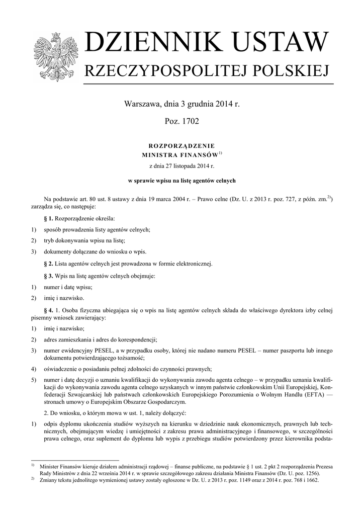 DZIENNIK USTAW RZECZYPOSPOLITEJ POLSKIEJ Warszawa, dnia 3 grudnia 2014 r. Poz. 1702 RO ZPO R ZĄ D ZE N I E M INI S TR A F IN AN SÓ W 1) z dnia 27 listopada 2014 r. w sprawie wpisu na listę agentów celnych Na podstawie art. 80 ust. 8 ustawy z dnia 19 marca 2004 r. – Prawo celne (Dz. U. z 2013 r. poz. 727, z późn. zm.2)) zarządza się, co następuje: § 1. Rozporządzenie określa: 1) sposób prowadzenia listy agentów celnych; 2) tryb dokonywania wpisu na listę; 3) dokumenty dołączane do wniosku o wpis. § 2. Lista agentów celnych jest prowadzona w formie elektronicznej. § 3. Wpis na listę agentów celnych obejmuje: 1) numer i datę wpisu; 2) imię i nazwisko. § 4. 1. Osoba fizyczna ubiegająca się o wpis na listę agentów celnych składa do właściwego dyrektora izby celnej pisemny wniosek zawierający: 1) imię i nazwisko; 2) adres zamieszkania i adres do korespondencji; 3) numer ewidencyjny PESEL, a w przypadku osoby, której nie nadano numeru PESEL – numer paszportu lub innego dokumentu potwierdzającego tożsamość; 4) oświadczenie o posiadaniu pełnej zdolności do czynności prawnych; 5) numer i datę decyzji o uznaniu kwalifikacji do wykonywania zawodu agenta celnego – w przypadku uznania kwalifikacji do wykonywania zawodu agenta celnego uzyskanych w innym państwie członkowskim Unii Europejskiej, Konfederacji Szwajcarskiej lub państwach członkowskich Europejskiego Porozumienia o Wolnym Handlu (EFTA) — stronach umowy o Europejskim Obszarze Gospodarczym. 2. Do wniosku, o którym mowa w ust. 1, należy dołączyć: 1) 1) 2) odpis dyplomu ukończenia studiów wyższych na kierunku w dziedzinie nauk ekonomicznych, prawnych lub technicznych, obejmującym wiedzę i umiejętności z zakresu prawa administracyjnego i finansowego, w szczególności prawa celnego, oraz suplement do dyplomu lub wypis z przebiegu studiów potwierdzony przez kierownika podsta- Minister Finansów kieruje działem administracji rządowej – finanse publiczne, na podstawie § 1 ust. 2 pkt 2 rozporządzenia Prezesa Rady Ministrów z dnia 22 września 2014 r. w sprawie szczegółowego zakresu działania Ministra Finansów (Dz. U. poz. 1256). Zmiany tekstu jednolitego wymienionej ustawy zostały ogłoszone w Dz. U. z 2013 r. poz. 1149 oraz z 2014 r. poz. 768 i 1662. Dziennik Ustaw –2– Poz. 1702 wowej jednostki organizacyjnej uczelni – o ile zostały wydane albo świadectwo ukończenia studiów podyplomowych w tym zakresie lub dokument potwierdzający co najmniej trzyletnie doświadczenie w sprawach celnych; 2) aktualną informację o osobie z Krajowego Rejestru Karnego w zakresie braku skazania za przestępstwo przeciwko wiarygodności dokumentów, mieniu, obrotowi gospodarczemu, obrotowi pieniędzmi i papierami wartościowymi lub przestępstwo skarbowe. 3. Przepisów ust. 2 pkt 1 nie stosuje się do osób, których kwalifikacje do wykonywania zawodu agenta celnego zostały potwierdzone decyzją wydaną na podstawie przepisów ustawy z dnia 18 marca 2008 r. o zasadach uznawania kwalifikacji zawodowych nabytych w państwach członkowskich Unii Europejskiej (Dz. U. Nr 63, poz. 394, z 2013 r. poz. 1650 oraz z 2014 r. poz. 1004). 4. Dokumenty, o których mowa w ust. 2 pkt 1, należy załączyć w oryginale lub kopii potwierdzonej za zgodność z oryginałem i podpisanej przez osobę ubiegającą się o wpis na listę agentów celnych. 5. Informacja, o której mowa w ust. 2 pkt 2, powinna zostać sporządzona nie wcześniej niż 3 miesiące przed dniem złożenia wniosku i załączona w oryginale. § 5. Rozporządzenie wchodzi w życie z dniem następującym po dniu ogłoszenia.3) Minister Finansów: wz. J. Cichoń 3) Niniejsze rozporządzenie było poprzedzone rozporządzeniem Ministra Finansów z dnia 17 maja 2004 r. w sprawie egzaminu kwalifikacyjnego na agenta celnego oraz wpisu na listę agentów celnych (Dz. U. z 2013 r. poz. 76), które traci moc z dniem wejścia w życie niniejszego rozporządzenia zgodnie z art. 37 ust. 1 ustawy z dnia 9 maja 2014 r. o ułatwieniu dostępu do wykonywania niektórych zawodów regulowanych (Dz. U. poz. 768).