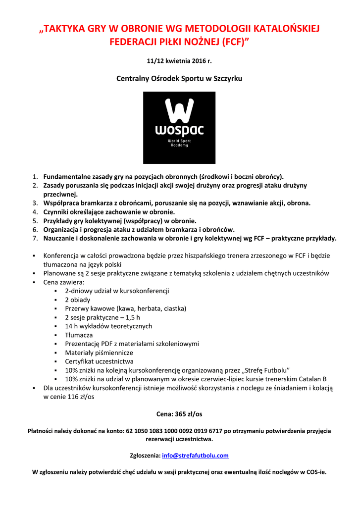 „TAKTYKA GRY W OBRONIE WG METODOLOGII KATALOŃSKIEJ FEDERACJI PIŁKI NOŻNEJ (FCF)” 11/12 kwietnia 2016 r. Centralny Ośrodek Sportu w Szczyrku 1. Fundamentalne zasady gry na pozycjach obronnych (środkowi i boczni obrońcy). 2. Zasady poruszania się podczas inicjacji akcji swojej drużyny oraz progresji ataku drużyny przeciwnej. 3. Współpraca bramkarza z obrońcami, poruszanie się na pozycji, wznawianie akcji, obrona. 4. Czynniki określające zachowanie w obronie. 5. Przykłady gry kolektywnej (współpracy) w obronie. 6. Organizacja i progresja ataku z udziałem bramkarza i obrońców. 7. Nauczanie i doskonalenie zachowania w obronie i gry kolektywnej wg FCF – praktyczne przykłady. Konferencja w całości prowadzona będzie przez hiszpańskiego trenera zrzeszonego w FCF i będzie tłumaczona na język polski Planowane są 2 sesje praktyczne związane z tematyką szkolenia z udziałem chętnych uczestników Cena zawiera: 2-dniowy udział w kursokonferencji 2 obiady Przerwy kawowe (kawa, herbata, ciastka) 2 sesje praktyczne – 1,5 h 14 h wykładów teoretycznych Tłumacza Prezentację PDF z materiałami szkoleniowymi Materiały piśmiennicze Certyfikat uczestnictwa 10% zniżki na kolejną kursokonferencję organizowaną przez „Strefę Futbolu” 10% zniżki na udział w planowanym w okresie czerwiec-lipiec kursie trenerskim Catalan B Dla uczestników kursokonferencji istnieje możliwość skorzystania z noclegu ze śniadaniem i kolacją w cenie 116 zł/os Cena: 365 zł/os Płatności należy dokonać na konto: 62 1050 1083 1000 0092 0919 6717 po otrzymaniu potwierdzenia przyjęcia rezerwacji uczestnictwa. Zgłoszenia: [email protected] W zgłoszeniu należy potwierdzić chęć udziału w sesji praktycznej oraz ewentualną ilość noclegów w COS-ie.