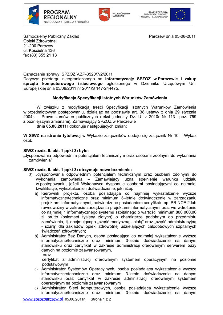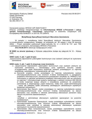 Samodzielny Publiczny Zakład Opieki Zdrowotnej 21-200 Parczew ul. Kościelna 136 fax (83) 355 21 13 Parczew dnia 05-08-2011 Oznaczanie sprawy: SPZOZ.V.ZP-3520/7/2/2011 Dotyczy: przetargu nieograniczonego na informatyzację SPZOZ w Parczewie i zakup sprzętu komputerowego i sieciowego ogłoszonego w Dzienniku Urzędowym Unii Europejskiej dnia 03/08/2011 nr 2011/S 147-244475. Modyfikacja Specyfikacji Istotnych Warunków Zamówienia W związku z modyfikacją treści Specyfikacji Istotnych Warunków Zamówienia w przedmiotowym postępowaniu, działając na podstawie art. 38 ustawy z dnia 29 stycznia 2004r. – Prawo zamówień publicznych (tekst jednolity Dz. U. z 2010r Nr 113 poz. 759 z późniejszymi zmianami), Zamawiający SPZOZ w Parczewie dnia 05.08.2011r dokonuje następujących zmian: W SIWZ na stronie tytułowej w Wykazie załączników dodaje się załącznik Nr 10 – Wykaz osób. SIWZ rozdz. II. pkt. 1 ppkt 3) było: „dysponowania odpowiednim potencjałem technicznym oraz osobami zdolnymi do wykonania zamówienia” SIWZ rozdz. II. pkt. 1 ppkt 3) otrzymuje nowe brzmienie: 3) „dysponowania odpowiednim potencjałem technicznym oraz osobami zdolnymi do wykonania zamówienia – Zamawiający uzna spełnienie warunku udziału w postępowaniu, jeżeli Wykonawca dysponuje osobami posiadającymi co najmniej kwalifikacje, wykształcenie i doświadczenie, jak niżej: a) Kierownik projektu, osoba posiadająca co najmniej wykształcenie wyższe informatyczne/techniczne oraz minimum 3–letnie doświadczenie w zarządzaniu projektami informatycznymi, potwierdzone posiadaniem certyfikatu np. PRINCE 2 lub równoważny w zakresie zarządzania projektami informatycznymi oraz we wdrożeniu co najmniej 1 informatycznego systemu szpitalnego o wartości minimum 800 000,00 zł brutto (osiemset tysięcy złotych) o charakterze podobnym do przedmiotu zamówienia, tj. obejmującego „część medyczną - białą” oraz „część administracyjną - szarą” dla zakładów opieki zdrowotnej udzielających całodobowych szpitalnych świadczeń zdrowotnych; b) Administrator Baz Danych, osoba posiadająca co najmniej wykształcenie wyższe informatyczne/techniczne oraz minimum 3-letnie doświadczenie na danym stanowisku oraz certyfikat w zakresie administracji oferowanym serwerem bazy danych na poziomie zaawansowanym, oraz certyfikat z administracji oferowanym systemem operacyjnym na poziomie podstawowym c) Administrator Systemów Operacyjnych, osoba posiadająca wykształcenie wyższe informatyczne/techniczne oraz minimum 3-letnie doświadczenie na danym stanowisku oraz certyfikat w zakresie administracji oferowanym systemem operacyjnym na poziomie zaawansowanym d) Administrator Sieci komputerowych, osoba posiadająca wykształcenie wyższe informatyczne/techniczne oraz minimum 3-letnie doświadczenie na danym www.spzozparczew.pl 05.08.2011r. Strona 1 z 2 stanowisku oraz certyfikat w zakresie administracji oferowanym systemem operacyjnym na poziomie zaawansowanym oraz certyfikat z administracji sieciami komputerowymi na poziomie podstawowym SIWZ rozdz. V. A. dodaje się pkt 3. : „3. Wykaz osób w zakresie wskazanym w rozdz. II pkt. 1 ppkt. 3, zgodnie z załącznikiem nr 10 do siwz”. Numeracja ulega zmianie: przed modyfikacją siwz w rozdz. V. A. było punktów 5, po dodaniu w/w jest punktów 6. Zamawiający załącza na swojej stronie internetowej wzór dodanego załącznika Nr 10. W załączniku Nr 2 przedmiotu zamówienia: „Moduł Obsługi kasy” wykreśla się punkty 2, 5, 8: 2. Możliwość dedykowania stanowisk kasowych do placówek medycznych Zamawiającego 5. Dostęp do skorowidza pacjentów zintegrowanego z częścią medyczną aplikacji 8. automatyczne generowanie operacji kasowych na stanowiskach dedykowanych dla placówki medycznej w oparciu o wystawiane w niej automatycznie faktury (dla każdej zrealizowanej odpłatnie usługi medycznej) integracja z fakturowaniem na poziomie placówki „Komputery stacje robocze” „oprogramowanie antywirusowe”. w pozycji Dodatkowe Oprogramowanie dodaje się „Serwer bazodanowy” w pozycji Oprogramowanie dodaje się „oprogramowanie antywirusowe”. „Serwer terminalowy” w pozycji Oprogramowanie dodaje się „oprogramowanie antywirusowe”. „Serwer do obsługi administracji” w pozycji Oprogramowanie dodaje się „oprogramowanie antywirusowe”. „Serwer www” w pozycji Oprogramowanie dodaje się „oprogramowanie antywirusowe”. W załączniku Nr 5 projektu umowy: dodaje się w § 9 po ust. 8 ust. „9. Zmiana osób wykonujących określone funkcje w trakcie realizacji umowy jest dopuszczalna pod warunkiem posiadania przez nowe osoby nie niższych kwalifikacji, wykształcenia i doświadczenia, co osoby wskazane w wykazie osób załączonych do oferty Wykonawcy. Zmiany takie będą dokonywane w formie pisemnych powiadomień i nie wymagają zawierania aneksu do Umowy”. ulega zmianie także numeracja: przed modyfikacją siwz w § 9. było punktów 12, po dodaniu w/w jest punktów 13. Podpisał: Dyrektor Samodzielnego Publicznego Zakładu Opieki Zdrowotnej w Parczewie mgr Janusz Hordejuk www.spzozparczew.pl 05.08.2011r. Strona 2 z 2