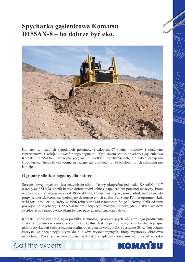 Spycharka gąsienicowa Komatsu D155AX-8 – bo dobrze być eko. Komatsu w ostatnich tygodniach postanowiła „dopieścić” swoich klientów i niedawno zaprezentowała kolejną nowość z tego segmentu. Tym razem jest to spycharka gąsienicowa Komatsu D155AX-8. Maszyna potężna, o wielkich możliwościach, ale także przyjazna środowisku. Niemożliwe? Komatsu już nie raz udowodniło, że to słowo w ich słowniku nie istnieje. Ogromny silnik, a łagodny dla natury Sercem nowej spycharki jest oczywiście silnik. To wysokoprężna jednostka SAA6D140E-7 o mocy aż 354 KM. Silnik bardzo dobrze radzi sobie z napędzaniem potężnej maszyny, która w zależności od wersji waży od 38 do 43 ton. Co najważniejsze, nowy silnik należy już do grupy jednostek Komatsu spełniających normę emisji spalin EU Stage IV. To ogromny skok w historii producenta, który w 1996 roku startował z motorem Stage I. Nowy silnik od razu pozycjonuje spycharkę D155AX-8 na czele tego typu maszyn pod względem niskich kosztów eksploatacji, a przede wszystkim bardzo przyjemnego zużycia paliwa. Komatsu konsekwentnie sięga po kilka technologii pozwalających silnikom tego producenta znacznie ograniczać emisję szkodliwych spalin. Jest to przede wszystkim bardzo wydajny układ recyrkulacji i oczyszczania spalin, oparty na zaworze EGR i systemie SCR. Ten ostatni korzysta ze specjalnego płynu do silników wysokoprężnych, który wystarczy okresowo uzupełniać. Poza tym w nowoczesnej jednostce znajdziemy zaawansowany układ wtrysku paliwa i turbosprężarkę o zmiennej geometrii łopatek. W efekcie niska jest nie tylko emisja spalin, ale także zużycie paliwa, co dla przedsiębiorstw ma kluczowe znaczenie. Najwyższa jakość sprzętu, gwarantowany serwis Nowa spycharka D155AX-8 oczywiście została objęta dwoma flagowymi programami serwisowymi Komatsu. Pierwszym z nich jest Komatsu Care. Przypomnijmy, że firma udziela na swoją spycharkę bezwarunkowej gwarancji na 3 lata lub 2000 roboczogodzin. Dłuższą, bo aż 5-letnią gwarancją (lub 9000 roboczogodzin) objęty jest filtr cząstek stałych. Układ SCR może być w tym czasie dwukrotnie czyszczony z uzupełnieniem płynu. To znacznie obniża koszty eksploatacji maszyny zwłaszcza, że Komatsu gwarantuje używanie wyłącznie oryginalnych części podczas napraw. Drugi program, KOMTRAX, polega na objęciu spycharki ciągłym monitoringiem. Informacje o parametrach pracy poszczególnych podzespołów, zużyciu paliwa, przestojach i nadmiernej eksploatacji natychmiast są przekazywane do dyspozytora floty. Ten na ich podstawie może poinstruować operatora, w jaki sposób powinien w przyszłości użytkować spycharkę. Informacje te są również bardzo przydatne do oceny kosztów związanych z eksploatacją maszyny. SIGMADOZER – znak rozpoznawczy Komatsu Spycharka gąsienicowa D155AX-8 została także wyposażona w opatentowany przez Komatsu system SIGMADOZER. Polega on na diametralnym zwiększeniu efektywności spychania. Konstrukcja spychu gwarantuje, że materiał nie jest wypychany poza jego powierzchnię i gromadzi się głównie na środku. W ten sposób spycharka może przepchnąć dużo więcej materiału, nie traci zbędnej energii na poprawianie pracy, zużywa mniej paliwa. Według szacunków Komatsu SIGMADOZER pozwala zwiększyć efektywność pracy o 15%. Powierzchnia spychu w tej maszynie wynosi 9,4 m3. Kolejnym elementem wpływającym na większą produktywność spycharki jest skrzynia biegów. Automatyczna przekładnia z systemem redukcji obrotów silnika pozwala zaoszczędzić do 10% paliwa. Schemat działania skrzyni jest bardzo prosty – ogranicza ona obroty w momentach, gdy pełna moc silnika nie jest wymagana, np. podczas swobodnej jazdy. Gdy tylko wzrasta zapotrzebowanie na moc, obroty natychmiast są podnoszone. Spycharka gąsienicowa Komatsu D155AX-8 – sprzyja operatorowi Nowa spycharka od Komatsu bez wątpienia należy do grona maszyn, które współpracują ze swoim operatorem. Ten ma do dyspozycji zestaw bardzo czytelnych wskaźników i przełączników, a sterowanie odbywa się przy użyciu jednego, ergonomicznego joysticka. W kabinie operator znajdzie bardzo wygodny, pneumatyczny fotel oraz 7-calowy monitor LCD, na którym wyświetlane są wszystkie najważniejsze informacje o parametrach pracy maszyny. Fotel jest także podgrzewany. Nad precyzją prowadzenia czuwa system HSS, który wspiera operatora przy wykonywaniu najróżniejszych zadań. W sytuacji, gdy nagle diametralnie pogarsza się stan podłoża, system pomoże utrzymać prawidłowy tor jazdy i nie dopuści do utraty spychanego materiału. Kabina, w której pracuje operator, zapewnia mu także maksimum bezpieczeństwa – jest odporna na zgniatanie i zniszczenie w razie upadku zgodnie z normami ROPS/FOPS. Miejsce w kabinie zajmuje się za pośrednictwem szerokich, wygodnych drzwi, pomocny jest również duży uchwyt. Wspomniany 7-calowy monitor może zostać zsynchronizowany z układem wsparcia podczas cofania. Druga nowość od Komatsu w tym numerze e-maszbud.pl i druga tak pozytywna recenzja. Nie ma się jednak czemu dziwić – producent naprawdę przyłożył się do wprowadzonych zmian i zaprezentował nam znakomite maszyny. Nowy silnik goszczący w D155AX-8 daje tej spycharce ogromne możliwości, a do tego dba o stan środowiska i portfel właściciela. Czego chcieć więcej? e-maszbud.pl