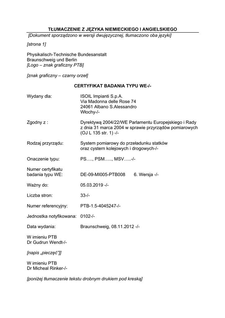 TŁUMACZENIE Z JĘZYKA NIEMIECKIEGO I ANGIELSKIEGO [Dokument sporządzono w wersji dwujęzycznej, tłumaczono oba języki] [strona 1] Physikalisch-Technische Bundesanstalt Braunschweig und Berlin [Logo – znak graficzny PTB] [znak graficzny – czarny orzeł] CERTYFIKAT BADANIA TYPU WE-/Wydany dla: ISOIL Impianti S.p.A. Via Madonna delle Rose 74 24061 Albano S.Alessandro Włochy-/- Zgodny z : Dyrektywą 2004/22/WE Parlamentu Europejskiego i Rady z dnia 31 marca 2004 w sprawie przyrządów pomiarowych (OJ L 135 str. 1) -/- Rodzaj przyrządu: System pomiarowy do przeładunku statków oraz cystern kolejowych i drogowych-/- Onaczenie typu: PS…., PSM….., MSV…..-/- Numer certyfikatu badania typu WE: DE-09-MI005-PTB008 Ważny do: 05.03.2019 -/- Liczba stron: 33-/- Numer referencyjny: PTB-1.5-4045247-/- 6. Wersja -/- Jednostka notyfikowana: 0102-/Data wydania: Braunschweig, 08.11.2012 -/- W imieniu PTB Dr Gudrun Wendt-/[napis „pieczęć”]] W imieniu PTB Dr Micheal Rinker-/[poniżej tłumaczenie tekstu drobnym drukiem pod kreską] Uwaga: Wersje bez podpisu i pieczęci są nieważne. Niniejsza wersja nie może być kopiowana w inny sposób niż w całości. Odpisy mogą być pobierane wyłącznie za zgodą Physikalisch- Technischen Bundensansalt. -/[ z boku strony numer R3-020553] [strona 2] [na samej górze nazwa firmy certyfikującej] Załącznik do certyfikatu badania typu WE z dnia 08.11.2012, certyfikat numer: DE-09-MI005-PTB008 6. wersja , strona 2 z 33 /Historia certyfikatu [tabela] Wydanie certyfikatu DE-09-MI005-PTB008, 6. wersja DE-09-MI005-PTB008, 5. wersja DE-09-MI005-PTB008, 4. wersja DE-09-MI005-PTB008, 3. wersja DE-09-MI005-PTB008, 2. wersja DE-09-MI005-PTB008, 1. wersja DE-09-MI005-PTB008 Data Zmiany 08.11.2012 - Uzupełniono wersje oprogramowania dla elektronicznych jednostek centralnych typ VEGA II i VEGA T 11.01.2012 - Skorygowano granice błędu przy uruchomieniu - Uzupełniono wersje oprogramowania dla elektronicznych jednostek centralnych typ VEGA II i VEGA T 05.05.2011 - Przyjęto licznik masy Coriolisa typ CMF HC2 - uzupełniono wersje oprogramowania dla elektronicznej jednostki centralnej typ MDV... 08.11.2012 - Przyjęto jednostkę centralną typ VEGA T - przyjęto Metrical Recording Device -/20.11.2009 - Przeróbka redakcyjna - Przerobiono schematy systemów pomiarowych - Przerobiono plany plomb -/31.07.2009 - Przeróbka redakcyjna - Przyjęto specjalny ekstraktor gazu typ DS… - Przyjęto liczniki masy Coriolisa typ CMF… wzgl. DS. 600 S - Przyjęto elektroniczną jednostkę centralną typ MVD… 06.03.2009 Pierwszy certyfikat -/- Niniejsza szósta wersja zastępuje certyfikat numer DE-09-MI005-PTB008 , 5. wersja z dnia 11.01.2012, znak handlowy PTB-1.5-4055978, z załącznikiem. -/Dla podanych w tym certyfikacie urządzeń obowiązują Przepisy prawne: Dla podanych w tym certyfikacie urządzeń obowiązuje dyrektywa 2004/22/EG Parlamentu Europejskiego i Rady z dnia 31 marca 2004 w sprawie przyrządów pomiarowych (Dziennik Urzędowy Unii Europejskiej OJ L str. 1), ostatnio zmieniona przez dyrektywę 2009/137/EG z dnia 10.11.2009-/łącznie z - załącznikiem I „wymagania zasadnicze” - załącznikiem MI-005 „systemy pomiarowe ciągłego i dynamicznego pomiaru ilości płynów poza wodą” -/Zastosowane normy względnie dokumenty normatywne: - OIML R117-1:2007-/Pozostałe zastosowane zasady: - Welmec Guide 7.2:2011 -/- [strona 3] [nazwa firmy certyfikującej] Załącznik do certyfikatu badania typu WE z dnia 08.11.2012, certyfikat numer: DE-09-MI005-PTB008 6. wersja ,strona 3 z 33 /Urządzenia / Systemy pomiarowe muszą odpowiadać następującym ustaleniom: 1. Opis rodzaju konstrukcji-/1.1 Budowa System pomiarowy służy do pomiaru pojemności lub masy przy załadunku lub rozładunku statków, cystern drogowych i kolejowych i składa się, oprócz różnych podzespołów elektronicznych i mechanicznych służących sterowaniu systemem, nie podlegających kontroli metrologicznej, z: -/System pomiarowy typ PS… • separator gazu typ DV…; • objętościowy czujnik pomiarowy typ BM…, BMD…, LBM… lub P 4000 z generatorem impulsu typ EM 6422; • • elektroniczna jednostka centralna typ VEGA II lub VEGA T (opcjonalnie z wewnętrznym generatorem impulsu typ ENS1J-B28L00100) lub mechanicznym licznikiem obrotowym; gęstościomierz typ DIMF 1.3 (opcjonalnie). -/- System pomiarowy typ PSM… • separator gazu typ DV…; • czujnik pomiarowy Coriolis typ CMF… wzgl. DS 600 S; • elektroniczna jednostka centralna typ VEGA II lub VEGA T lub typ MVD…; • gęstościomierz typ DIMF 1.3 (opcjonalnie) -/• System pomiarowy typ MSV…. • specjalny ekstraktor gazu typ DS…; • objętościowy czujnik pomiarowy typ BM… lub P 4000 z generatorem impulsu typ EM 6422; • elektroniczna jednostka centralna typ VEGA II lub VEGA T (opcjonalnie z wewnętrznym generatorem impulsu typ ENS1J-B28L00100) lub mechanicznym licznikiem obrotowym; • gęstościomierz typ DIMF 1.3 (opcjonalnie). -/Realizacje systemu pomiarowego przedstawiono na następującym rysunku. -/[strona 4] [nazwa firmy certyfikującej] Załącznik do certyfikatu badania typu WE z dnia 08.11.2012, certyfikat numer: DE-09-MI005-PTB008 6. wersja , strona 4 z 33 /[rysunek additive – dodatek to transfer point – do punktu transferu] [pod rysunkiem] System pomiarowy z licznikiem objętościowym i separatorem gazu (realizacja PS..) [tabela] 1: separator gazu 3: gęstościomierz (opcjonalnie) 5: czujnik ciśnienia (opcjonalnie) 7: czujnik temperatury (opcjonalnie) 9: zawór preselekcyjny 11:regulator poziomu cieczy 2: uszlachetnianie (opcjonalnie) 4: czujnik temperatury (opcjonalnie) 6: przyłącze termometru 8: czujnik pomiarowy 10:przyłącze dla zewnętrznego urządzenia kontrolnego (opcjonalnie) (opcjonalnie) [rysunek additive – dodatek to transfer point – do punktu transferu] [pod rysunkiem] System pomiarowy z licznikiem masy Coriolis i separatorem gazu (realizacja PSM...) [tabelka] 1: s