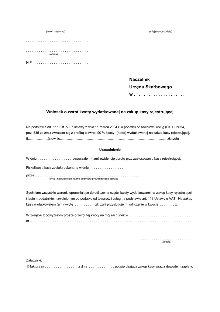 .................................. ................................ (imię i nazwisko) (miejscowość, data) .................................. .................................. (adres) NIP . . . . . . . . . . . . . . . . . . . . . . . . . . . . . . Naczelnik Urzędu Skarbowego w..................... Wniosek o zwrot kwoty wydatkowanej na zakup kasy rejestrującej Na podstawie art. 111 ust. 5 i 7 ustawy z dnia 11 marca 2004 r. o podatku od towarów i usług (Dz. U. nr 54, poz. 535 ze zm.) zwracam się z prośbą o zwrot 90 % kwoty* (netto) wydatkowanej na zakup kasy rejestrującej, tj………………(słownie…………………………………………………………………………………….złotych) Uzasadnienie W dniu . . . . . . . . . . . . . . . . . . rozpocząłem (łam) ewidencję obrotu przy zastosowaniu kasy rejestrującej. Fiskalizacja kasy została dokonana w dniu . . . . . . . . . . . . . . . . . . przez . . . . . . . . . . . . . . . . . . . . . . . . . . . . . . . . . . . . . . . . . . . . . . . . . . . . . . . . . . . (imię i nazwisko lub nazwa podmiotu prowadzącego serwis) Spełniłam wszystkie warunki uprawniające do odliczenia części kwoty wydatkowanej na zakup kasy rejestrującej i jestem podatnikiem zwolnionym od podatku od towarów i usług na podstawie art. 113 Ustawy o VAT. Na zakup kasy wydatkowałem (am) kwotę . . . . . . . . . . . zł, czyli przysługuje mi odliczenie w kwocie . . . . . . . . zł. W związku z powyższym proszę o zwrot tej kwoty na mój rachunek w . . . . . . . . . . . . . . . . . . . . . . . . . . . . . . . . . . nr . . . . . . . . . . . . . . . . . . . . . . . . . . . . . . . . . . . . . . . . . . . . . . . . . . . . . . . . . . . . . . . . . . . . . . . . . . . . . . . . . . . . . . . ........................... (podpis) Załączniki: 1) faktura nr . . . . . . . . . . . . . . . . . . z dnia . . . . . . . . . . . . . . potwierdzająca zakup kasy wraz z dowodem zapłaty.