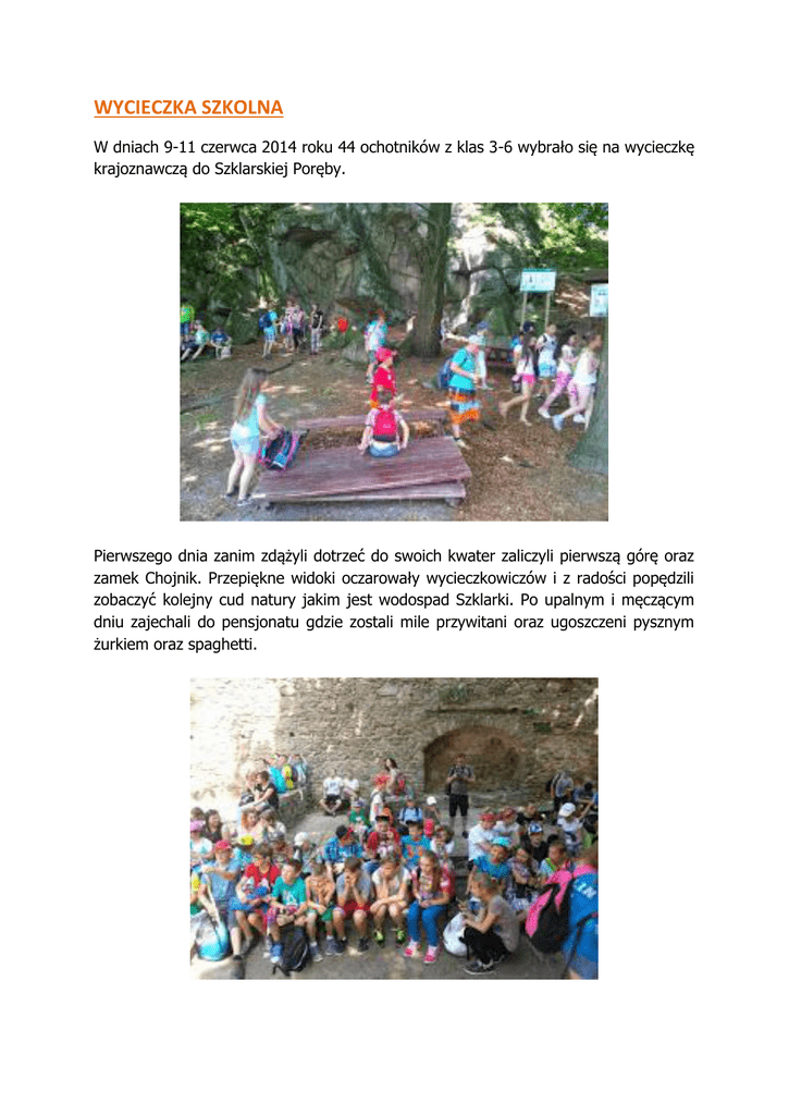 WYCIECZKA SZKOLNA W dniach 9-11 czerwca 2014 roku 44 ochotników z klas 3-6 wybrało się na wycieczkę krajoznawczą do Szklarskiej Poręby. Pierwszego dnia zanim zdążyli dotrzeć do swoich kwater zaliczyli pierwszą górę oraz zamek Chojnik. Przepiękne widoki oczarowały wycieczkowiczów i z radości popędzili zobaczyć kolejny cud natury jakim jest wodospad Szklarki. Po upalnym i męczącym dniu zajechali do pensjonatu gdzie zostali mile przywitani oraz ugoszczeni pysznym żurkiem oraz spaghetti. Z samego ranka około godziny 7.45 po uprzednim zapełnieniu żołądków (i oczekiwaniu na spóźnialskich) wyruszyli na obczyznę - do Szwajcarii Saksońskiej. Po pokonaniu około 200km dotarli do pierwszej twierdzy, Stoplen, zbudowanej na granicie. Stare mury, wieże i komnaty księżnej Cosel okazały się również przepięknym punktem widokowym. Następnie wędrowcy udali się do Bastei gdzie mogli przejść się skalnym miastem i podziwiać cudne koryto rzeki Łaby. Niezapomniane przejścia mostami wśród skał pozostaną długo w pamięci uczestników wyprawy. Ostatnim miejscem okazała się niezdobyta twierdza w Königstein. Grube mury oraz wielokrotne bramy blokujące wejście wrogom ukazały ogrom całej budowli również znajdującej się na skale. Po wrażeniach w sąsiednim kraju wszyscy wrócili do Szklarskiej Poręby na pomidorówkę oraz ziemniaki z mięsem i surówką. Trzeciego dnia można już było pospać - śniadanie o 7.30. Po godzinnej przejażdżce autokarem uczniowie zajechali do miejsca zwanego Rudawy Janowickie. Trzeba było wiele sił i wiele kalorii na pokonanie trasy wiodącej raz w górę raz w dół. Ale wartej tej męczarni. Można było ujrzeć przecudny krajobraz górski z punktów widokowych na Sokolnikach oraz ze Szwajcarki. W powrotnej trasie trafiliśmy do wykwintnej restauracji McDonald gdzie reszta pieniędzy wylądowała w żołądkach... Myślę, że warto powtórzyć taką wyprawę za rok.... Robert Szydłowski