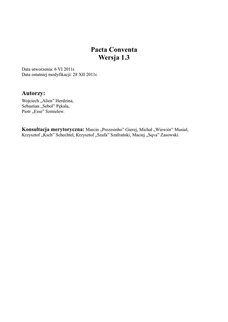 Pacta Conventa Wersja 1.3 Data utworzenia: 6 VI 2011r. Data ostatniej modyfikacji: 28 XII 2011r. Autorzy: Wojciech „Alien” Herdzina, Sebastian „Sebol” Pękala, Piotr „Esse” Szmielew. Konsultacja merytoryczna: Marcin „Prezesinho” Gierej, Michał „Wiewiór” Musiał, Krzysztof „Ksch” Schechtel, Krzysztof „Szafa” Szafrański, Maciej „Sqva” Zasowski. Wstęp: Drodzy gracze! Pacta Conventa są kolejnym, po Artykułach Henrykowskich, niezwykle ważnym dokumentem dla SGK Veto. Ich zasady stworzone są z myślą o uczestnikach turniejów, po to, aby zapewnić im równe szanse i możliwie komfortowe warunki gry. Nawet jeśli niektóre spośród nich mogą wydawać się oczywiste, albo budzić nasz sprzeciw, należy zastanowić się, czy są oczywiste dla wszystkich i czy sprzeciwiając się bierzemy pod uwagę okoliczności nieprzewidziane. Dla przykładu: wiele osób śmieje się z obowiązku przekładania lub tasowania talii przeciwnika. Wydaje się oczywistym, że jeśli nie chcę, to nie muszę rywala sprawdzać lub o cokolwiek podejrzewać. Tymczasem jest zupełnie inaczej. Co zrobić jeśli do tej pory nie przekładałem talii i nagle siadam do gry z kimś kogo nie znam? Przełożę to pomyśli, że mu nie ufam. Tymczasem obowiązek przekładania rozwiązuje tę sytuację – nie chodzi o zaufanie, lecz o zasadę turnieju! Co więcej mogą pojawić się gracze, którzy oszukują przy rozkładzie kart, a którzy zaczną posługiwać się hasłami: ja Ci wierzę to Ci nie przekładam, albo honorowi gracze nie tasują talii innym. Próba zrobienia tego jest zarzuceniem nieuczciwości rywalowi, albo ujmą na własnym honorze! Nie może być też tak, że gracz będzie bał się zwrócić uwagę rywalowi, albo nie zrobi tego, bo wyszedłby w oczach innych na osobę, która chce wygrać za wszelką cenę. Obowiązek zgłaszania naruszeń w grze zmienia tę sytuację – zwracam Ci uwagę ponieważ muszę to zrobić. Rozpisuję się nad tymi przykładami celowo, ponieważ wiem, że część z Was woli zasady honorowe, oparte na wzajemnym zaufaniu itd. Rozumiem to, ponieważ sam też takie preferuję i wiem, jak szczególne jest nasze środowisko i ile wartościowych osób w nim się zajmuje. Pamiętajmy jednak, że nasza gra cały czas się powiększa i dostawać się będą do niej różni ludzie. Również Ci nieuczciwi. Za każdym razem, kiedy macie wątpliwości co do jakiegoś zagrania podnoście rękę i wołajcie sędziego. Nie zdawajcie się na orzeczenia rywala. Marszałkowie i sędziowie powinni stosować się do wszystkich punktów niniejszego dokumentu. Próba lokalnych zmian zasad jest niemile widziana o tyle, że każda osoba, której te lokalne zmiany się nie podobają będzie na straconej pozycji, musząc dostosować się do ogółu. Oczywiście niektóre zmiany można przedyskutować z osobami z wydawnictwa i obowiązkowo ogłosić je na kilka przynajmniej dni przed turniejem. Mam nadzieję, że zasady uznacie za przydatne i podejdziecie do nich ze zrozumieniem. Pozdrawiam serdecznie! Krzysztof „Ksch” Schechtel 2 Lista zmian w stosunku do poprzedniej wersji: Od ostatniego wydania zmienione zostało dużo tekstu na zasadzie redakcji. W niniejszym rozdziale przedstawiamy listę istotnych zmian. Było: 1.3. Marszałek, 1.4 Sędzia (itd) Dodano: 1.2.1 Organizator (więcej w treści dokumentu) Dodano: 2.4.1 Przeliczanie znaczników na kreski (więcej w treści dokumentu) Dodano: 6.2.6 Problem z talią lub spisem talii (rozszerzony opis kar) 7.4.2 Klasa mistrzowska Dodano: W roku kalendarzowym 2012 organizowanych będzie 9 turniejów klasy mistrzowskiej w tym IMP, DMP i Mistrzostwa Par. Maksymalnie 25% turniejów (czyli 2) może odbywać się w jednym mieście. 7.5: Punktacja rankingu Dodano: 7.5.1 Rok 2011 (poniżej treść niezmieniona) 7.5.2 Rok 2012 Każdy gracz ma klasyfikowane do rankingu najlepsze swoje: • 4 turnieje mistrzowskie • 4 turnieje lokalne: kwarciane, • 4 turnieje lokalne: wybranieckie. Turnieje mistrzowskie (liczba punktów niezależna od liczby graczy): #1 miejsce = 90, #2 miejsce = 78, #3 miejsce = 69, #4 miejsce = 61, #5 miejsce = 54, #6 miejsce = 47, #7 miejsce = 41, #8 miejsce = 35, #9 miejsce = 25, #10 miejsce = 22, #11 miejsce = 20, #12 miejsce = 18, #13 miejsce = 16, #14 miejsce = 14, #15 miejsce = 12, #16 miejsce = 11, Pozostali uczestnicy 10pkt za udział. Premia za odwiedzenie innego ośrodka o ponad 100km drogi +10 pkt. Na turnieju mistrzowskim wymagana jest obecność minimum 16 osób - w przeciwnym wypadku gracze dostają nagrody należne za turniej mistrzowski, ale punkty do rankingu otrzymują jak za 3 turniej lokalny. Turnieje lokalne: Liczba punktów zależy od liczby uczestników turnieju = LU. #1 miejsce = LU + 15 (maksimum 40pkt) #2 miejsce = LU + 8 (maksimum 33pkt) #3 miejsce = LU + 5 (maksimum 30pkt) #4 miejsce = LU + 2 (maksimum 27) #5 miejsce = LU (maks 25) #6 miejsce = LU -1 (maks 24) #7 miejsce = LU -2 (maks 23) #8 miejsce = LU-3 (maks 22) #9 miejsce = LU -8 (maks 17) #10 miejsce = LU -9 itd. (maks 16) Minimum 6 osób, aby turniej lokalny był zaliczony do rankingu. Dodano: 7.6 Warunki obowiązujące na turniejach klasy mistrzowskiej Warunki obowiązkowe: 1. Rozgrywki prowadzone są zawsze w systemie do dwóch wygranych, jeśli turniej jest kwarciany. 2. Na masterze należy rozegrać minimum 5 rund. Jeśli liczba uczestników przekracza 32, konieczna jest 6. runda. Nie można rozgrywać jednego dnia więcej niż 6 rund. 3. Czas na rundę to minimum 1,5h 4. Terminacja oznacza dogranie bieżącej rundy. 5. Turniej musi sędziować marszałek, który musi być cały czas do dyspozycji i w dobrej dyspozycji. 6. Obowiązują spisy talii, PC i AH bez żadnych odstępstw. Marszałek, który sędziuje inaczej traci tytuł. 7. Tiebreakery - wg programu DCI Reporter. 8. Przy losowaniu swissa, lub grup, nie ma unikania mirrorów, albo gry osób z tego samego miasta. 9. Minimum osób na turnieju, aby był zaliczo