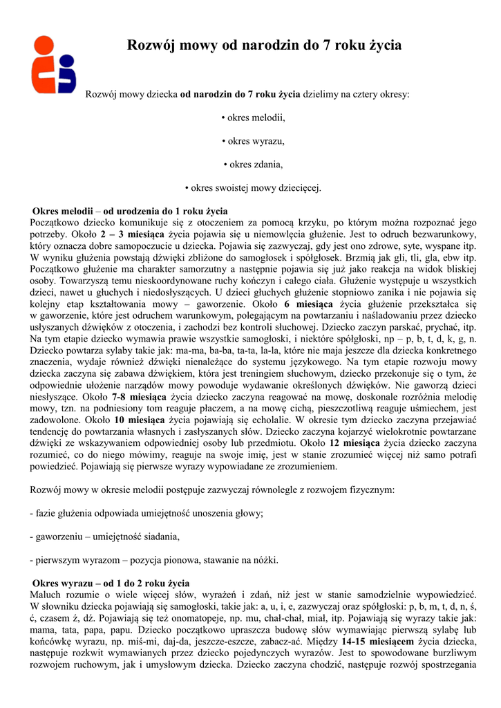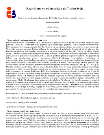 Rozwój mowy od narodzin do 7 roku życia Rozwój mowy dziecka od narodzin do 7 roku życia dzielimy na cztery okresy: • okres melodii, • okres wyrazu, • okres zdania, • okres swoistej mowy dziecięcej. Okres melodii – od urodzenia do 1 roku życia Początkowo dziecko komunikuje się z otoczeniem za pomocą krzyku, po którym można rozpoznać jego potrzeby. Około 2 – 3 miesiąca życia pojawia się u niemowlęcia głużenie. Jest to odruch bezwarunkowy, który oznacza dobre samopoczucie u dziecka. Pojawia się zazwyczaj, gdy jest ono zdrowe, syte, wyspane itp. W wyniku głużenia powstają dźwięki zbliżone do samogłosek i spółgłosek. Brzmią jak gli, tli, gla, ebw itp. Początkowo głużenie ma charakter samorzutny a następnie pojawia się już jako reakcja na widok bliskiej osoby. Towarzyszą temu nieskoordynowane ruchy kończyn i całego ciała. Głużenie występuje u wszystkich dzieci, nawet u głuchych i niedosłyszących. U dzieci głuchych głużenie stopniowo zanika i nie pojawia się kolejny etap kształtowania mowy – gaworzenie. Około 6 miesiąca życia głużenie przekształca się w gaworzenie, które jest odruchem warunkowym, polegającym na powtarzaniu i naśladowaniu przez dziecko usłyszanych dźwięków z otoczenia, i zachodzi bez kontroli słuchowej. Dziecko zaczyn parskać, prychać, itp. Na tym etapie dziecko wymawia prawie wszystkie samogłoski, i niektóre spółgłoski, np – p, b, t, d, k, g, n. Dziecko powtarza sylaby takie jak: ma-ma, ba-ba, ta-ta, la-la, które nie maja jeszcze dla dziecka konkretnego znaczenia, wydaje również dźwięki nienależące do systemu językowego. Na tym etapie rozwoju mowy dziecka zaczyna się zabawa dźwiękiem, która jest treningiem słuchowym, dziecko przekonuje się o tym, że odpowiednie ułożenie narządów mowy powoduje wydawanie określonych dźwięków. Nie gaworzą dzieci niesłyszące. Około 7-8 miesiąca życia dziecko zaczyna reagować na mowę, doskonale rozróżnia melodię mowy, tzn. na podniesiony tom reaguje płaczem, a na mowę cichą, pieszczotliwą reaguje uśmiechem, jest zadowolone. Około 10 miesiąca życia pojawiają się echolalie. W okresie tym dziecko zaczyna przejawiać tendencję do powtarzania własnych i zasłyszanych słów. Dziecko zaczyna kojarzyć wielokrotnie powtarzane dźwięki ze wskazywaniem odpowiedniej osoby lub przedmiotu. Około 12 miesiąca życia dziecko zaczyna rozumieć, co do niego mówimy, reaguje na swoje imię, jest w stanie zrozumieć więcej niż samo potrafi powiedzieć. Pojawiają się pierwsze wyrazy wypowiadane ze zrozumieniem. Rozwój mowy w okresie melodii postępuje zazwyczaj równolegle z rozwojem fizycznym: - fazie głużenia odpowiada umiejętność unoszenia głowy; - gaworzeniu – umiejętność siadania, - pierwszym wyrazom – pozycja pionowa, stawanie na nóżki. Okres wyrazu – od 1 do 2 roku życia Maluch rozumie o wiele więcej słów, wyrażeń i zdań, niż jest w stanie samodzielnie wypowiedzieć. W słowniku dziecka pojawiają się samogłoski, takie jak: a, u, i, e, zazwyczaj oraz spółgłoski: p, b, m, t, d, n, ś, ć, czasem ź, dź. Pojawiają się też onomatopeje, np. mu, chał-chał, miał, itp. Pojawiają się wyrazy takie jak: mama, tata, papa, papu. Dziecko początkowo upraszcza budowę słów wymawiając pierwszą sylabę lub końcówkę wyrazu, np. miś-mi, daj-da, jeszcze-eszcze, zabacz-ać. Między 14-15 miesiącem życia dziecka, następuje rozkwit wymawianych przez dziecko pojedynczych wyrazów. Jest to spowodowane burzliwym rozwojem ruchowym, jak i umysłowym dziecka. Dziecko zaczyna chodzić, następuje rozwój spostrzegania i pamięci dziecka, a także intensywne poznawanie otaczającego świata i nazywanie przez dziecko interesujących go przedmiotów, a także odgrywanie ich cech. Okres zdania – od 2 do 3 roku życia Między 2 a 3 rokiem życia następuje rozkwit mowy dziecka. Dziecko zaczyna budować zdania, początkowo są to zdania proste, które są złożone z dwóch, trzech wyrazów, następnie przechodzi w wypowiedzi dłuższe, cztero – pięcio wyrazowe. Pierwsze zdania są twierdzące, a następnie pojawiają się zdania pytające i rozkazujące. Dziecko używa przede wszystkim rzeczowników, czasowniki początkowo używane są w formie bezokolicznika. Przypadki są używane często niepoprawnie. Dziecko nie potrafi jeszcze wypowiadać poprawnie wszystkich głosek – głoski trudne, są zastępowane głoską łatwiejszą. Dziecko słyszy błędnie wypowiedziane słowa i poprawia je. Świadczy to o różnicowaniu słuchowym prawidłowej, jak i nieprawidłowej wymowy słów. Na tym etapie mowa dziecka jest zrozumiała nie tylko dla najbliższych, ale także dla otoczenia. W tym okresie dziecko wypowiada prawidłowo spółgłoski: p, b, m, f, w, k, g, h, t, d, n, l, oraz samogłoski ustne: a, o, u, e, y, i, a, czasem nosowe: ą, ę. Pod konie tego okresu pojawia się: s, z, c, dz, które wcześniej było zastępowane przez dziecko: ś, ź, ć, dź. Okres swoistej mowy dziecka – od 3 do 7 roku życia Mowa w dalszym ciągu się rozwija, następuje rozwój artykulacyjny, wzbogaca się zasób słownictwa, rozwija się umiejętność budowania zdań złożonych. U czterolatków w dalszym ciągu występują zniekształcenia, ale w nieco mniejszym stopniu. Pojawiają się neologizmy. Dziecko 3 letnie, potrafi porozumieć się z otoczeniem, jego mowa jest już w pewnym stopniu ukształtowana, jednak jej rozwój odbywa się w dalszym ciągu i często pojawiają się błędy. Dziecko trzyletnie powinno już wymawiać wszystkie samogłoski ustne i nosowe, spółgłoski: p, b, m, f, w, ś, ź, ć, dź, ń, k, g, h, t, t, d, n, l, ł, j. Pojawiają się również głoski takie jak: s, z, c, dz. Dziecko już umie wypowiadać większość z tych głosek poprawnie w izolacji, a w mowie potocznej zastępuje je zaś głoskami łatwiejszymi. Dziecko zmiękcza głoski: s, z, c, dz, sz, ż, cz, dż na głoski: 