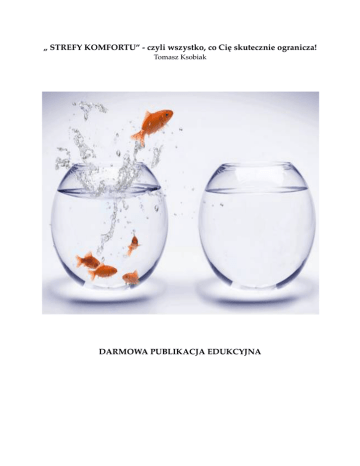 „ STREFY KOMFORTU” - czyli wszystko, co Cię skutecznie ogranicza! Tomasz Ksobiak DARMOWA PUBLIKACJA EDUKCYJNA Informacje o autorze: Tomasz Ksobiak Kontakt: E-mail: [email protected] www.manifestzwyciezcy.pl „Strefy Komfortu” - czyli wszystko, co Cię skutecznie ogranicza! Self – Publishing. Projekt okładki: Tomasz Ksobiak Tekst i redakcja: Tomasz Ksobiak Numer ISBN: 978-83-946837-0-2 Data wydania: 18.12.2016 Numer wydania: 1. Niniejsza treść stanowi własność intelektualną jej autora. Jest chroniona obowiązującym w Polsce prawem autorskim. Kopiowanie treści oraz udostępnianie jej bez zgody i wiedzy autora jest zabronione. Mam do Ciebie prośbę. Nie myśl o pieniądzach i saldzie swojego konta. Nie myśl o rodzinie i wspólnych wakacjach na Lazurowym Wybrzeżu. Nie myśl o sukcesie zawodowym, lepszym życiu i wyższym statusie społecznym. Pomyśl za to o innej rzeczy. Wyobraź sobie ciepłą, piaszczystą plażę o zachodzie słońca. Stoisz na niej i patrzysz w dal aż po sam kres widnokręgu. Słyszysz kojący szum morza. Delektujesz się ciszą... lekki wiatr opływa dosłownie Twoje ciało. Spójrz na siebie. Nie masz zegarka. Komórka została w hotelu. Jesteś tylko Ty i wszechogarniająca Cię natura...nic nie musisz. Zachodzące Słońce karmi Cię kojącym kolorem a Twój świadomy umysł jest całkowicie odciążony. Nie analizujesz rzeczywistości. Nie toczysz wewnętrznej walki. Nie zadajesz sobie trudnych pytań o życie. Czy to nie wspaniałe uczucie? Czy domyślasz się już, co mam Ci do powiedzenia? Stojąc na brzegu, całkowicie zrelaksowany i wolny od obowiązków codzienności, od pytań swojego szefa, od oczekiwań najbliższych, pomyśl kim naprawdę jesteś! Wyświetl w swoim umyśle film, którego jesteś reżyserem. W tej chwili nie liczy się nic więcej niż Ty sam. W tym momencie pozwalasz sobie bez zbędnych ograniczeń na bycie pozytywnym egoistą! Założę się, że czujesz się wspaniale! Całkowicie wolny od ograniczeń. Świadomy samego siebie. Z pewnością chcesz, aby tak właśnie wyglądał każdy Twój dzień. Wszyscy dążymy do wewnętrznego spokoju i harmonii z samym sobą. Taka jest natura ludzka. Niestety na drodze do spokoju i szczęścia jest wiele przeszkód. Niewłaściwi ludzie. Fałszywi przyjaciele. Znajomi, którzy chcą abyś zawsze był do ich dyspozycji. I ten najważniejszy wróg publiczny numer jeden... Twoje własne strefy komfortu! Strefy komfortu? - zapytasz... a co to właściwie jest?! Strefa komfortu to coś, co tworzysz Ty sam. Coś, co kreuje Twój własny, świadomy umysł. To Twoje własne, mentalne więzienie i teraz odbywasz swój zasądzony wyrok. Nie przejmuj się jednak. Nie jesteś sam! Masz wokół siebie wielu współwięźniów, którzy również zostali osądzeni przez ich racjonalne umysły. Człowiek ma naturalną tendencję do tworzenia stref komfortu. Pomyśl przez chwilę... i przeanalizuj poniższy przykład, przedstawiony w dwóch wariantach: Wariant 1. Prowadzisz dużą, prężnie rozwijającą się firmę. Sprzedaż wzrasta lawinowo. Twoje produkty stają się bestsellerami. Musisz zwiększyć produkcję, gdyż zwyczajnie nie „wyrabiasz” z terminową realizacją zamówień. Musisz zatrudnić nowych ludzi do pracy, bo inaczej stracisz pozycję lidera na rynku. Ogłaszasz zatem zamiar zatrudnienia specjalistów i przeprowadzasz rekrutację. Spotykasz się z kandydatami na potencjalnych pracowników i finalnie podejmujesz decyzję o ich zatrudnieniu. Uzyskujesz zamierzony efekt. Już wiesz, że możesz zagwarantować ciągłość produkcji i dostaw Twojego produktu do zainteresowanych odbiorców. Czujesz się doskonale. Znowu wygrałeś. Nie dosyć, że wyrosłeś na lidera w swojej branży, to jeszcze dzięki sprawnej rekrutacji zwiększyłeś produkcję. Zagwarantowałeś sobie właśnie sukces w najlepszym wydaniu i możesz być z siebie dumny! Wariant 2. Chwilowo jesteś bezrobotny. Szukasz stałego, stabilnego zatrudnienia, które pozwoli Ci na realizację wielu potrzeb życiowych. Jesteś specjalistą. Znasz swoją wartość i wiesz, na jakim poziomie są Twoje umiejętności. Zasadniczo nie powinieneś martwić się o pracę. Każdy chciałby mieć takiego pracownika jak Ty. Jesteś sumienny, zawsze wykonujesz polecenia przełożonego i przykładasz się do powierzonych Ci zadań. Niemniej jesteś również człowiekiem świadomym. Wiesz doskonale, że konkurencja na rynku pracy jest bardzo duża. Wiele innych osób, równie dobrze wykształconych i posiadających podobne doświadczenie zawodowe jak Ty również szuka pracy. I nadchodzi ten dzień. Po żmudnym i męczącym wysyłaniu swojego cv do pracodawców, zostałeś zaproszony na rozmowę kwalifikacyjną. Oczywiście, że jesteś zdenerwowany. Kto by nie był...W końcu od efektu tej rozmowy zależy, czy będziesz mógł utrzymać rodzinę! Mimo zdenerwowania i rosnącego stresu, który dosłownie „zjada Cię” krok po kroku dopijasz najmocniejszą kawę w swoim życiu, a następnie wkładasz najlepszy garnitur i wychodzisz z domu. Droga do miejsca docelowego to istny koszmar. Mimo, że wyszedłeś godzinę wcześniej masz świadomość, że możesz nie zdążyć...utknąłeś w korku, który zdaje się nie mieć końca. Nerwowo spoglądasz na zegarek. Cenne minuty upływają, a Ty nadal masz do przebycia maraton! Twoje zdenerwowanie przekłada się na zachowanie. Wykonujesz nerwowe manewry. I tak przez kolejne 25 minut. Wreszcie możesz ruszać i płynnie dojechać do celu, jednak z tyłu głowy jakiś donośny głos krzyczy Ci do ucha „NIE ZDĄŻYSZ!”...Udało się i... po upływie kolejnych 30 minut możesz cieszyć się nową posadą! Powyżej pokazałem Ci dwie sytuacje, które w sposób doskonały i szczegółowy pozwolą Ci dowiedzieć się, czym są strefy komfortu. Strefa komfortu, to miejsce, w którym czujesz się dobrze! To obszar Twojego jestestwa, który gwarantuje Ci bezpieczeństwo! Z pewności