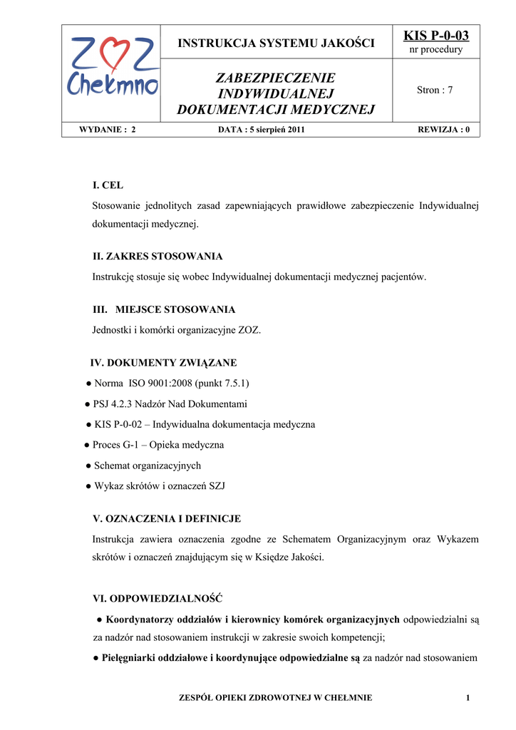 INSTRUKCJA SYSTEMU JAKOŚCI ZABEZPIECZENIE INDYWIDUALNEJ DOKUMENTACJI MEDYCZNEJ WYDANIE : 2 DATA : 5 sierpień 2011 KIS P-0-03 nr procedury Stron : 7 REWIZJA : 0 I. CEL Stosowanie jednolitych zasad zapewniających prawidłowe zabezpieczenie Indywidualnej dokumentacji medycznej. II. ZAKRES STOSOWANIA Instrukcję stosuje się wobec Indywidualnej dokumentacji medycznej pacjentów. III. MIEJSCE STOSOWANIA Jednostki i komórki organizacyjne ZOZ. IV. DOKUMENTY ZWIĄZANE ● Norma ISO 9001:2008 (punkt 7.5.1) ● PSJ 4.2.3 Nadzór Nad Dokumentami ● KIS P-0-02 – Indywidualna dokumentacja medyczna ● Proces G-1 – Opieka medyczna ● Schemat organizacyjnych ● Wykaz skrótów i oznaczeń SZJ V. OZNACZENIA I DEFINICJE Instrukcja zawiera oznaczenia zgodne ze Schematem Organizacyjnym oraz Wykazem skrótów i oznaczeń znajdującym się w Księdze Jakości. VI. ODPOWIEDZIALNOŚĆ ● Koordynatorzy oddziałów i kierownicy komórek organizacyjnych odpowiedzialni są za nadzór nad stosowaniem instrukcji w zakresie swoich kompetencji; ● Pielęgniarki oddziałowe i koordynujące odpowiedzialne są za nadzór nad stosowaniem ZESPÓŁ OPIEKI ZDROWOTNEJ W CHEŁMNIE 1 INSTRUKCJA SYSTEMU JAKOŚCI KIS P-0-03 ZABEZPIECZENIE INDYWIDUALNEJ DOKUMENTACJI MEDYCZNEJ WYDANIE : 2 DATA : 5 sierpień 2011 nr procedury Stron : 7 REWIZJA : 0 instrukcji w zakresie dokumentowania opieki pielęgniarskiej/położniczej; ● Koordynator SZJ odpowiedzialny jest za: ► nadzorowanie prawidłowej realizacji instrukcji; ► coroczną weryfikację instrukcji i ocenę jej realizacji na Przeglądzie Zarządzania; VII. OPIS POSTĘPOWANIA Zasady zabezpieczenia indywidualnej dokumentacji medycznej: ► Historia Choroby zakładana jest w Izbie Przyjęć i przenoszona do oddziału przez pielęgniarkę lub ratownika; ► Z chwilą przyjęcia pacjenta/ki w oddział dokumentacja jest przekazywana pielęgniarce danego oddziału; ► W czasie przewożenia pacjenta/ki na blok operacyjny Indywidualna Dokumentacja Medyczna zostaje przekazana przez pielęgniarkę przywożącą pacjenta/kę pielęgniarce anestezjologicznej bloku operacyjnego; ► W czasie trwania zabiegu lub operacji znajduje się na stanowisku pracy anestezjologa; ► W czasie pobytu chorej w sali pooperacyjnej IDM znajduje się w dyżurce pielęgniarskiej; ► W czasie trwania badań diagnostycznych lub konsultacji nadzór nad IDM sprawuje personel medyczny (lekarz, pielęgniarka); ► Dokumentacja medyczna znajduje się pod nadzorem personelu medycznego i jest przechowywana w: ▪ pokojach lekarskich; ▪ dyżurkach pielęgniarskich; ▪ rejestracjach; ZESPÓŁ OPIEKI ZDROWOTNEJ W CHEŁMNIE 2 INSTRUKCJA SYSTEMU JAKOŚCI KIS P-0-03 ZABEZPIECZENIE INDYWIDUALNEJ DOKUMENTACJI MEDYCZNEJ WYDANIE : 2 DATA : 5 sierpień 2011 nr procedury Stron : 7 REWIZJA : 0 ► Dokumentacja medyczna jest przechowywana w miejscach niedostępnych dla osób nieupoważnionych; Udostępnianie indywidualnej dokumentacji medycznej ● Dokumentacja medyczna jest udostępniana: ► do wglądu w ZOZ; ► poprzez sporządzenie jej wyciągów, odpisów lub kopii; ► poprzez wydanie oryginału za pokwitowaniem odbioru i z zastrzeżeniem zwrotu po wykorzystaniu, jeżeli uprawniony organ lub podmiot żąda udostępnienia oryginałów tej dokumentacji. ● Za udostępnienie dokumentacji medycznej w formie wyciągów, odpisów lub kopii, ZOZ może pobierać opłatę. Maksymalna wysokość opłaty za jedną stronę wyciągu lub odpisu dokumentacji medycznej - nie może przekraczać 0,002 przeciętnego wynagrodzenia (dotyczy to również udostępniania dokumentacji na elektronicznym nośniku), jedną stronę kopii dokumentacji medycznej - nie może przekraczać 0,0002 przeciętnego wynagrodzenia. ● Aby uzyskać wyciąg, odpis lub kopię dokumentacji medycznej należy złożyć pisemny wniosek o wydanie kopii dokumentacji medycznej w sekretariacie ZOZ lub w Dziale Statystyki Medycznej ZOZ w Chełmnie; ● Dokumentację medyczną można udostępnić wyłącznie pacjentowi oraz tej osobie, której nazwisko pacjent zgłosił do dokumentacji w momencie przyjęcia do szpitala; ● W przypadku odbioru dokumentacji przez osobę upoważnioną, dodatkowo należy złożyć upoważnienie do wydania kopii dokumentacji medycznej; ZESPÓŁ OPIEKI ZDROWOTNEJ W CHEŁMNIE 3 INSTRUKCJA SYSTEMU JAKOŚCI KIS P-0-03 ZABEZPIECZENIE INDYWIDUALNEJ DOKUMENTACJI MEDYCZNEJ WYDANIE : 2 DATA : 5 sierpień 2011 nr procedury Stron : 7 REWIZJA : 0 ● Udostępnienie dokumentacji medycznej nastąpi w terminie do 7 dni roboczych, licząc od daty złożenia wniosku, odbiór w Dziale Statystyki Medycznej ZOZ lub odpowiedniej Poradni; ● W przypadku gdy udostępnienie dokumentacji nie jest możliwe, odmowa wymaga zachowania formy pisemnej oraz podania przyczyny. VIII. ZAŁĄCZNIKI Załącznik 1 – Wniosek o wydanie kopii dokumentacji medycznej Załącznik 2 – Upoważnienie do wydania kopii dokumentacji medycznej Załącznik 3 - Karta zmian ZESPÓŁ OPIEKI ZDROWOTNEJ W CHEŁMNIE 4