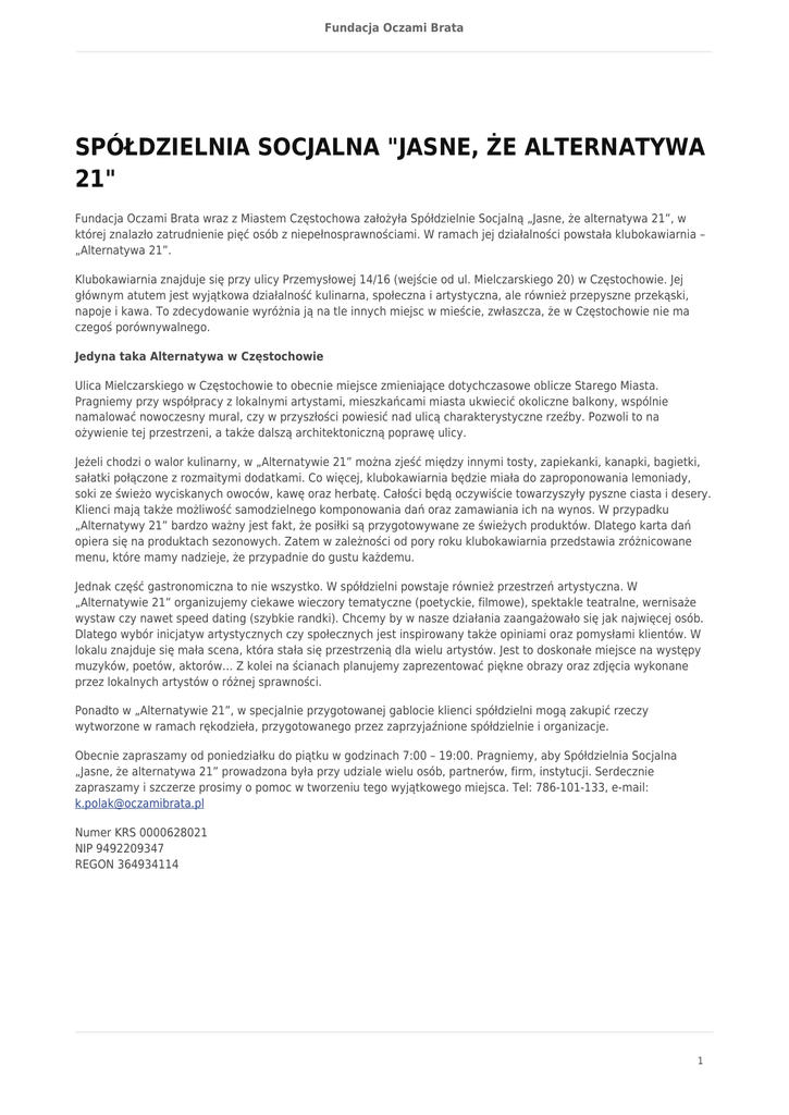 Fundacja Oczami Brata SPÓŁDZIELNIA SOCJALNA "JASNE, ŻE ALTERNATYWA 21" Fundacja Oczami Brata wraz z Miastem Częstochowa założyła Spółdzielnie Socjalną „Jasne, że alternatywa 21”, w której znalazło zatrudnienie pięć osób z niepełnosprawnościami. W ramach jej działalności powstała klubokawiarnia – „Alternatywa 21”. Klubokawiarnia znajduje się przy ulicy Przemysłowej 14/16 (wejście od ul. Mielczarskiego 20) w Częstochowie. Jej głównym atutem jest wyjątkowa działalność kulinarna, społeczna i artystyczna, ale również przepyszne przekąski, napoje i kawa. To zdecydowanie wyróżnia ją na tle innych miejsc w mieście, zwłaszcza, że w Częstochowie nie ma czegoś porównywalnego. Jedyna taka Alternatywa w Częstochowie Ulica Mielczarskiego w Częstochowie to obecnie miejsce zmieniające dotychczasowe oblicze Starego Miasta. Pragniemy przy współpracy z lokalnymi artystami, mieszkańcami miasta ukwiecić okoliczne balkony, wspólnie namalować nowoczesny mural, czy w przyszłości powiesić nad ulicą charakterystyczne rzeźby. Pozwoli to na ożywienie tej przestrzeni, a także dalszą architektoniczną poprawę ulicy. Jeżeli chodzi o walor kulinarny, w „Alternatywie 21” można zjeść między innymi tosty, zapiekanki, kanapki, bagietki, sałatki połączone z rozmaitymi dodatkami. Co więcej, klubokawiarnia będzie miała do zaproponowania lemoniady, soki ze świeżo wyciskanych owoców, kawę oraz herbatę. Całości będą oczywiście towarzyszyły pyszne ciasta i desery. Klienci mają także możliwość samodzielnego komponowania dań oraz zamawiania ich na wynos. W przypadku „Alternatywy 21” bardzo ważny jest fakt, że posiłki są przygotowywane ze świeżych produktów. Dlatego karta dań opiera się na produktach sezonowych. Zatem w zależności od pory roku klubokawiarnia przedstawia zróżnicowane menu, które mamy nadzieje, że przypadnie do gustu każdemu. Jednak część gastronomiczna to nie wszystko. W spółdzielni powstaje również przestrzeń artystyczna. W „Alternatywie 21” organizujemy ciekawe wieczory tematyczne (poetyckie, filmowe), spektakle teatralne, wernisaże wystaw czy nawet speed dating (szybkie randki). Chcemy by w nasze działania zaangażowało się jak najwięcej osób. Dlatego wybór inicjatyw artystycznych czy społecznych jest inspirowany także opiniami oraz pomysłami klientów. W lokalu znajduje się mała scena, która stała się przestrzenią dla wielu artystów. Jest to doskonałe miejsce na występy muzyków, poetów, aktorów… Z kolei na ścianach planujemy zaprezentować piękne obrazy oraz zdjęcia wykonane przez lokalnych artystów o różnej sprawności. Ponadto w „Alternatywie 21”, w specjalnie przygotowanej gablocie klienci spółdzielni mogą zakupić rzeczy wytworzone w ramach rękodzieła, przygotowanego przez zaprzyjaźnione spółdzielnie i organizacje. Obecnie zapraszamy od poniedziałku do piątku w godzinach 7:00 – 19:00. Pragniemy, aby Spółdzielnia Socjalna „Jasne, że alternatywa 21” prowadzona była przy udziale wielu osób, partnerów, firm, instytucji. Serdecznie zapraszamy i szczerze prosimy o pomoc w tworzeniu tego wyjątkowego miejsca. Tel: 786-101-133, e-mail: [email protected] Numer KRS 0000628021 NIP 9492209347 REGON 364934114 1