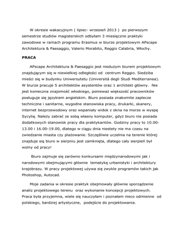 W okresie wakacyjnym ( lipiec- wrzesień 2013 ) po pierwszym semestrze studiów magisterskich odbyłam 3 miesięczne praktyki zawodowe w ramach programu Erasmus w biurze projektowym APscape Architektura & Paesaggio, Valerio Morabito, Reggio Calabria, Włochy. PRACA APscape Architektura & Paesaggio jest niedużym biurem projektowym znajdującym się w niewielkiej odległości od centrum Reggio. Siedziba mieści się w budynku Uniwersytetu (Università degli Studi Mediterranea). W biurze pracuje 5 architektów asystentów oraz 1 architekt główny. Nie jest konieczna znajomość włoskiego, ponieważ większość pracowników posługuje się językiem angielskim. Biuro posiada znakomite zaplecze techniczne i sanitarne, wygodne stanowiska pracy, drukarki, skanery, internet bezprzewodowy oraz wspaniały widok z okna na morze w wyspę Sycylię. Należy zabrać ze sobą własny komputer, gdyż biuro nie posiada dodatkowych stanowisk pracy dla praktykantów. Godziny pracy to 10.0013.00 i 16.00-19.00, dlatego w ciągu dnia niestety nie ma czasu na zwiedzanie miasta czy plażowanie. Szczęśliwie uczelnia na terenie której znajduje się biuro w sierpniu jest zamknięta, dlatego cały sierpień był wolny od pracy! Biuro zajmuje się zarówno konkursami międzynarodowymi jak i narodowymi obejmującymi głównie tematykę urbanistyki i architektury krajobrazu. W pracy projektowej używa się zwykle programów takich jak Photoshop, Autocad. Moje zadania w okresie praktyk obejmowały głównie sporządzenie analiz projektowego terenu oraz wykonanie koncepcji projektowych. Praca była przyjemna, wiele się nauczyłam i poznałam nieco odmienne od polskiego, bardziej artystyczne, podejście do projektowania. ŻYCIE W REGGIO CALABRIA Mieszkanie- znalezienie odpowiedniego mieszkania nie jest proste. W moim przypadku pomogła znajoma, która studiowała w Reggio w ramach programu Erasmus. Okazało się, że mieszkanie które poleciła jest w dobrym stanie i znajduje się w pobliżu biura projektowego a tym samym w niedaleko centrum miasta. Wynajęliśmy mieszkanie wraz z dwojgiem znajomych, którzy wyjechali ze mną na praktykę. Każdy miał własny pokój, ponieważ jest to typowe w tym rejonie. Koszt wynajmu za miesiąc wyniósł 200 Euro + rachunki za prąd i wodę około 30 Euro. Ponadto zapłaciliśmy także kaucję zwrotną w wysokości 200 Euro. Wyżywienie- typowymi włoskimi potrawami są: pasta ( różne rodzaje makaronu najczęściej z sosem pomidorowym, przyprawami, serem, ale także z pesto, warzywami, tuńczykiem), pizza ( za 5 Euro można zjeść pyszną dużą pizzę w restauracji, w mieście znajduje się kilka punktów które oferują pizzę w kawałkach po 2 Euro, jednak nie jest już ona aż tak dobra), ryby ( pesce spada- miecznik, orata, krewetki ), lody ( do wyboru mnóstwo różnych smaków od typowych czekoladowe, śmietankowe, po wyszukane smaki melonowe, ricotta z gruszką… , cornetti – rogaliki z ciasta francuskiego z kremem, czekoladą lub marmoladą zwykle na śniadanie razem z kawą świeże owoce i warzywa ( najlepiej kupować na targu np. przy Viale Amendola , polecam zwłaszcza arbuza, figi, melona, bakłażany, pomidory Komunikacja- w Reggio nie istnieje rozkład jazdy autobusów, czasem trzeba czekać na autobus nawet około godziny, co może stanowić problem gdy trzeba dotrzeć do biura na czas. Istnieje możliwość wyrobienia karty studenta na uczelni, dzięki której można przemieszczać się autobusem za darmo. Pociągi poza dniami świątecznymi jeżdżą często i w przeciwieństwie do autobusów zwykle zgodnie z rozkładem. Język- Warto przed wyjazdem poznać chociaż podstawy włoskiego, ponieważ w Reggio tylko nieliczni mówią po angielsku. Jednak Włosi są pozytywnie nastawionymi do życia ludźmi, uśmiechnięci, otwarci i pomocni nawet w przypadku barier językowych. Warto zapytać w biurze projektowym o kurs językowy na Uniwersytecie Dante Alighieri. Jest to intensywny kurs (3-5 godzin dziennie) prowadzony na wszystkich poziomach zaawansowania. Dla osób uczestniczących w programie Erasmus kurs jest bezpłatny! Po ukończeniu kursu i zdaniu egzaminu, otrzymuje się certyfikat znajomości języka na danym poziomie. Uczestnicząc w kursie można brać udział w wielu festiwalach, wycieczkach i wyjazdach organizowanych przez uniwersytet. Na uniwersytecie panuje bardzo przyjazna atmosfera, można poznać wielu wspaniałych ludzi z całego świata. Atrakcje- W Reggio, zwłaszcza w lipcu i sierpniu, dzieję się bardzo dużo. Co wieczór odbywają się koncerty, organizowane są festiwale, wszyscy wychodzą na ulice by wspólnie się bawić. Miasto tętni życiem. We wrześniu, gdy turystów jest już mniej takie atrakcje mają miejsce już tylko w weekendy. PODRÓŻE Warto będąc w Reggio wybrać się na wyspę Sycylię, która jest oddalona jedynie o 4 km. Codziennie kursują tam promy ( bilet w dwie strony z Reggio do Messiny najbliższej miejscowości na Sycylii około 6 Euro ). Wyprawa na sycylijski wulkan Etnę z pewnością będzie niezapomnianym przeżyciem. Kolejnym miejscem wartym polecenia jest Scilla z cudowną plażą oraz urokliwym miasteczkiem i zamkiem na skale. Można dostać się tam pociągiem ( 30 min, bilet około 2 Euro ). Pizzo i Tropea (wycieczka organizowana przez szkołę językową; koszt 10 Euro). W obydwu miastach znajdują się malownicze plaże, w Pizzo warto zwiedzić niezwykły kościół w skale, a w Tropei zjeść lokalny przysmak lody tartuffo nero. Bardzo polecam również wybrać się do Rzymu. Z Reggio kursują autokary ( bilet w dwie strony około 90 Euro, czas podróży 9 godzin). Najlepiej zarezerwować hotel w centrum miasta np. przy stacji Roma Termini, cena za nocleg ze śniadaniem to około 25 Euro. Warto spędzić w Rzymie przynajmniej 3 dni, przy dobrej organizacji i intensywnym planie zwiedzania uda się w tak krótkim czasie zobaczyć najważniejsze zabytki. Dobrze jest kupić wcześniej przez inte