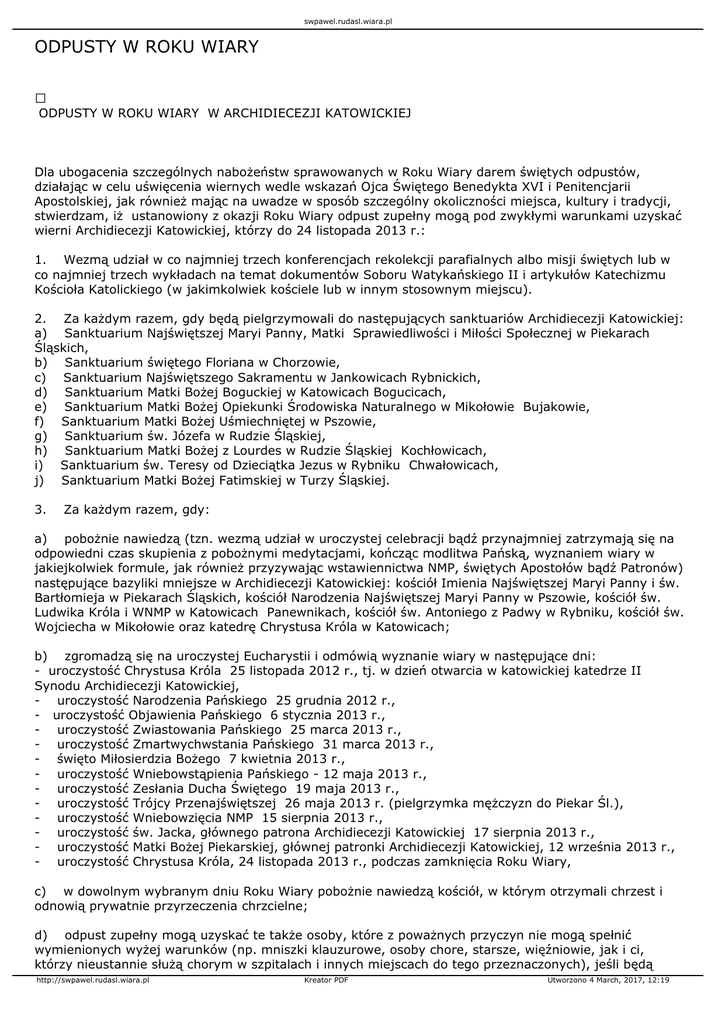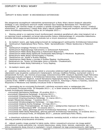 swpawel.rudasl.wiara.pl ODPUSTY W ROKU WIARY ODPUSTY W ROKU WIARY W ARCHIDIECEZJI KATOWICKIEJ Dla ubogacenia szczególnych nabożeństw sprawowanych w Roku Wiary darem świętych odpustów, działając w celu uświęcenia wiernych wedle wskazań Ojca Świętego Benedykta XVI i Penitencjarii Apostolskiej, jak również mając na uwadze w sposób szczególny okoliczności miejsca, kultury i tradycji, stwierdzam, iż ustanowiony z okazji Roku Wiary odpust zupełny mogą pod zwykłymi warunkami uzyskać wierni Archidiecezji Katowickiej, którzy do 24 listopada 2013 r.: 1. Wezmą udział w co najmniej trzech konferencjach rekolekcji parafialnych albo misji świętych lub w co najmniej trzech wykładach na temat dokumentów Soboru Watykańskiego II i artykułów Katechizmu Kościoła Katolickiego (w jakimkolwiek kościele lub w innym stosownym miejscu). 2. Za każdym razem, gdy będą pielgrzymowali do następujących sanktuariów Archidiecezji Katowickiej: a) Sanktuarium Najświętszej Maryi Panny, Matki Sprawiedliwości i Miłości Społecznej w Piekarach Śląskich, b) Sanktuarium świętego Floriana w Chorzowie, c) Sanktuarium Najświętszego Sakramentu w Jankowicach Rybnickich, d) Sanktuarium Matki Bożej Boguckiej w Katowicach Bogucicach, e) Sanktuarium Matki Bożej Opiekunki Środowiska Naturalnego w Mikołowie Bujakowie, f) Sanktuarium Matki Bożej Uśmiechniętej w Pszowie, g) Sanktuarium św. Józefa w Rudzie Śląskiej, h) Sanktuarium Matki Bożej z Lourdes w Rudzie Śląskiej Kochłowicach, i) Sanktuarium św. Teresy od Dzieciątka Jezus w Rybniku Chwałowicach, j) Sanktuarium Matki Bożej Fatimskiej w Turzy Śląskiej. 3. Za każdym razem, gdy: a) pobożnie nawiedzą (tzn. wezmą udział w uroczystej celebracji bądź przynajmniej zatrzymają się na odpowiedni czas skupienia z pobożnymi medytacjami, kończąc modlitwa Pańską, wyznaniem wiary w jakiejkolwiek formule, jak również przyzywając wstawiennictwa NMP, świętych Apostołów bądź Patronów) następujące bazyliki mniejsze w Archidiecezji Katowickiej: kościół Imienia Najświętszej Maryi Panny i św. Bartłomieja w Piekarach Śląskich, kościół Narodzenia Najświętszej Maryi Panny w Pszowie, kościół św. Ludwika Króla i WNMP w Katowicach Panewnikach, kościół św. Antoniego z Padwy w Rybniku, kościół św. Wojciecha w Mikołowie oraz katedrę Chrystusa Króla w Katowicach; b) zgromadzą się na uroczystej Eucharystii i odmówią wyznanie wiary w następujące dni: - uroczystość Chrystusa Króla 25 listopada 2012 r., tj. w dzień otwarcia w katowickiej katedrze II Synodu Archidiecezji Katowickiej, - uroczystość Narodzenia Pańskiego 25 grudnia 2012 r., - uroczystość Objawienia Pańskiego 6 stycznia 2013 r., - uroczystość Zwiastowania Pańskiego 25 marca 2013 r., - uroczystość Zmartwychwstania Pańskiego 31 marca 2013 r., - święto Miłosierdzia Bożego 7 kwietnia 2013 r., - uroczystość Wniebowstąpienia Pańskiego - 12 maja 2013 r., - uroczystość Zesłania Ducha Świętego 19 maja 2013 r., - uroczystość Trójcy Przenajświętszej 26 maja 2013 r. (pielgrzymka mężczyzn do Piekar Śl.), - uroczystość Wniebowzięcia NMP 15 sierpnia 2013 r., - uroczystość św. Jacka, głównego patrona Archidiecezji Katowickiej 17 sierpnia 2013 r., - uroczystość Matki Bożej Piekarskiej, głównej patronki Archidiecezji Katowickiej, 12 września 2013 r., - uroczystość Chrystusa Króla, 24 listopada 2013 r., podczas zamknięcia Roku Wiary, c) w dowolnym wybranym dniu Roku Wiary pobożnie nawiedzą kościół, w którym otrzymali chrzest i odnowią prywatnie przyrzeczenia chrzcielne; d) odpust zupełny mogą uzyskać te także osoby, które z poważnych przyczyn nie mogą spełnić wymienionych wyżej warunków (np. mniszki klauzurowe, osoby chore, starsze, więźniowie, jak i ci, którzy nieustannie służą chorym w szpitalach i innych miejscach do tego przeznaczonych), jeśli będą http://swpawel.rudasl.wiara.pl Kreator PDF Utworzono 4 March, 2017, 12:19 swpawel.rudasl.wiara.pl jednoczyć się duchowo np. podczas transmisji telewizyjnych lub radiowych uroczystości Roku Wiary pod przewodnictwem Ojca Świętego lub Arcybiskupa Metropolity katowickiego i odmówią modlitwy: Ojcze nasz, wyznanie wiary oraz inne modlitwy odpowiadające celom Roku Wiary, ofiarując jednocześnie swoje cierpienia i niewygody. Przypominam wiernym, iż wedle norm prawa powszechnego (Enchiridion Indulgentiarum. Normae et Concessiones, quarta editio, Libreria Editrice Vaticana 1999) z łaską odpustu zupełnego łączy się również uczestniczenie w ćwiczeniach duchowych (np. rekolekcjach), trwających przynajmniej trzy pełne dni. Zachęcam zatem, by celem szczególnego pogłębienia duchowości w trakcie Roku Wiary wziąć udział w rekolekcjach zamkniętych w jednym z archidiecezjalnych domów rekolekcyjnych: Domu Rekolekcyjnym Archidiecezji Katowickiej im. bp. Stanisława Adamskiego w Wodzisławiu Śląskim Kokoszycach, Domu Rekolekcyjnym w Katowicach-Panewnikach, Ośrodku Spotkań i Formacji im. św. Jadwigi Śląskiej w Brennej, Domu Rekolekcyjnym Ruchu Światło-Życie Emaus w Koniakowie, Domu Formacyjnym Ruchu Światło-Życie w Wiśle - Jaworniku, lub Domu Formacyjnym Ruchu Światło-Życie Idylla w Wiśle. Aby uczynić łatwiejszym dostęp do Sakramentu Pokuty i do otrzymania przebaczenia poprzez władzę Kluczy Kościoła, przypominam, iż na mocy dekretu Biskupa Katowickiego z dnia 10 kwietnia 1984 r. (VA I5463/84), władzę zwalniania z kary ekskomuniki za przerwanie ciąży po zaistnieniu skutku otrzymują: a) protonotariusze apostolscy, prałaci honorowi, kapelani Jego Świątobliwości, b) kanonicy gremialni i honorowi kapituły katedralnej, c) księża dziekani i wicedziekani oraz proboszczowie i administratorzy parafii, d) wyżsi przełożeni zakonni, e) wszyscy spowiednicy: w czasie spowiedzi wielkanocnej, w czasie misji, rekolekcji, dni skupienia, w czasie kanonicznych wizytacji biskupich i odpustów