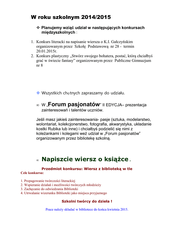W roku szkolnym 2014/2015 Planujemy wziąć udział w następujących konkursach międzyszkolnych : 1. Konkurs literacki na napisanie wiersza o K.I. Gałczyńskim organizowanym przez Szkołę Podstawową nr 28 - termin 20.01.2015r. 2. Konkurs plastyczny „Stwórz swojego bohatera, postać, którą chciałbyś grać w świecie fantasy” organizowanym przez Publiczne Gimnazjum nr 8 Wszystkich chętnych zapraszamy do udziału. • W „Forum pasjonatów” II EDYCJA– prezentacja zainteresowań i talentów uczniów. Jeśli masz jakieś zainteresowania- pasje (sztuka, modelarstwo, wolontariat, kolekcjonerstwo, fotografia, akwarystyka, układanie kostki Rubika lub inne) i chciałbyś podzielić się nimi z koleżankami i kolegami weź udział w „Forum pasjonatów” organizowanym przez bibliotekę szkolną. • Napiszcie wiersz o książce . Przedmiot konkursu: Wiersz z biblioteką w tle Cele konkursu: 1. Propagowanie twórczości literackiej 2. Wspieranie działań i możliwości twórczych młodzieży 3. Zachęcanie do odwiedzania Biblioteki 4. Utrwalanie wizerunku Biblioteki jako miejsca przyjaznego Szkolni twórcy do dzieła ! Prace należy składać w bibliotece do końca kwietnia 2015. Przykład wiersza : W naszej szkolnej bibliotece Dużo rzeczy się dowiecie. Z pięknych książek historycznych, biologicznych i chemicznych. Można też poczytać czasem Kurier Poranny albo kolorową prasę. Mamy też dwie bibliotekarki, One chodzą jak zegarki. Mają swoje komputerki, Może grają na nich w gierki? Pierwsza to pani Ewa Co opieprzy dzieci jak trzeba, Chodzi jak dama, Pięknie ubrana i uczesana. Druga to pani Jagoda Ona jest jak dobra pogoda. U niej na twarzy uśmiech gości, Każdemu pomoże i doradzi, Kiedy ktoś z książką sobie nie radzi. Wszystkich zapraszam do naszej biblioteki Gdzie piękne książki czekają na dzieci. Pani Renata Kamińska • Książka w obiektywie Zapraszamy do udziału w konkursie fotograficznym " Książka w obiektywie ". Kryteria oceny prac: ocenie podlega m.in. kompozycja, pomysłowość, wyjątkowość nadesłanych fotografii; Konkurs jest otwarty i każdy może w nim wziąć udział. Każdy z uczestników zgłasza maksymalnie 3 fotografie. Prace należy składać w bibliotece do końca kwietnia 2015. Prace należy dostarczyć także w wersji elektronicznej Przykłady fotografii : Książki Mistrzów FOTOGRAFII Ogłaszamy konkurs z nagrodami na „Najlepszego Czytelnika PG3” w b.r. 2014/2015
