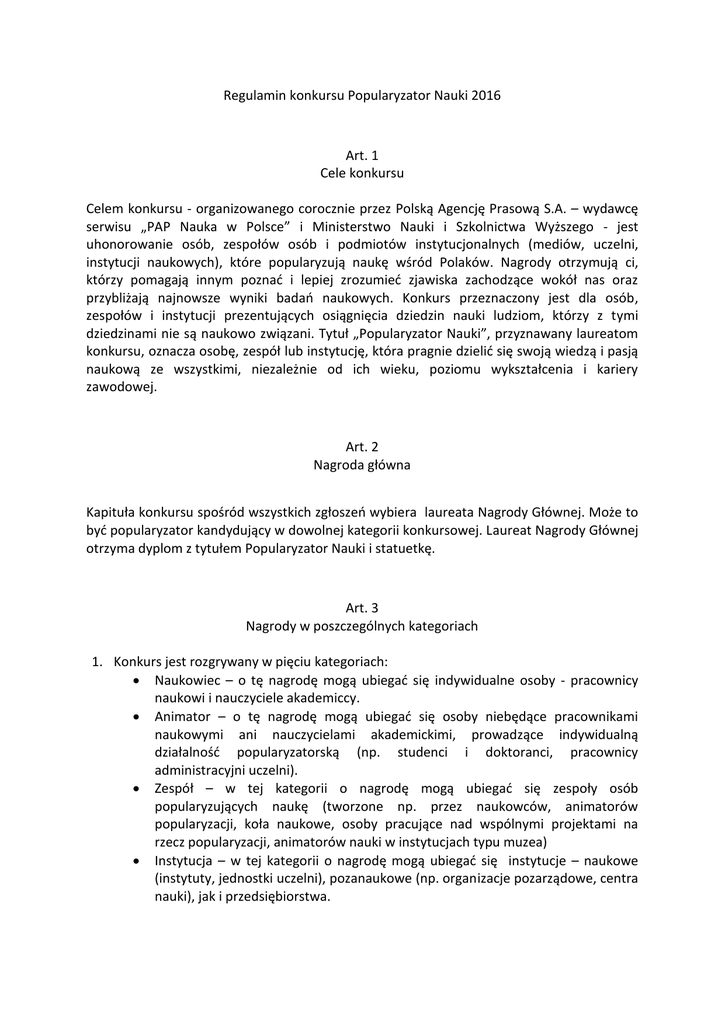 Regulamin konkursu Popularyzator Nauki 2016 Art. 1 Cele konkursu Celem konkursu - organizowanego corocznie przez Polską Agencję Prasową S.A. – wydawcę serwisu „PAP Nauka w Polsce” i Ministerstwo Nauki i Szkolnictwa Wyższego - jest uhonorowanie osób, zespołów osób i podmiotów instytucjonalnych (mediów, uczelni, instytucji naukowych), które popularyzują naukę wśród Polaków. Nagrody otrzymują ci, którzy pomagają innym poznać i lepiej zrozumieć zjawiska zachodzące wokół nas oraz przybliżają najnowsze wyniki badań naukowych. Konkurs przeznaczony jest dla osób, zespołów i instytucji prezentujących osiągnięcia dziedzin nauki ludziom, którzy z tymi dziedzinami nie są naukowo związani. Tytuł „Popularyzator Nauki”, przyznawany laureatom konkursu, oznacza osobę, zespół lub instytucję, która pragnie dzielić się swoją wiedzą i pasją naukową ze wszystkimi, niezależnie od ich wieku, poziomu wykształcenia i kariery zawodowej. Art. 2 Nagroda główna Kapituła konkursu spośród wszystkich zgłoszeń wybiera laureata Nagrody Głównej. Może to być popularyzator kandydujący w dowolnej kategorii konkursowej. Laureat Nagrody Głównej otrzyma dyplom z tytułem Popularyzator Nauki i statuetkę. Art. 3 Nagrody w poszczególnych kategoriach 1. Konkurs jest rozgrywany w pięciu kategoriach: Naukowiec – o tę nagrodę mogą ubiegać się indywidualne osoby - pracownicy naukowi i nauczyciele akademiccy. Animator – o tę nagrodę mogą ubiegać się osoby niebędące pracownikami naukowymi ani nauczycielami akademickimi, prowadzące indywidualną działalność popularyzatorską (np. studenci i doktoranci, pracownicy administracyjni uczelni). Zespół – w tej kategorii o nagrodę mogą ubiegać się zespoły osób popularyzujących naukę (tworzone np. przez naukowców, animatorów popularyzacji, koła naukowe, osoby pracujące nad wspólnymi projektami na rzecz popularyzacji, animatorów nauki w instytucjach typu muzea) Instytucja – w tej kategorii o nagrodę mogą ubiegać się instytucje – naukowe (instytuty, jednostki uczelni), pozanaukowe (np. organizacje pozarządowe, centra nauki), jak i przedsiębiorstwa. Media – w tej kategorii o nagrodę mogą ubiegać się indywidualni dziennikarze, zespoły redakcyjne mediów, blogerzy czy zespoły tworzące strony internetowe. 2. Laureaci nagród w kategoriach konkursowych otrzymają dyplomy z tytułem Popularyzator Nauki i statuetki. 3. Kapituła ma prawo dodatkowo przyznać w konkursie wyróżnienia. Art. 3 Zgłoszenia 1. Z zastrzeżeniem ust. 6 (poniżej), zgłoszeń na konkurs mogą dokonywać wyłącznie osoby/instytucje zainteresowane, osobiście. 2. Za zgodą i wiedzą kandydatów, mogą być oni także zgłaszani przez osoby trzecie. W takim wypadku ich udział w konkursie uzależniony jest od spełnienia dodatkowych wymogów opisanych w ust. 6 (poniżej). Zgłoszenia należy składać w formie elektronicznego formularza, dostępnego na stronie internetowej serwisu PAP Nauka w Polsce pod adresem http://www.pap.pl/popularyzator-nauki/ 3. Do zgłoszenia można dołączyć maksymalnie cztery pliki (życiorys zawodowy, zdjęcia lub wideo ilustrujące działalność popularyzatorską, przykładową publikację). 4. Łączna objętość załączników nie może przekraczać 10 MB. 5. Zgłoszenia przyjmowane są do 16 października 2016 r. Formularz dostępny jest pod adresem http://www.pap.pl/popularyzator-nauki/ 6. Wypełnienie i przesłanie formularza przez zainteresowaną osobę fizyczną jest równoznaczne z wyrażeniem przez nią zgody na przetwarzanie przez PAP S.A. z siedzibą w Warszawie, przy ulicy Brackiej 6/8, jej danych w celu przeprowadzenia konkursu, wyłonienia jego zwycięzców, ogłoszenia wyników i doręczenia nagród zwycięzcom, zgodnie z ustawą z dnia 29.08.1997 o ochronie danych osobowych (tekst jednolity Dz.U. nr 101 z 2002 r., poz. 926, z pózn.zm.). 7. W przypadku opisanym w ust. 2 zgłaszający obowiązany jest dostarczyć do PAP S.A. wraz z kompletem dokumentów pisemnej zgody kandydata do udziału w Konkursie, a w przypadku kandydata będącego osobą fizyczną, także pisemnej zgody kandydata na przetwarzanie jego danych osobowych w zakresie opisanym w ust. 6 powyżej. Wzór zgody należy pobrać ze strony http://naukawpolsce.pap.pl/Data/Files/_public/zgoda_2016.pdf Art. 4 Przebieg konkursu 1. Do konkursu przyjmowane będą wyłącznie zgłoszenia nadesłane w terminie i spełniające wszystkie warunki zawarte w niniejszym regulaminie. 2. Do konkursu nie będą przyjmowane zgłoszenia laureatów poprzednich edycji konkursu Popularyzator Nauki (osoby, instytucje, media lub zespoły z tytułem Popularyzator Nauki). 3. Informacja o odrzuceniu kandydatury zostanie przesłana do zgłaszającego pocztą elektroniczną wraz z uzasadnieniem. 4. Przyjęte kandydatury oceni kapituła, złożona z przedstawicieli Ministerstwa Nauki i Szkolnictwa Wyższego, Polskiej Agencji Prasowej S.A., przedstawicieli środowiska naukowego oraz popularyzatorów nauki. 5. W pierwszym etapie konkursu spośród przyjętych kandydatur kapituła wyłoni maksymalnie trzy nominowane do nagrody lub wyróżnienia w każdej kategorii. 6. Sylwetki nominowanych zostaną zaprezentowane na stronie serwisu Nauka w Polsce PAP. 7. W finale kapituła wyłoni spośród nominowanych zwycięzców w poszczególnych kategoriach. 8. Laureaci zostaną telefonicznie powiadomieni o wyborze. 9. Nagrody zostaną wręczone na uroczystej Gali w Warszawie. 10. Kapituła zastrzega sobie prawo do nieprzyznania nagrody w niektórych kategoriach.