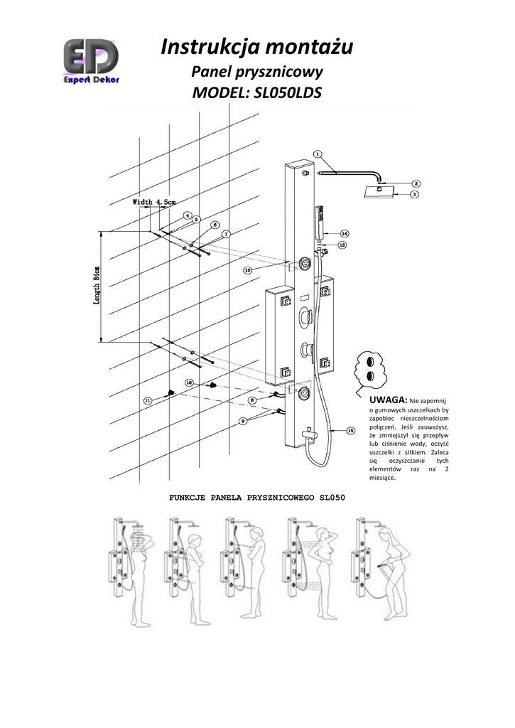 Instrukcja montażu Panel prysznicowy MODEL: SL050LDS UWAGA: Nie zapomnij o gumowych uszczelkach by zapobiec nieszczelnościom połączeń. Jeśli zauważysz, że zmniejszył się przepływ lub ciśnienie wody, oczyść uszczelki z sitkiem. Zaleca się oczyszczanie tych elementów raz na 2 miesiące. FUNKCJE PANELA PRYSZNICOWEGO SL050 ---------------------------------------------------------------------------------------------------------------------------------------------Przed zakończeniem montażu proszę upewnić się, że żaden z wężyków nie jest zagięty ani skręcony. Należy również skontrolować szczelność oraz sprawdzić czy przepływ wody jest prawidłowy. ---------------------------------------------------------------------------------------------------------------------------------------------Prosimy o zapoznanie się ze schematem technicznym aby właściwie zainstalować swój panel prysznicowy. Możesz dopasować pionowe położenie panelu do własnych wymogów. Wymiary podane na schemacie technicznym zostały dostosowane do osoby o średnim wzroście. Montaż ścienny 1. Ramię prysznica (1) przykręć (12) do kolumny. 2. Umieść gumową podkładkę (2) w nakrętce deszczownicy (3) i połącz z chromowanym ramieniem (1). 3. Wybierz właściwe umiejscowienie dla kolumny i zaznacz miejsca nawierceń otworów Ø7 mm (4). Wywierć otwory w odległości 45mm od siebie. Wywierć otwory tak, aby odległość pomiędzy górnymi i dolnymi otworami wynosiła 840mm. 4. Umieść kołki rozporowe (5) w wywierconych otworach. 5. Dokręć do ściany śruby (7) z podkładkami ze stali nierdzewnej (6). Pozostaw główki śrub 5mm od ściany. 6. Umieść uszczelki z sitkiem (8,9) w elastycznych wężach dopływu wody gorącej (18) i zimnej (19). 7. Połącz elastyczne węże dopływu wody gorącej (8) i zimnej (9) z odpowiednimi odpływami gorącej (10) i zimnej (11) wody. 8. Zawieś obudowę kolumny (12). Wewnątrz zamocowane są specjalne wsporniki ze szczelinami, które nasuwa się na przykręcone śruby (7) 9. Umieść gumową uszczelkę (13) w nakrętce i przyłącz wąż (15) do prysznica ręcznego (słuchawki) (14). 10. Umieść prysznic ręczny (słuchawkę) (14) w uchwycie. Zestaw zawiera: 1. 2. 3. 4. 5. 6. Panel natryskowy 1 szt. Słuchawka ręczna 1 szt Przewód natryskowy do słuchawki ręcznej 1 szt. Deszczownica 1szt. Kolumna (ramię) do deszczownicy 1 szt. Zestaw montażowy: kołki, wkręty, uszczelki DOMitp.pl