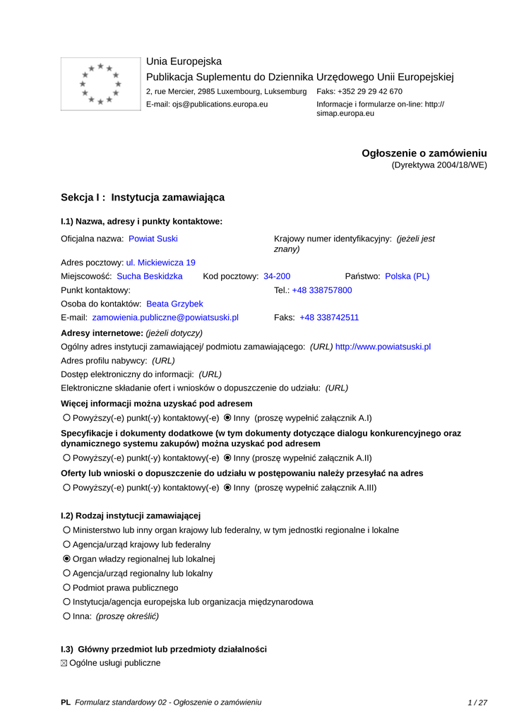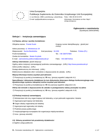 Unia Europejska Publikacja Suplementu do Dziennika Urzędowego Unii Europejskiej 2, rue Mercier, 2985 Luxembourg, Luksemburg Faks: +352 29 29 42 670 E-mail: [email protected] Informacje i formularze on-line: http:// simap.europa.eu Ogłoszenie o zamówieniu (Dyrektywa 2004/18/WE) Sekcja I : Instytucja zamawiająca I.1) Nazwa, adresy i punkty kontaktowe: Krajowy numer identyfikacyjny: (jeżeli jest znany) _____ Oficjalna nazwa: Powiat Suski Adres pocztowy: ul. Mickiewicza 19 Miejscowość: Sucha Beskidzka Kod pocztowy: 34-200 Punkt kontaktowy: _____ Państwo: Polska (PL) Tel.: +48 338757800 Osoba do kontaktów: Beata Grzybek E-mail: [email protected] Faks: +48 338742511 Adresy internetowe: (jeżeli dotyczy) Ogólny adres instytucji zamawiającej/ podmiotu zamawiającego: (URL) http://www.powiatsuski.pl Adres profilu nabywcy: (URL) _____ Dostęp elektroniczny do informacji: (URL) _____ Elektroniczne składanie ofert i wniosków o dopuszczenie do udziału: (URL) _____ Więcej informacji można uzyskać pod adresem Powyższy(-e) punkt(-y) kontaktowy(-e) Inny (proszę wypełnić załącznik A.I) Specyfikacje i dokumenty dodatkowe (w tym dokumenty dotyczące dialogu konkurencyjnego oraz dynamicznego systemu zakupów) można uzyskać pod adresem Powyższy(-e) punkt(-y) kontaktowy(-e) Inny (proszę wypełnić załącznik A.II) Oferty lub wnioski o dopuszczenie do udziału w postępowaniu należy przesyłać na adres Powyższy(-e) punkt(-y) kontaktowy(-e) Inny (proszę wypełnić załącznik A.III) I.2) Rodzaj instytucji zamawiającej Ministerstwo lub inny organ krajowy lub federalny, w tym jednostki regionalne i lokalne Agencja/urząd krajowy lub federalny Organ władzy regionalnej lub lokalnej Agencja/urząd regionalny lub lokalny Podmiot prawa publicznego Instytucja/agencja europejska lub organizacja międzynarodowa Inna: (proszę określić) I.3) Główny przedmiot lub przedmioty działalności Ogólne usługi publiczne PL Formularz standardowy 02 - Ogłoszenie o zamówieniu 1 / 27 Obrona Porządek i bezpieczeństwo publiczne Środowisko Sprawy gospodarcze i finansowe Zdrowie Budownictwo i obiekty komunalne Ochrona socjalna Rekreacja, kultura i religia Edukacja Inny: (proszę określić) I.4) Udzielenie zamówienia w imieniu innych instytucji zamawiających Instytucja zamawiająca dokonuje zakupu w imieniu innych instytucji zamawiających: tak nie więcej informacji o tych instytucjach zamawiających można podać w załączniku A PL Formularz standardowy 02 - Ogłoszenie o zamówieniu 2 / 27 Sekcja II : Przedmiot zamówienia II.1) Opis : II.1.1) Nazwa nadana zamówieniu przez instytucję zamawiającą : Przedmiotem zamówienia są prace związane z zimowym utrzymaniem dróg powiatowych i mostów na terenie powiatu suskiego w sezonach zimowych 2016/2017 i 2017/2018 II.1.2) Rodzaj zamówienia oraz lokalizacja robót budowlanych, miejsce realizacji dostawy lub świadczenia usług : Wybrać wyłącznie jedną kategorię – roboty budowlane, dostawy lub usługi – która najbardziej odpowiada konkretnemu przedmiotowi zamówienia lub zakupu Roboty budowlane Wykonanie Zaprojektowanie i wykonanie Wykonanie, za pomocą dowolnych środków, obiektu budowlanego odpowiadającego wymogom określonym przez instytucję zamawiającą Dostawy Kupno Dzierżawa Najem Leasing Połączenie powyższych form Usługi Kategoria usług: nr: 16 Zob. kategorie usług w załączniku C1 Główne miejsce lub lokalizacja robót budowlanych, miejsce realizacji dostawy lub świadczenia usług : powiat suski Kod NUTS: II.1.3) Informacje na temat zamówienia publicznego, umowy ramowej lub dynamicznego systemu zakupów (DSZ): Ogłoszenie dotyczy zamówienia publicznego Ogłoszenie dotyczy zawarcia umowy ramowej Ogłoszenie dotyczy utworzenia dynamicznego systemu zakupów (DSZ) II.1.4) Informacje na temat umowy ramowej : (jeżeli dotyczy) Umowa ramowa z kilkoma wykonawcami Umowa ramowa z jednym wykonawcą Liczba : _____ albo (jeżeli dotyczy) liczba maksymalna : _____ uczestników planowanej umowy ramowej Czas trwania umowy ramowej Okres w latach : _____ albo w miesiącach : _____ Uzasadnienie dla umowy ramowej, której czas trwania przekracza okres czterech lat : _____ Szacunkowa całkowita wartość zakupów w całym okresie obowiązywania umowy ramowej (jeżeli dotyczy, proszę podać wyłącznie dane liczbowe) Szacunkowa wartość bez VAT : _____ Waluta : albo Zakres: między : _____ : i : _____ : Waluta : Częstotliwość oraz wartość zamówień, które zostaną udzielone : (jeżeli jest znana) PL Formularz standardowy 02 - Ogłoszenie o zamówieniu 3 / 27 _____ II.1.5) Krótki opis zamówienia lub zakupu : Przedmiotem zamówienia są prace związane z zimowym utrzymaniem dróg powiatowych i mostów na terenie powiatu suskiego w sezonach zimowych 2016/2017 i 2017/2018 Przedmiot zamówienia został podzielony na 8 części: a) Część nr 1: Prace związane z zimowym utrzymaniem dróg powiatowych i mostów na terenie Gminy Budzów w sezonach zimowych 2016/2017 i 2017/2018 b) Część nr 2: Prace związane z zimowym utrzymaniem dróg powiatowych i mostów na terenie Gminy Zembrzyce w sezonach zimowych 2016/2017 i 2017/2018 c) Część nr 3: Prace związane z zimowym utrzymaniem dróg powiatowych i mostów na terenie Miasta Sucha Beskidzka w sezonach zimowych 2016/2017 i 2017/2018 d) Część nr 4: Prace związane z zimowym utrzymaniem dróg powiatowych i mostów na terenie Gminy Stryszawa w sezonach zimowych 2016/2017 i 2017/2018; e) Część nr 5: Prace związane z zimowym utrzymaniem dróg powiatowych i mostów na terenie Gminy Zawoja w sezonach zimowych 2016/2017 i 2017/2018; f) Część nr 6: Prace związane z zimowym utrzymaniem dróg powiatowych i mostów na terenie Gminy BystraSidzina w sezonach zimowych 2016/2017 i 2017/2018; g) Część nr 7: Prace związane z zimowym utrzymaniem dróg powiatowych i mostów na terenie Miasta i Gminy Jordanów w sezonach zimowych 2016/2017 i 2017/2018; h) Część nr 8: Prace zwi