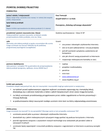 POMYSŁ DOBREJ PRAKTYKI FORMATKA autor/ szkoła / miejscowość Ewa Tomczyk Wpisz swoje imię i nazwisko oraz nazwę i nr szkoły (lub zespołu szkół), miejscowość Zespół Szkół nr 1 w Kole tytuł dobrej praktyki lead Poznajemy „Dekalog cyfrowego obywatela” Napisz krótkie wprowadzenie do dobrej praktyki (1-2 zdania) przedmiot/ poziom nauczania (ew. klasa) Godzina wychowawcza – klasa VI SP Podaj przedmiot i poziom nauczania, na którym została przeprowadzona dobra praktyka, oraz ew. klasę cele Sformułuj cele dobrej praktyki w języku zrozumiałym dla ucznia: Czego uczniowie się nauczą? Odwołaj się do podstawy programowej (wymagania szczegółowe) Uczeń: zna prawa i obowiązki użytkownika Internetu wie co to jest cyberprzemoc i zna jej przejawy potrafi wymienić symptomy uzależnienia od komputera wie jak chronić swoją prywatność w Internecie rozpoznaje niebezpieczne kontakty w sieci. pomoce dydaktyczne Laptop Jakie pomoce i narzędzia TIK są potrzebne do przeprowadzenia dobrej praktyki (programy, aplikacje, strony WWW itp.)? projektor multimedialny pendrive mini-test www.cyberprzemoc.pl www.heplline.org.pl krótki opis pomysłu Przedstaw zwięźle swój pomysł tak, aby inni nauczyciele i nauczycielki mogli go wykorzystać w swojej pracy na tydzień przed zaplanowanym zajęciem wybrani uczniowie zapoznają się z tematyką lekcji, dowiadują się o zakresie materiału a także z jakich bezpiecznych stron www mogą korzystać, na lekcji uczniowie przedstawiają przygotowane przez siebie zagadnienie w formie prezentacji i inicjują dyskusję w podsumowaniu lekcji nauczyciel rozdaje uczniom mini-test na który odpowiadają anonimowo. efekty pracy Czego uczniowie się nauczyli? Co się sprawdziło? Dlaczego warto w tym przypadku zastosować TIK? uczniowie poznali jakie są prawa i obowiązki użytkownika Internetu dowiedzieli się z jakimi niebezpiecznymi sytuacjami mogą spotkać się podczas korzystanie z Internetu poznali zagrożenia związane z używaniem nowych technologii oraz wskazówki jak poradzić sobie w sytuacjach trudnych uczniowie lepiej zapamiętali i zrozumieli problemy związane z zagrożeniami w Internecie za pomocą narzędzi TIK uwagi Jakie działania planujesz w przyszłości? Czy zamierzasz zmienić lub rozwinąć swój pomysł? Przed czym chcesz przestrzec naśladowców dobrej praktyki? W przyszłości zamierzam przybliżyć uczniom komputerowy słownik pojęć związany z bezpieczeństwem on-line. Są to określenia w języku angielskim które planuję wykorzystać na lekcjach w klasach IV i VI, gdyż uczę tego przedmiotu. załączniki Materiały przygotowane przez nauczyciela (np. karty pracy, krzyżówki, quizy) oraz strona WWW, na której znajduje się dobra praktyka (prace uczniów stworzone w jej ramach) prezentacja „Dekalog cyfrowego obywatela” mini-test „Czy jestem już uzależniony od komputera” film o cyberprzemocy (http://www.saferinternet.pl/images/stories/multimedia2009/cyberprzemoc//reportaz_cyberprzemoc.mpg) www.cyberprzemoc.pl